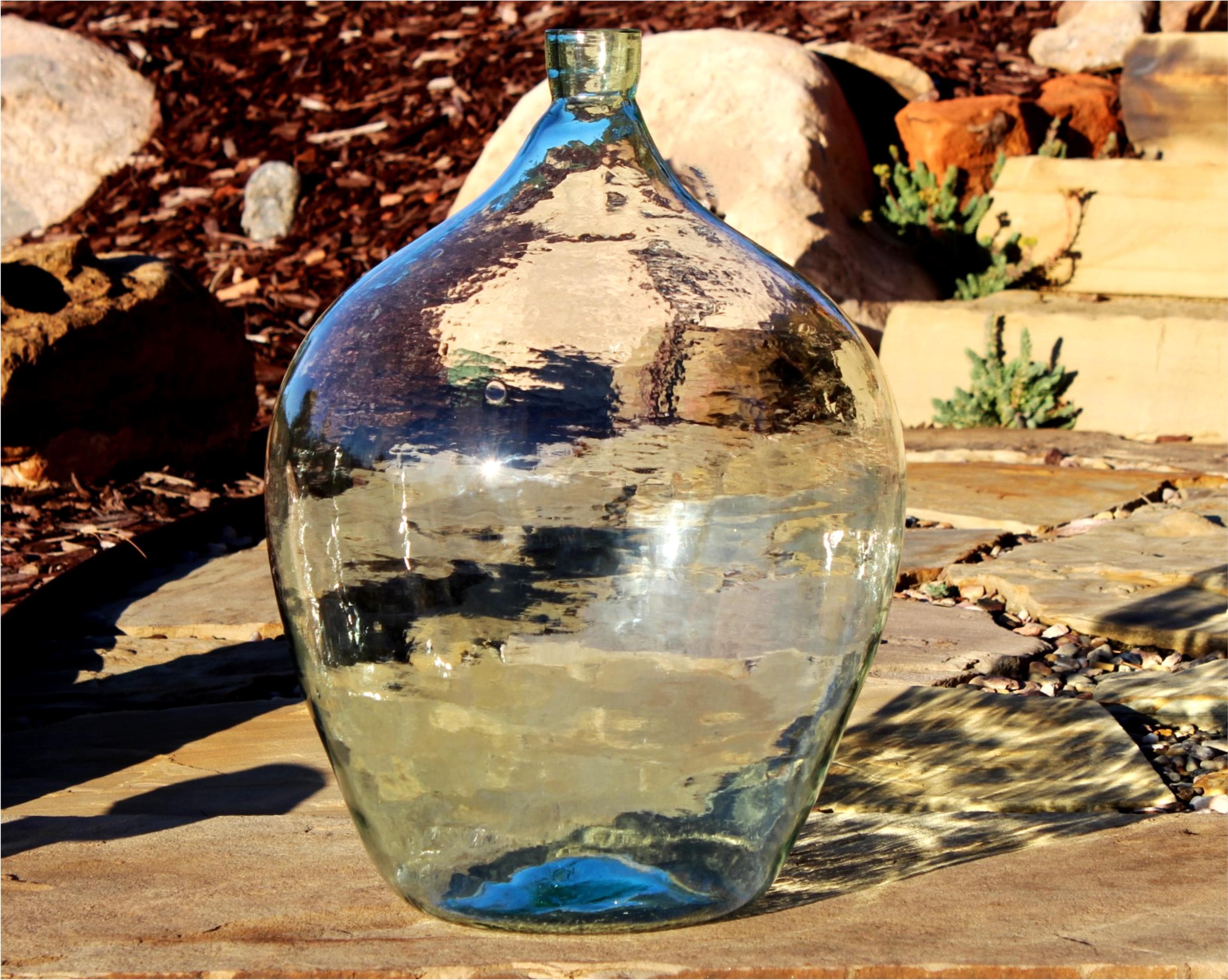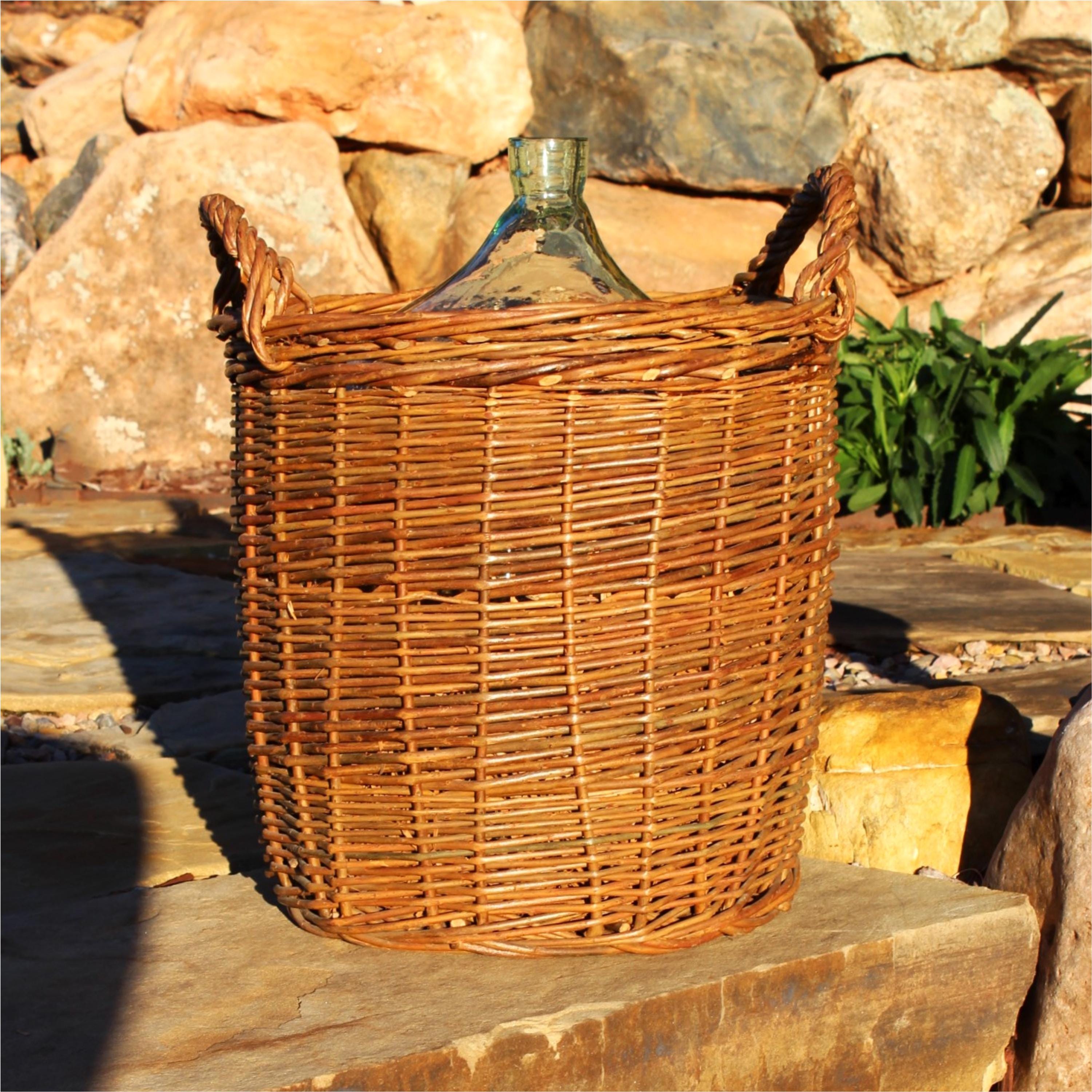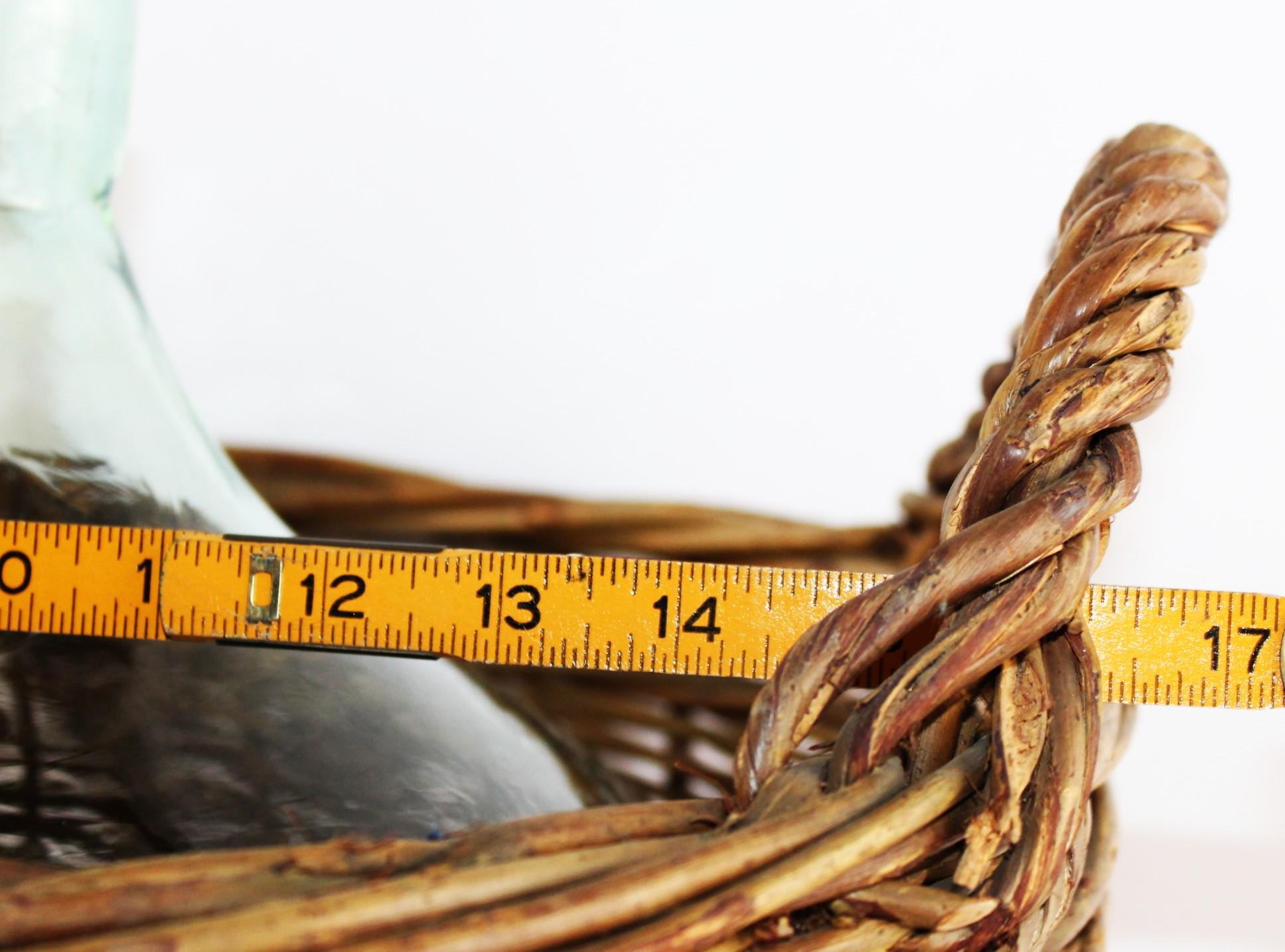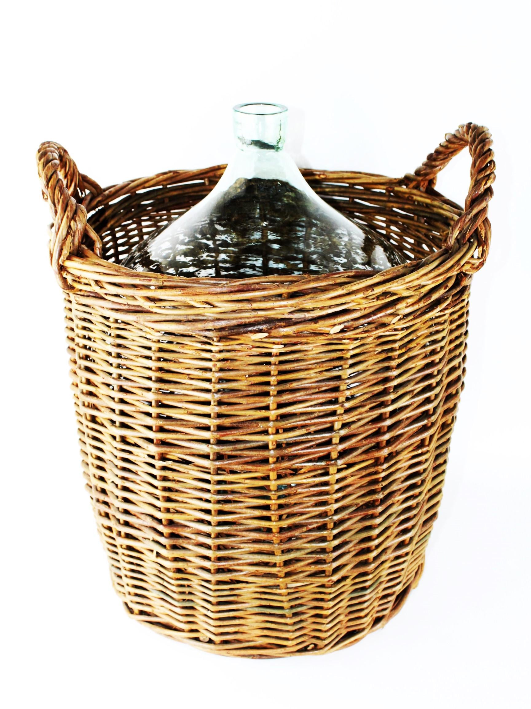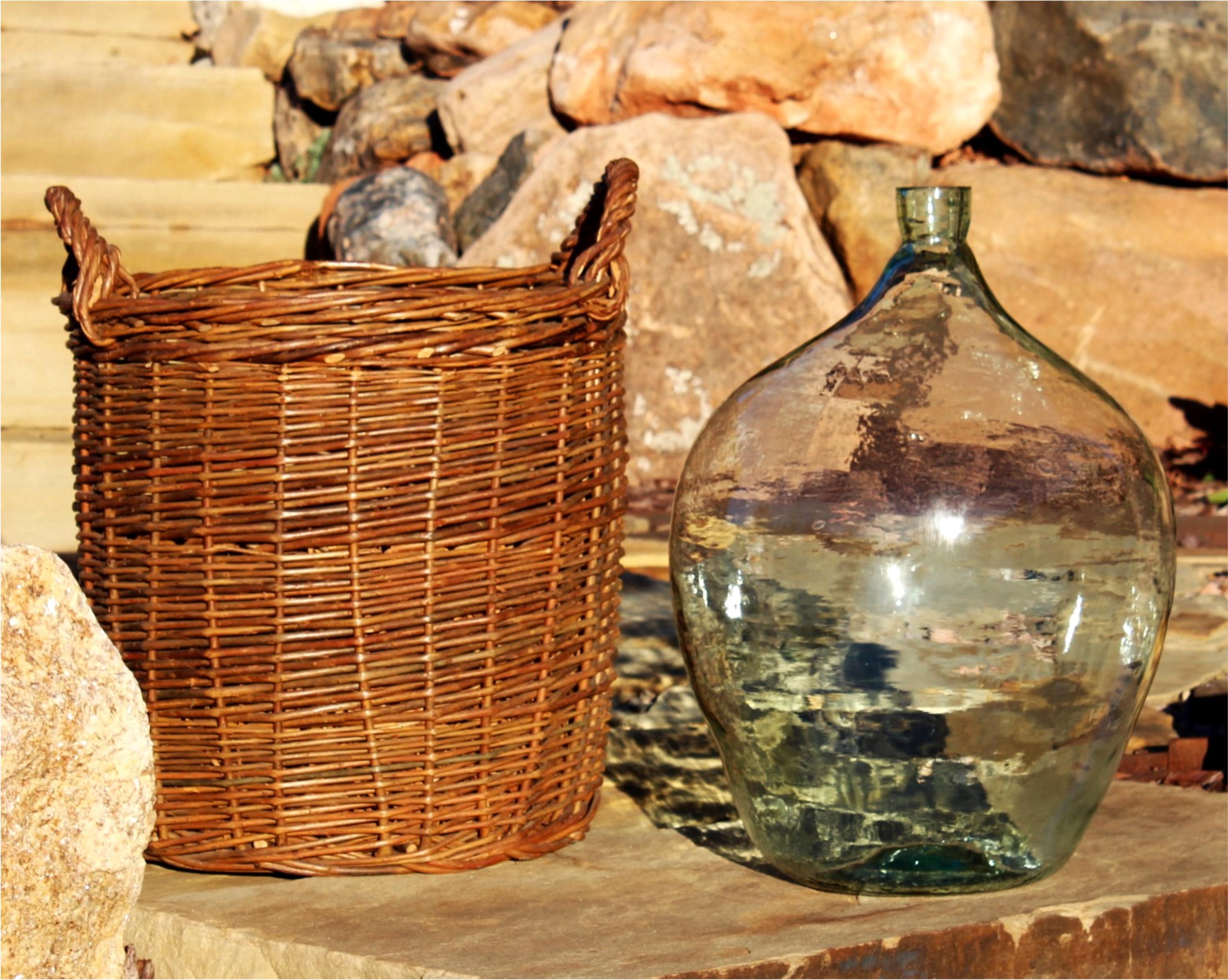 This beautiful Demijohn is utterly amazing, handpicked by a friend on her travels through Europe years ago. Standing 19” tall, and 17” diameter. The basket is hand woven from grapevine and filled with straw to nestle the amazing light green glass Demijohn safety. The basket is in wonderful condition, strong and sturdy, the hand-blown glass Demijohn is fantastic, the glass has wonderful air bubbles and lovely wavy lines.