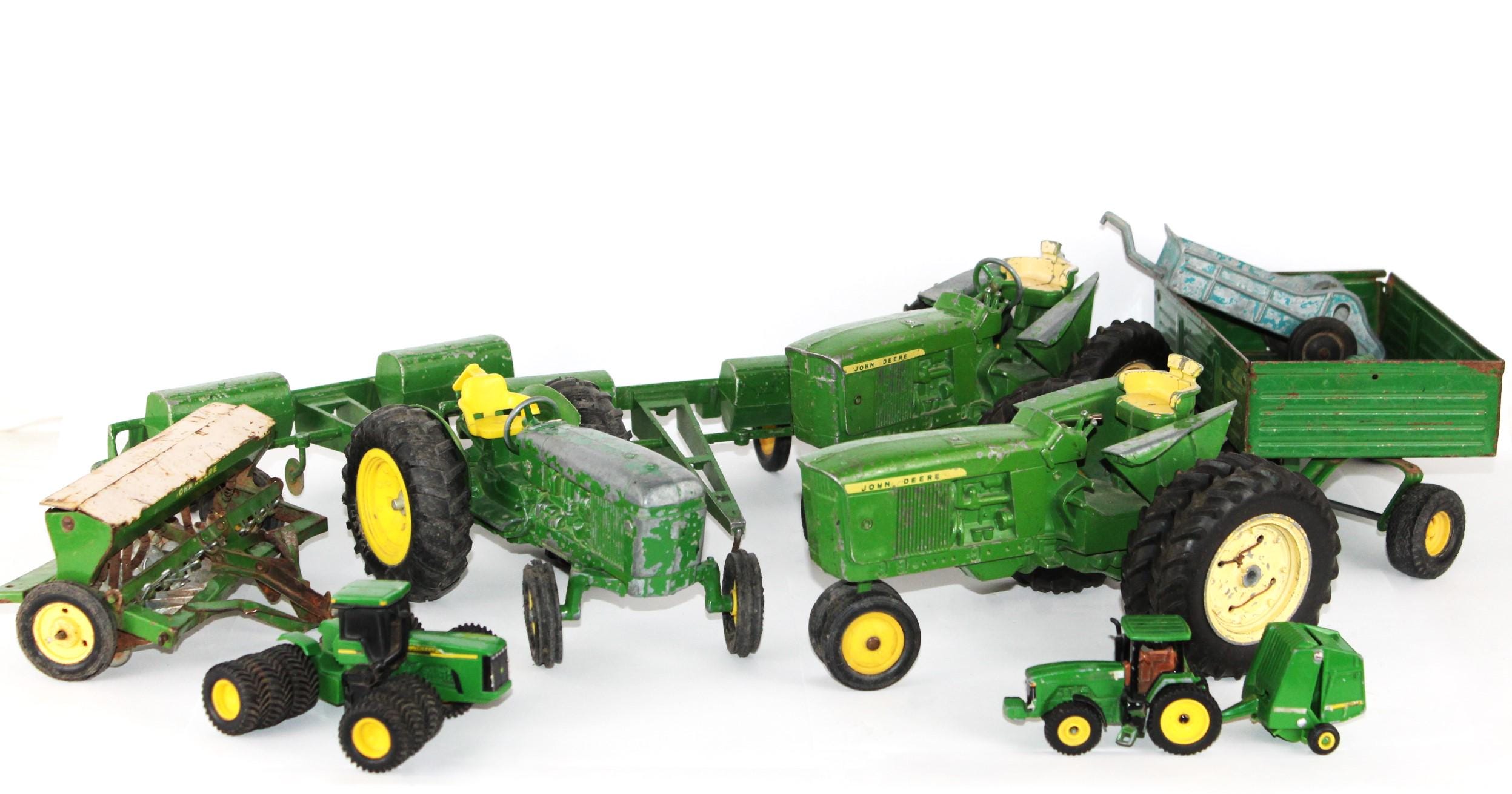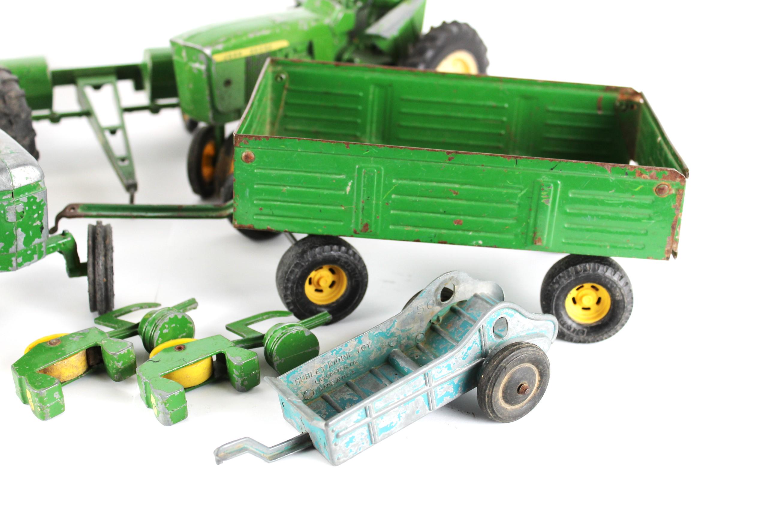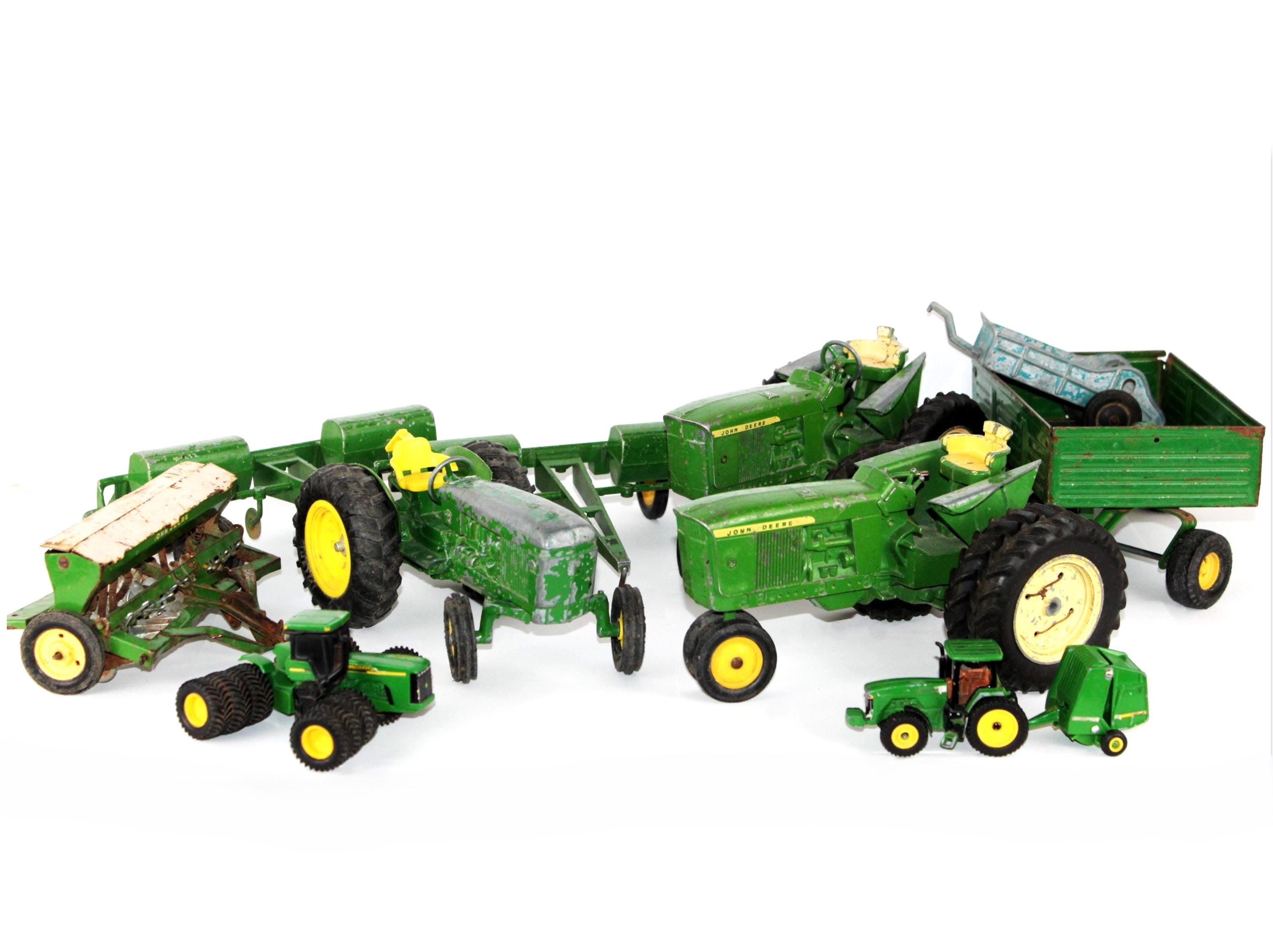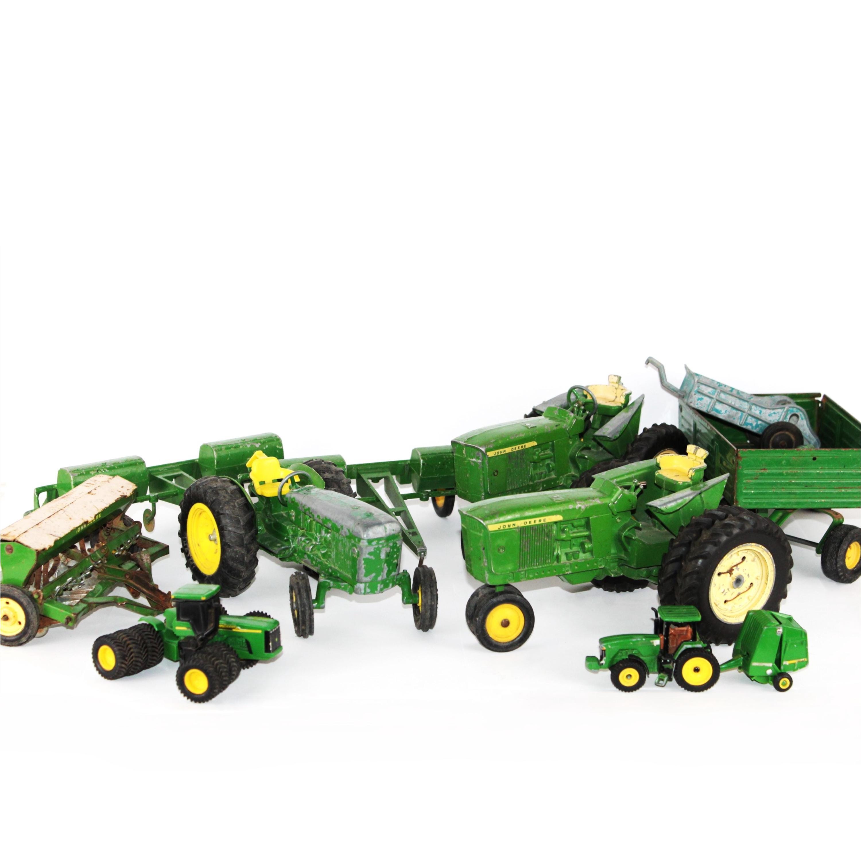 Classic collection of toy metal John Deere tractors and implements, made by Ertl toys. Five tractors, trailer, three seeders / drills, round bailer, manure spreader. These are very well used toys, sold as is.