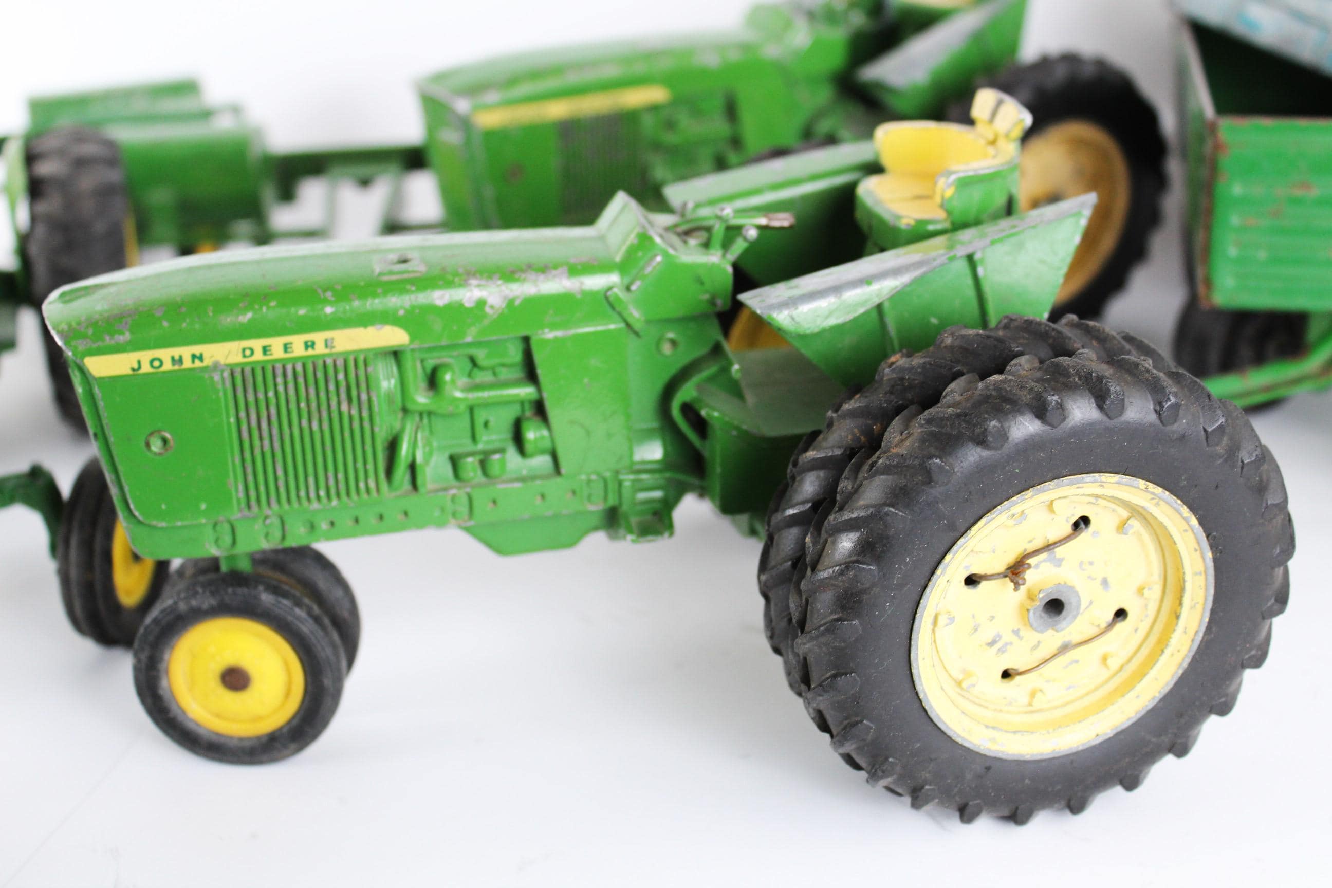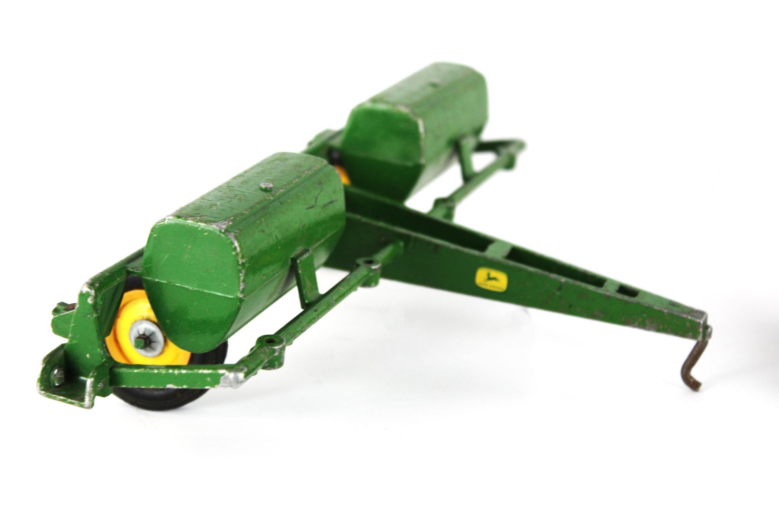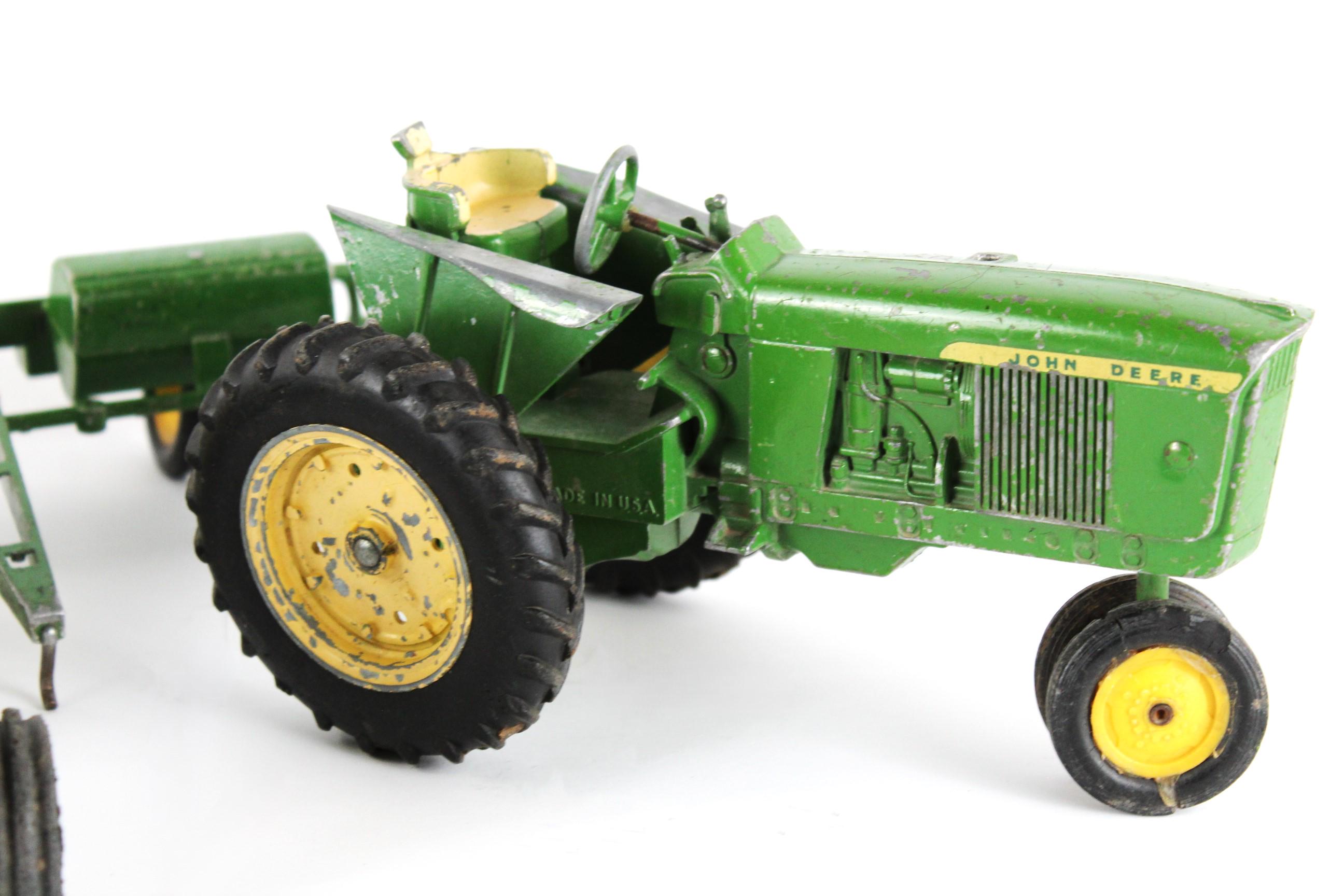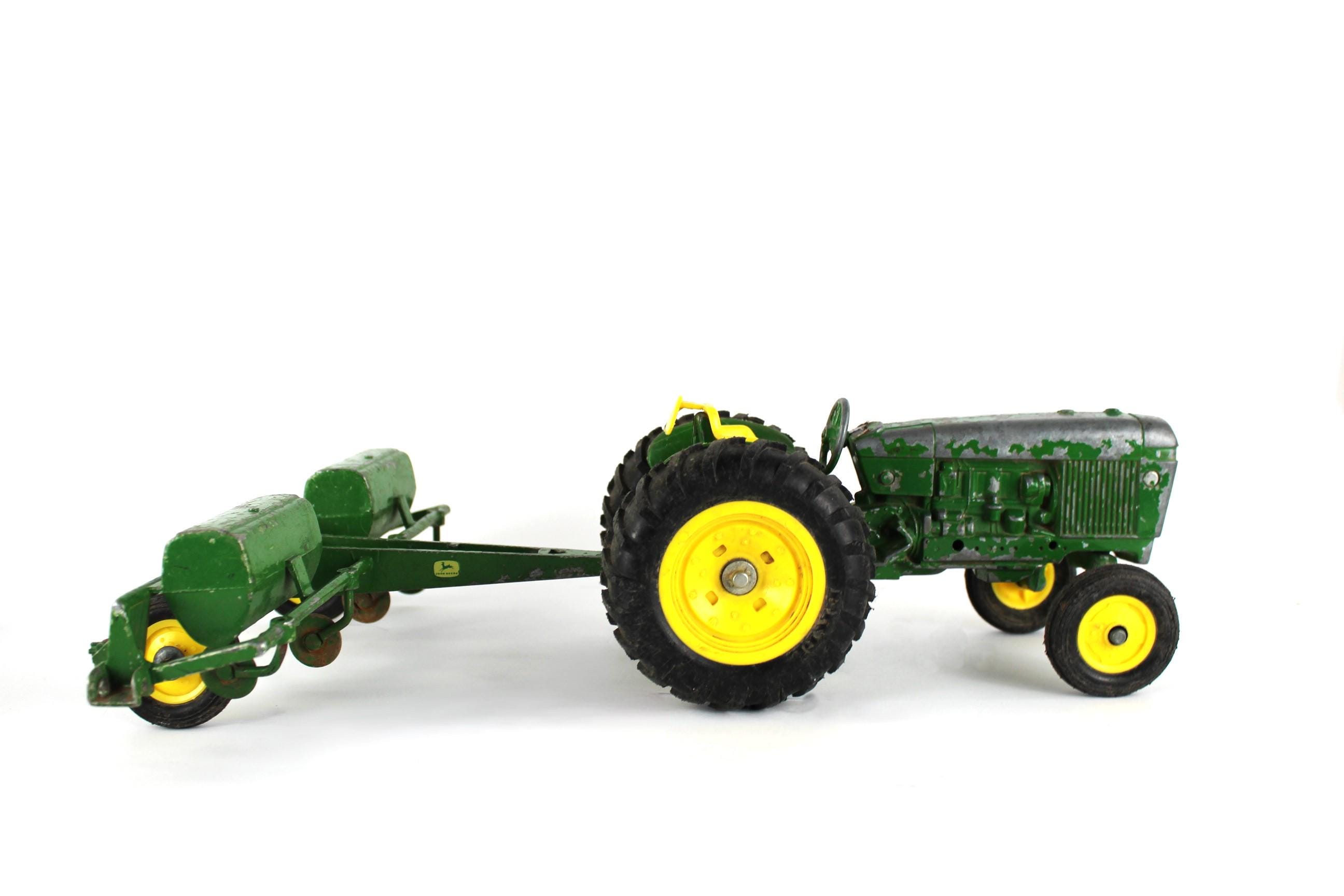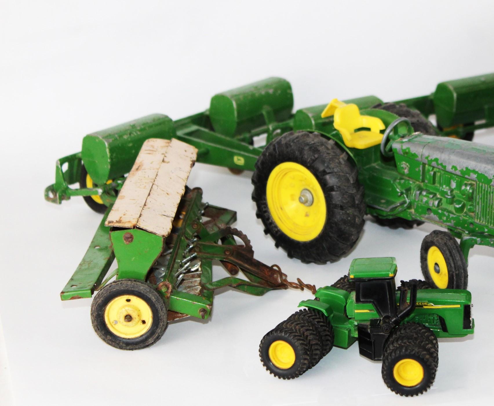 Classic collection of toy metal John Deere tractors and implements, made by Ertl toys. Five tractors, trailer, three seeders / drills, round bailer, manure spreader. These are very well used toys, sold as is.