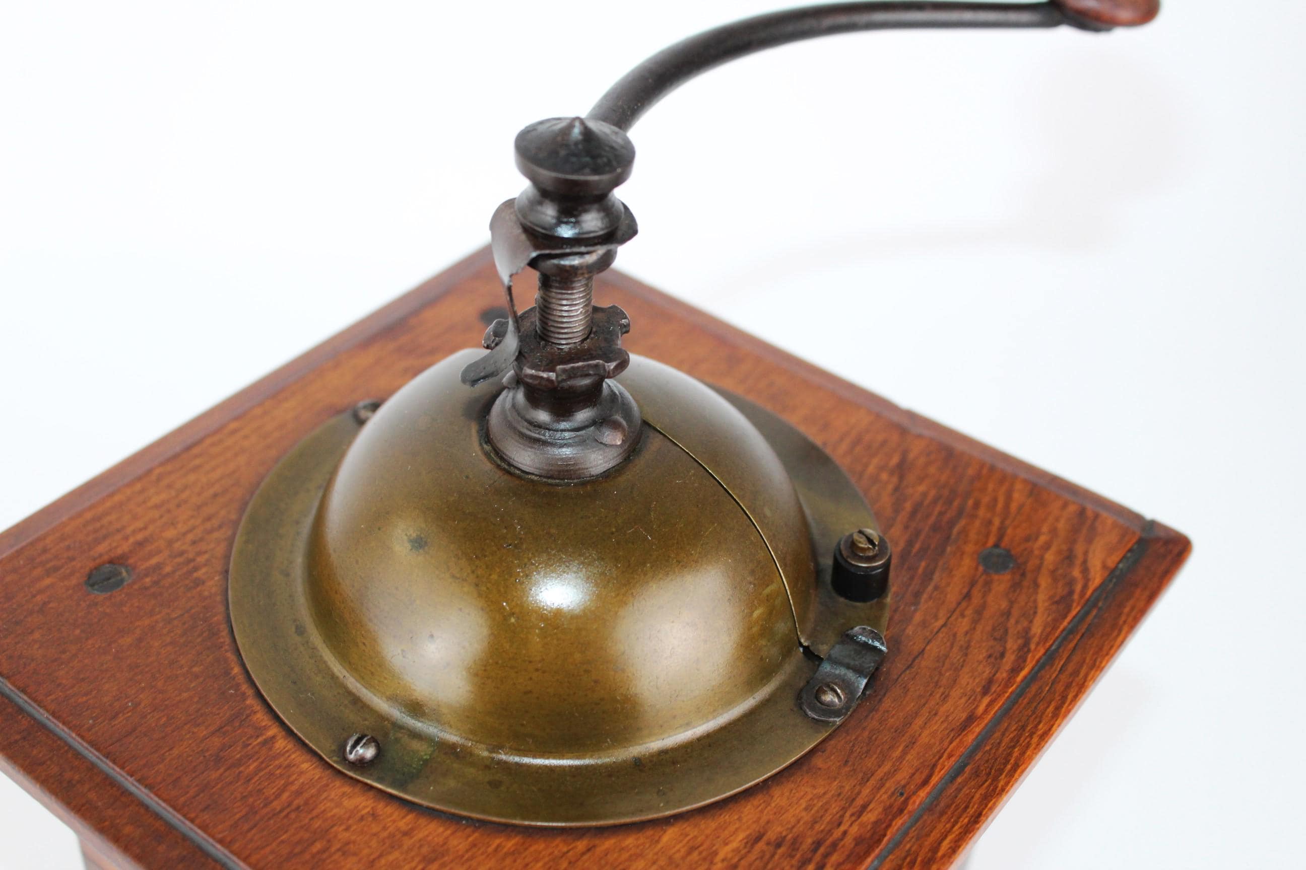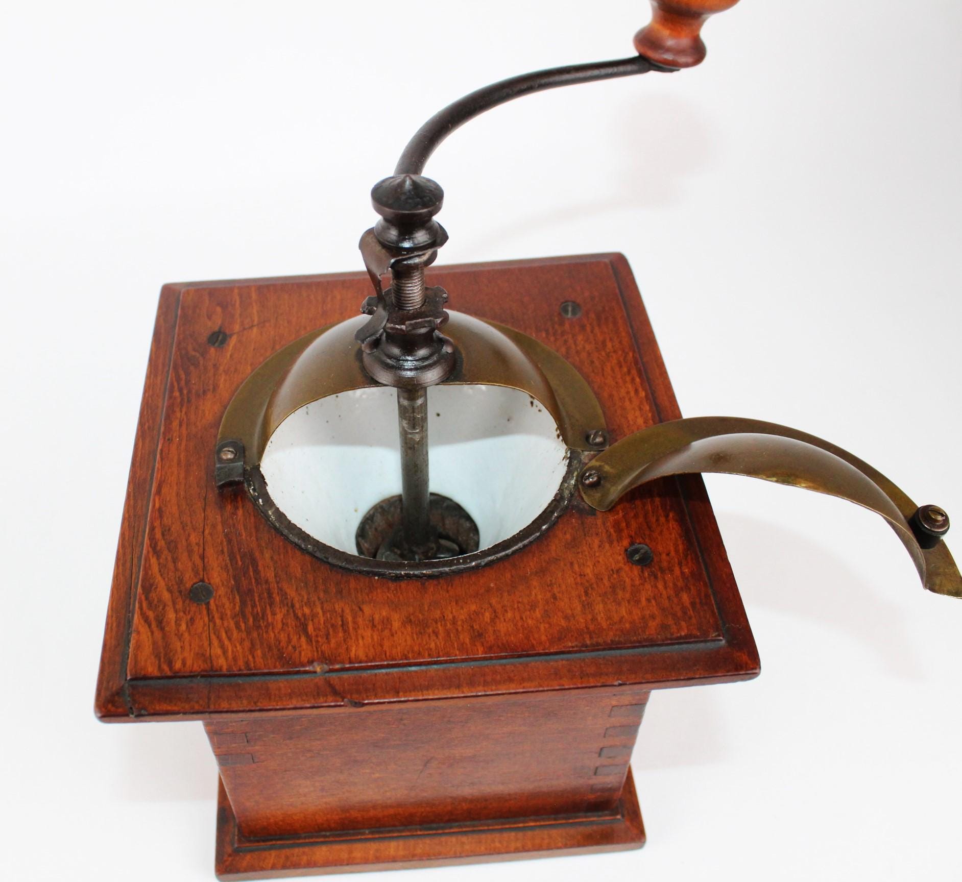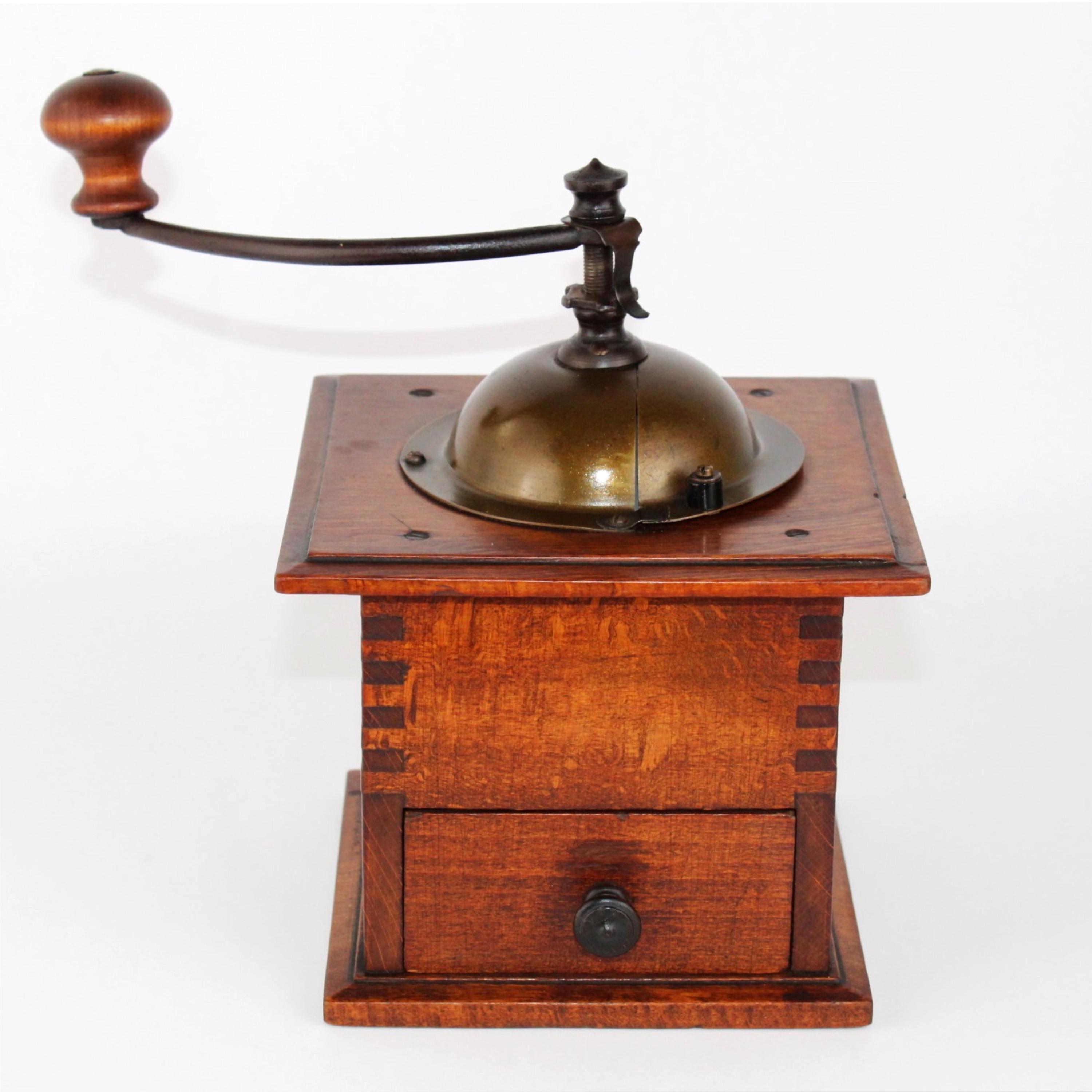 Wonderful mid-1800s box style coffee bean grinder. This is an old one Circa, 1850-70s, made of oak hardwood with dovetail corners with cast iron grinder and hopper with enamel coated hopper, a copper dome covers the grinder, dome has an outstanding patina which took years to acquire.