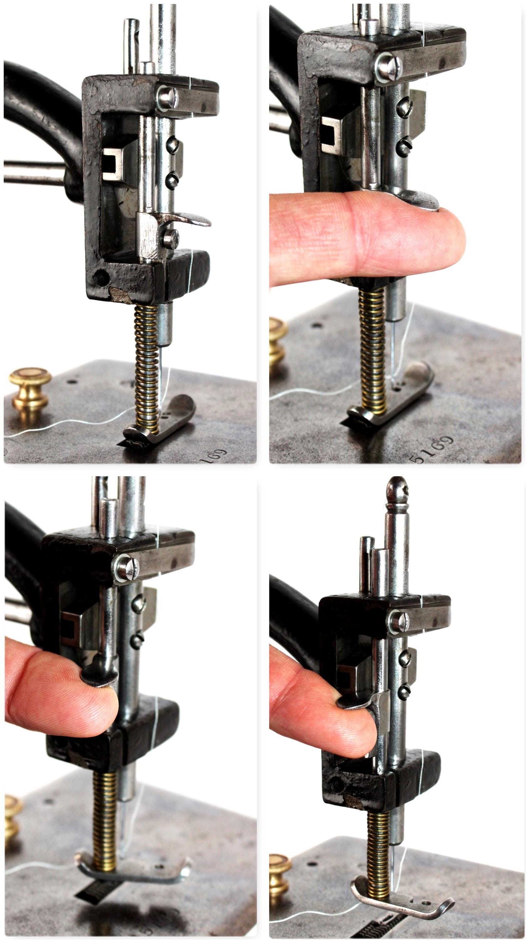 The machine is labeled on the base (S. Davis Co. London) the labeling is very worn and hard to read. It is made of cast iron and nickel-plated steel. The presser foot is unusual it lifts upward and pivots outward and locks in place. The sewing plate has serial number 65169.