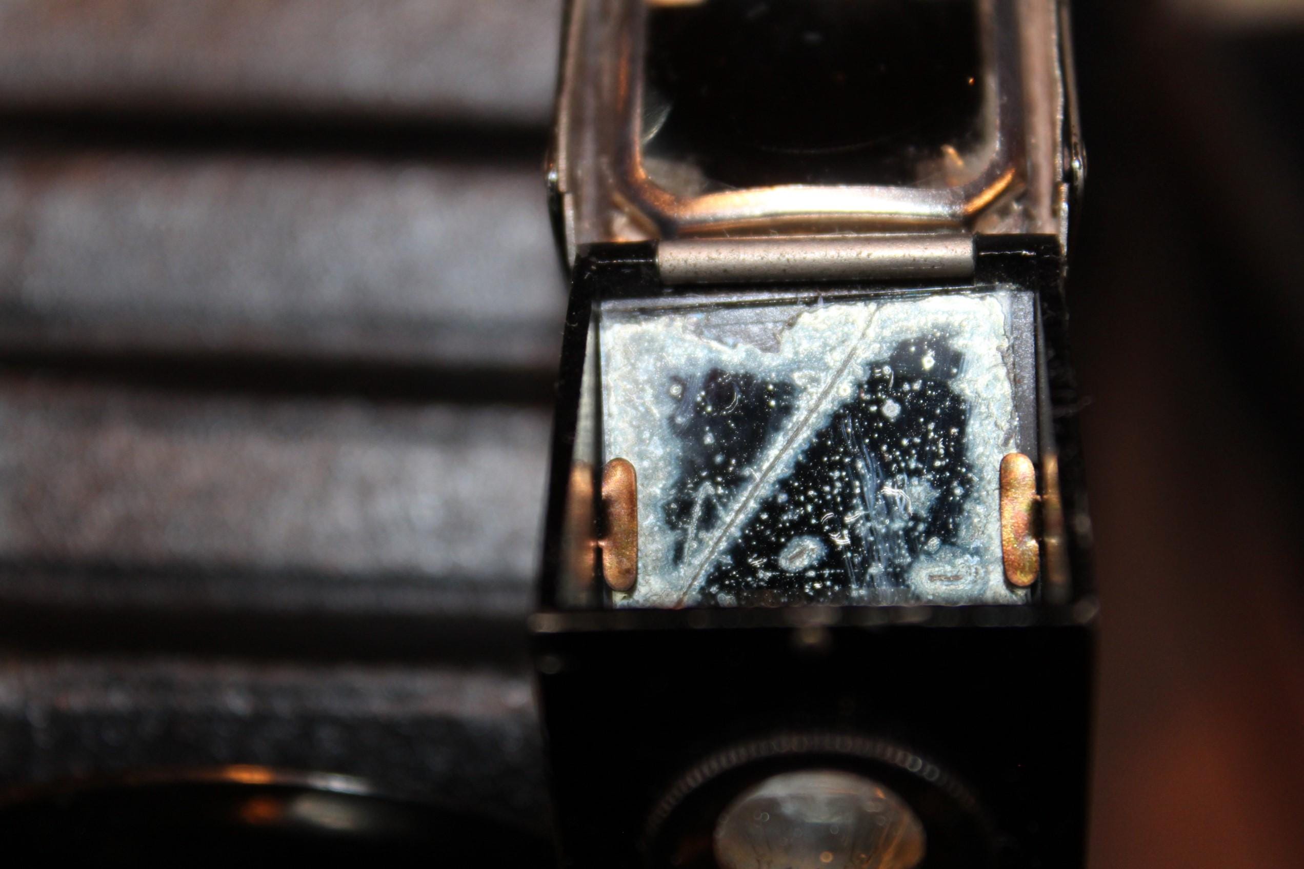 Condition: The camera is in good condition for its age. The leather stain finish is worn in places, and the handle is frail. The case is made of leather with a brass latch; the case is very solid, but the strap is frail. The leather on the case has tightened over the last 115 years, and the camera fits snugly. The reflector mirror inside the viewer is cracked. The camera is untested, although it appears to be in working order.