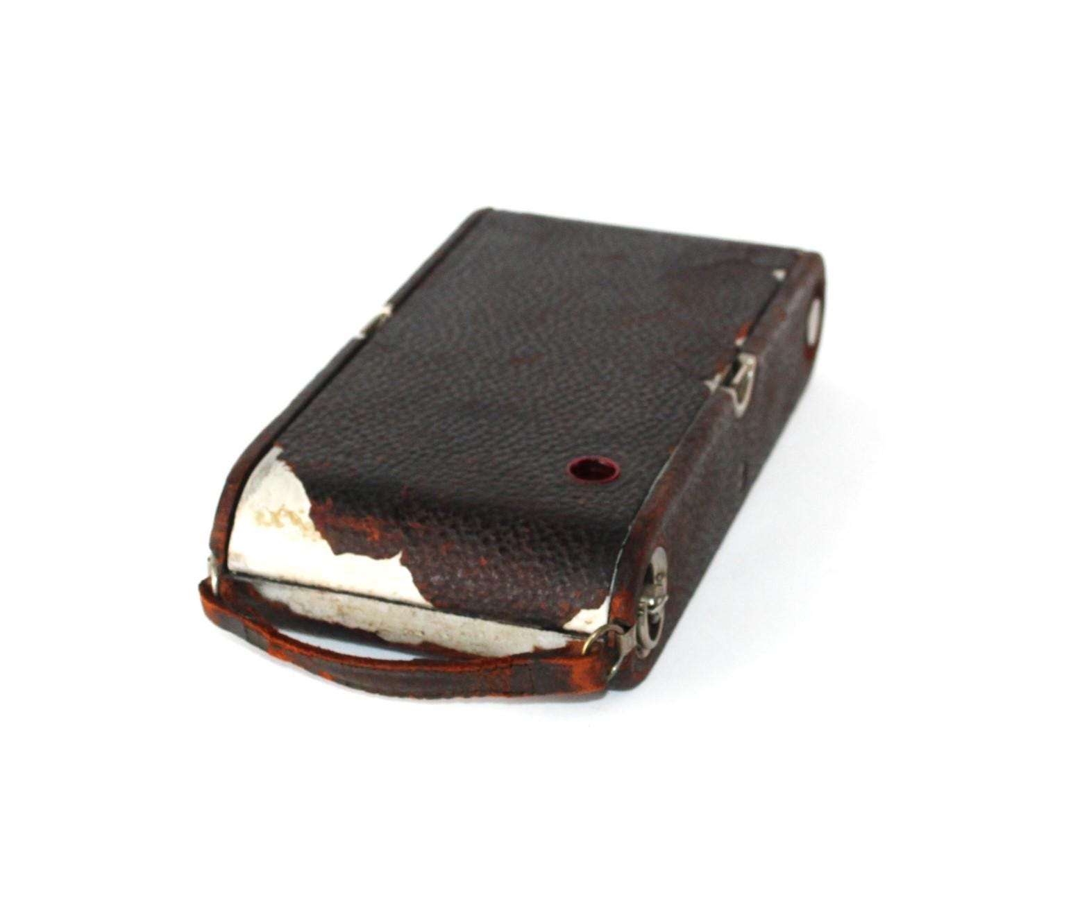 Camera is made of Leather covered metal frame with nickel-plated brass hardware and red leather bellows, and the teak wood inserts and with the original wood film spool. Selling as décor item.