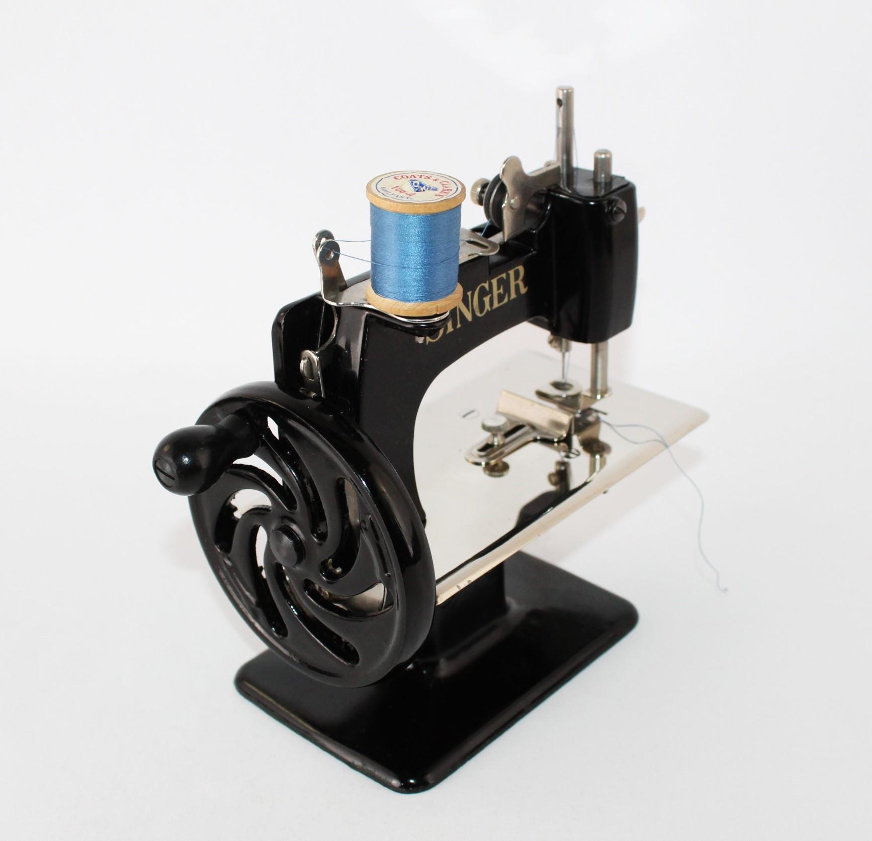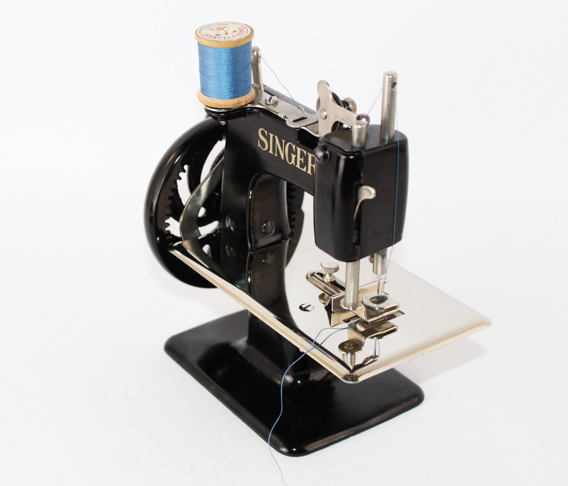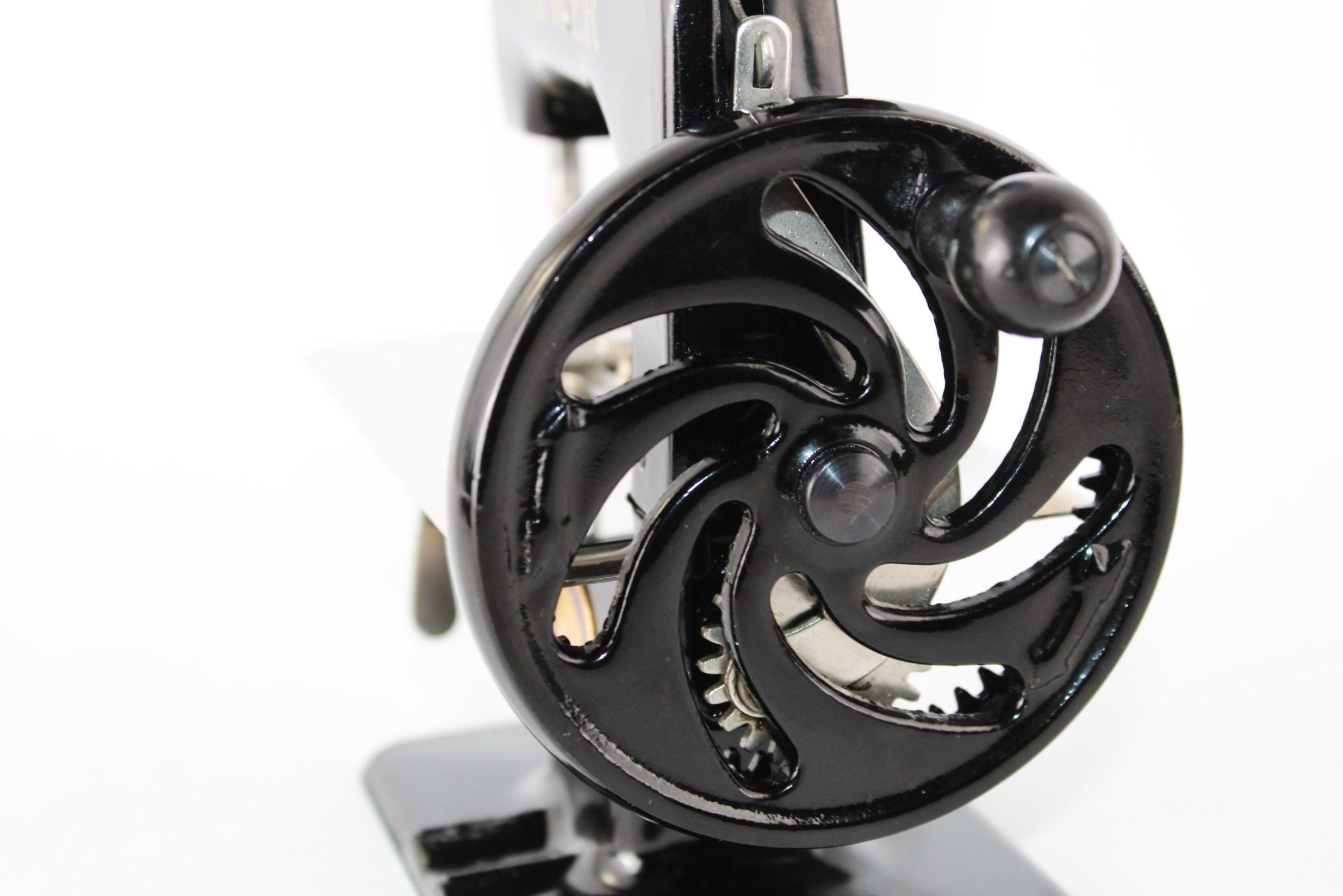 The Sewhandy is a fully Functional Hand Crank Sewing Machine in toy size and sews wonderfully. Originally patented in 1910 and manufactured until 1975, these were known as the most popular toy sewing machines ever made. This is the 1950s model which has a thicker base column although it still uses the same mechanics as its predecessor from 1910. This machine is a rare Centennial addition issued in 1951 in its beautiful classic deep gorgeous shiny Black finish. The thread running is simple on this machine with all the parts numbered 1 through 6 and down to the needle to thread this little machine. We have cleaned and tested the little machine and it sews wonderfully. It has only minor scuffs at the base of the machine. Uses a 24x1 needle.