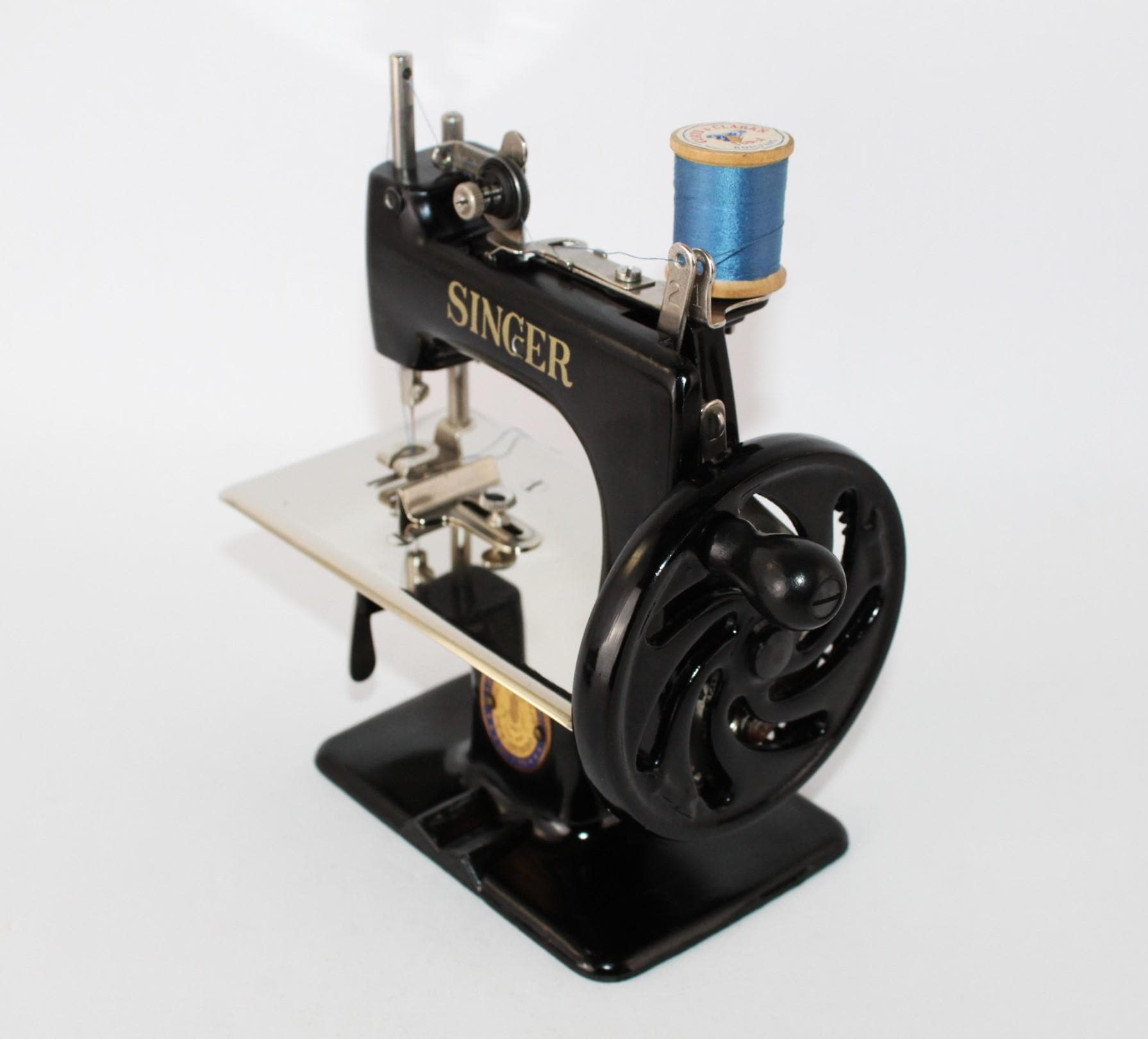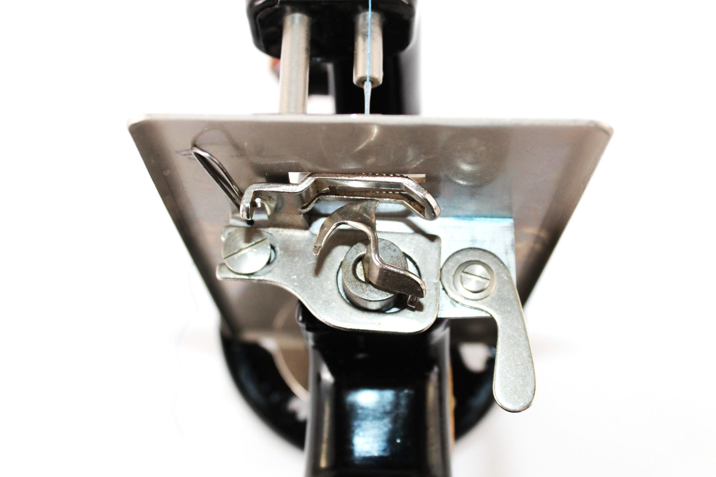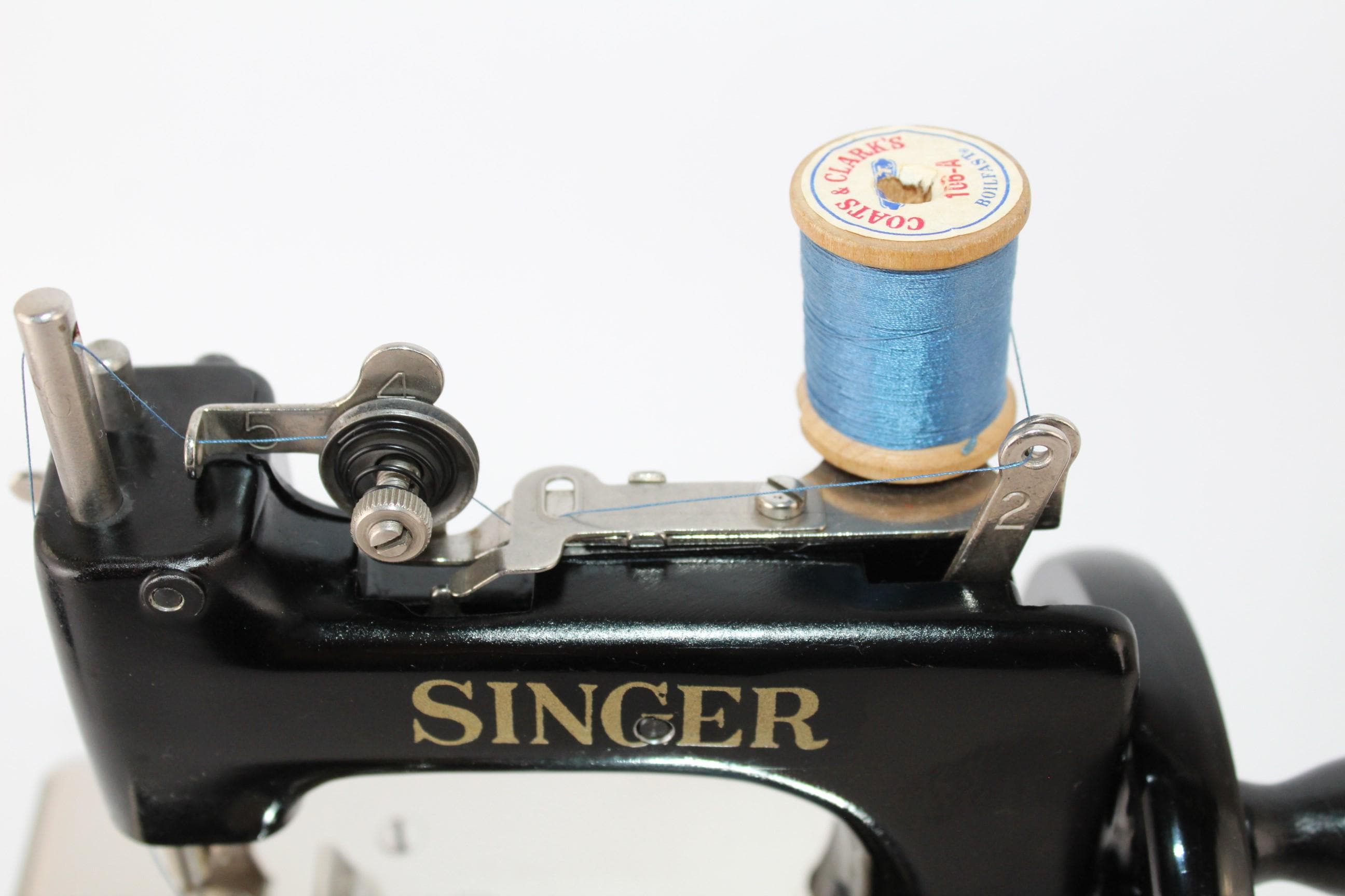The Sewhandy is a fully Functional Hand Crank Sewing Machine in toy size and sews wonderfully. Originally patented in 1910 and manufactured until 1975, these were known as the most popular toy sewing machines ever made. This is the 1950s model which has a thicker base column although it still uses the same mechanics as its predecessor from 1910. This machine is a rare Centennial addition issued in 1951 in its beautiful classic deep gorgeous shiny Black finish. The thread running is simple on this machine with all the parts numbered 1 through 6 and down to the needle to thread this little machine. We have cleaned and tested the little machine and it sews wonderfully. It has only minor scuffs at the base of the machine. Uses a 24x1 needle.