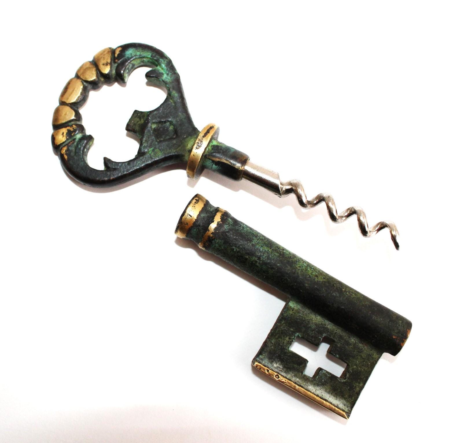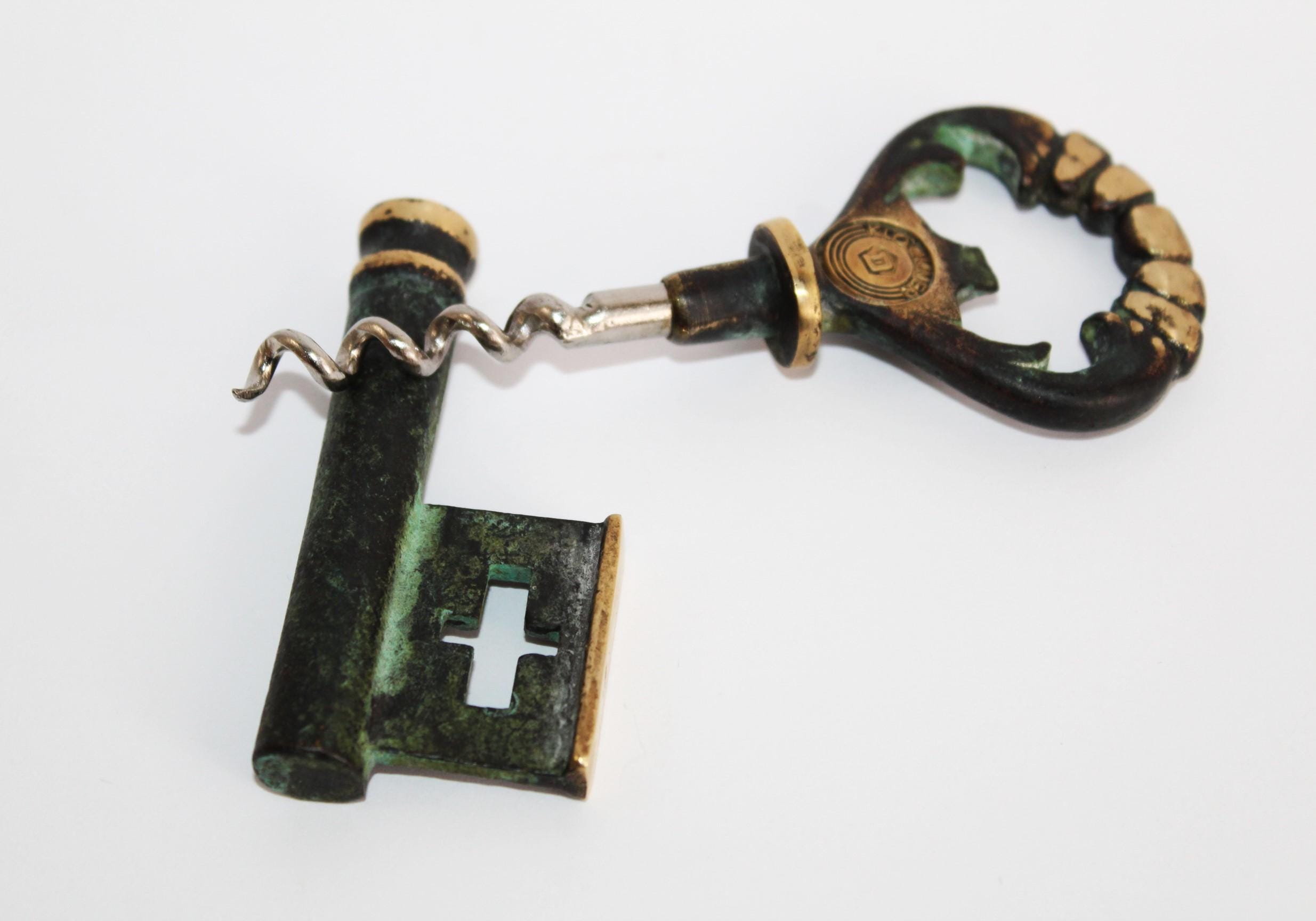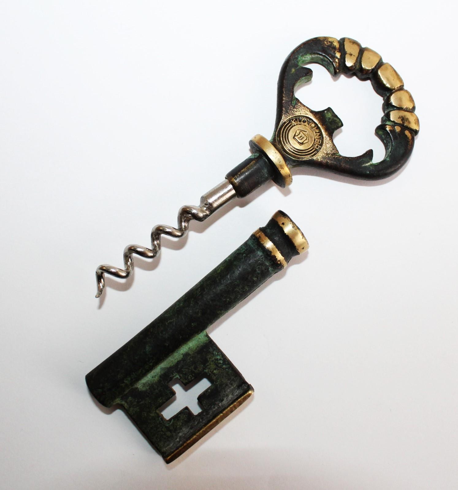 Wonderful solid brass corkscrew made in Germany. The key pulls apart to reveal a hidden corkscrew; the handle of the key is a bottle opener.