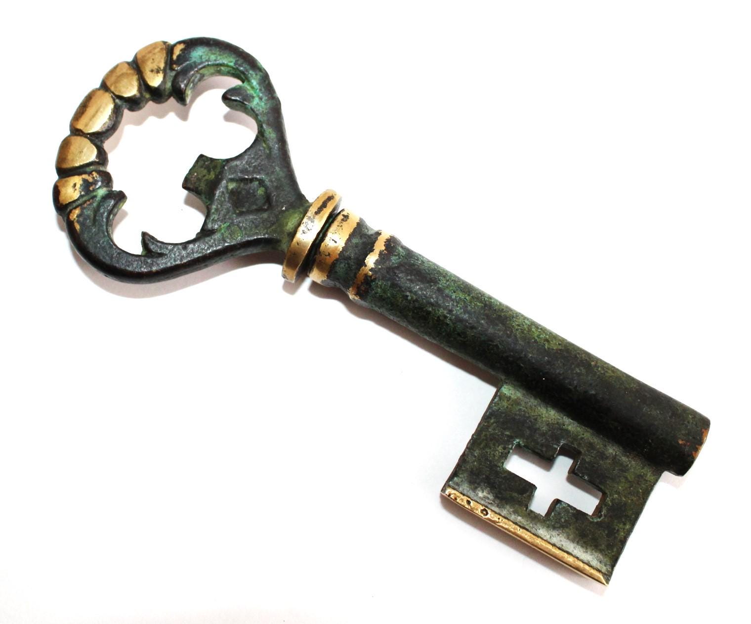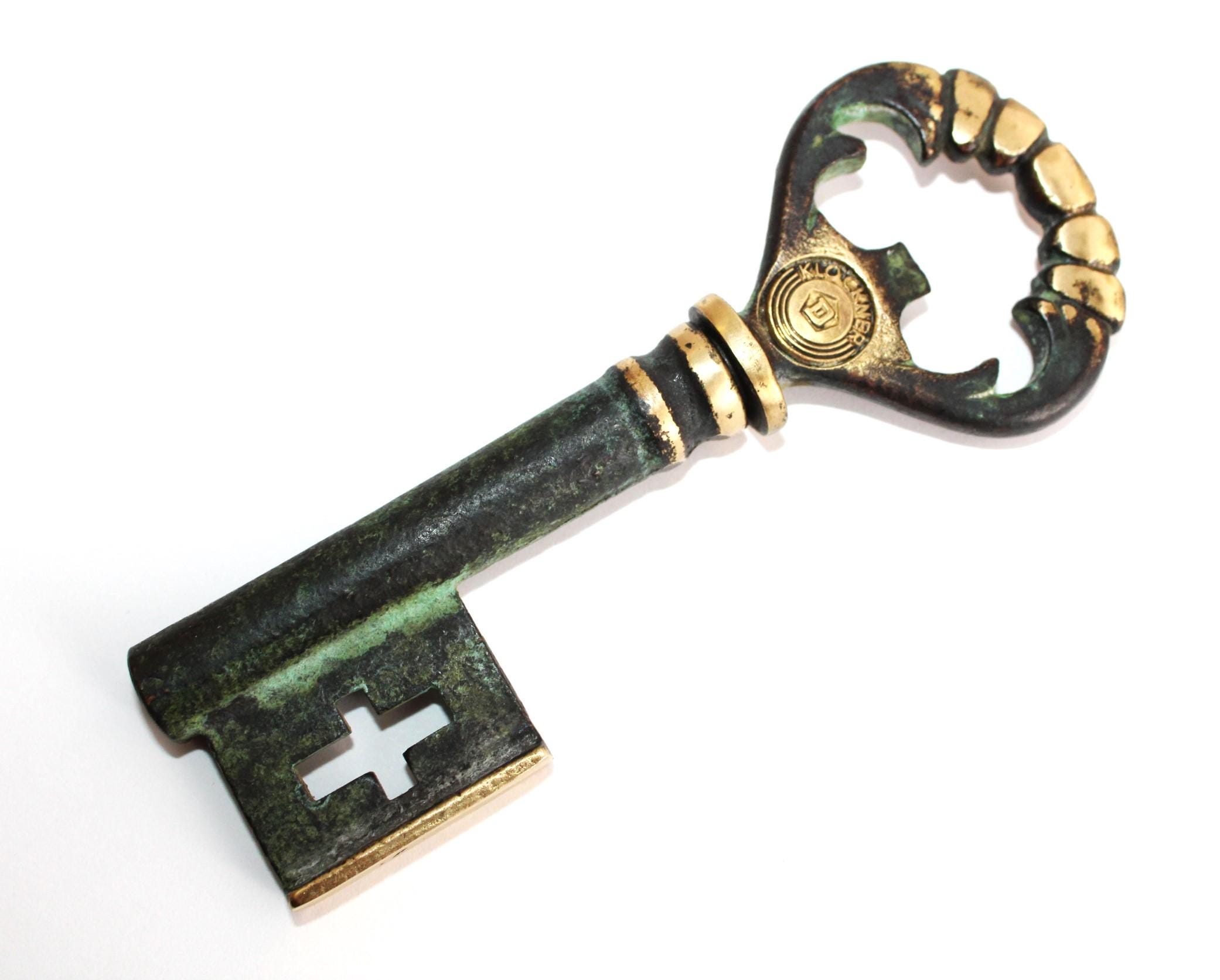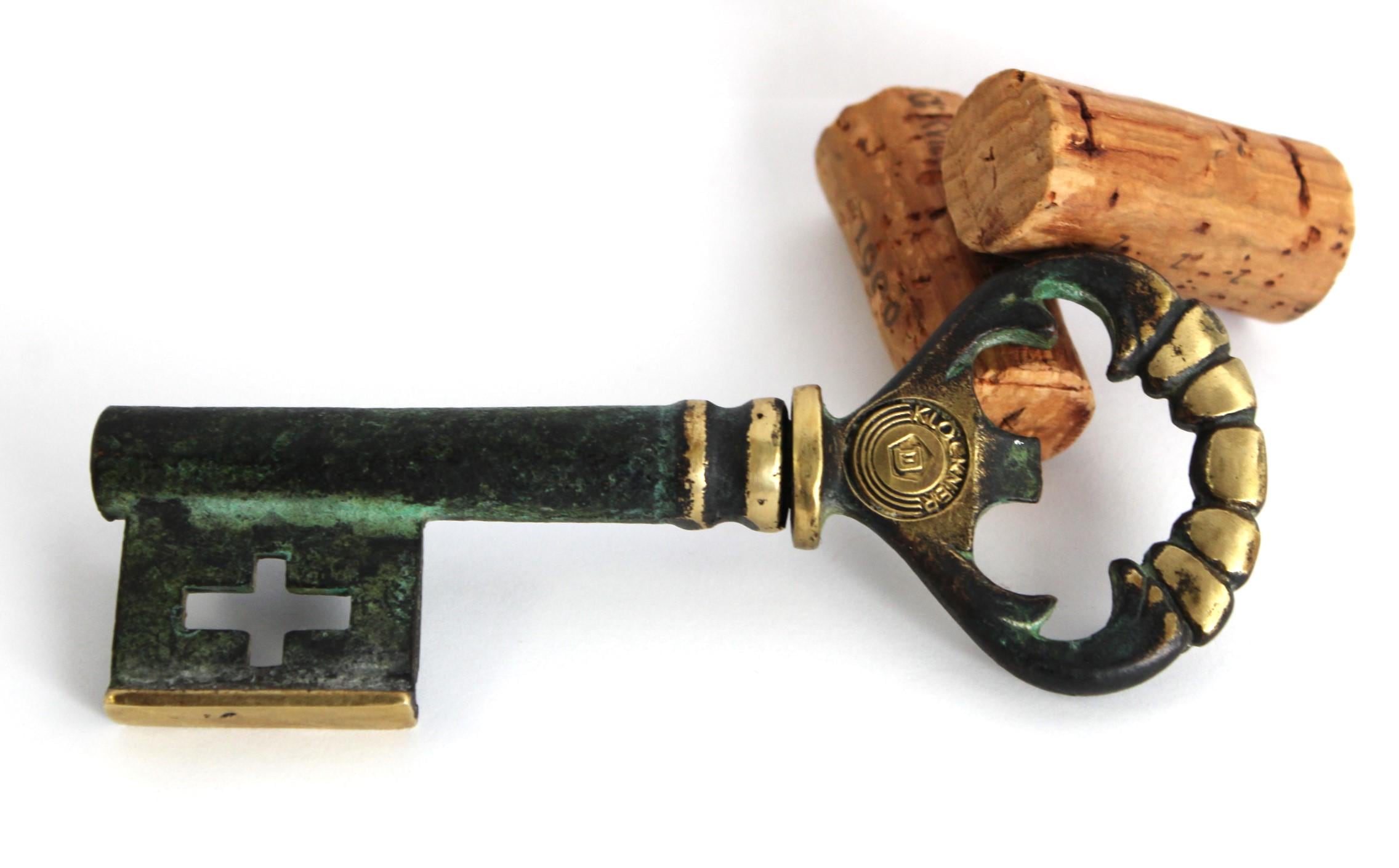 Wonderful solid brass corkscrew made in Germany. The key pulls apart to reveal a hidden corkscrew; the handle of the key is a bottle opener.