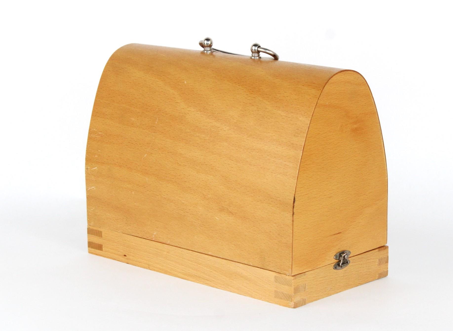 The machine is made of metal and is in a lovely pink color; it comes in its original maple wood case.