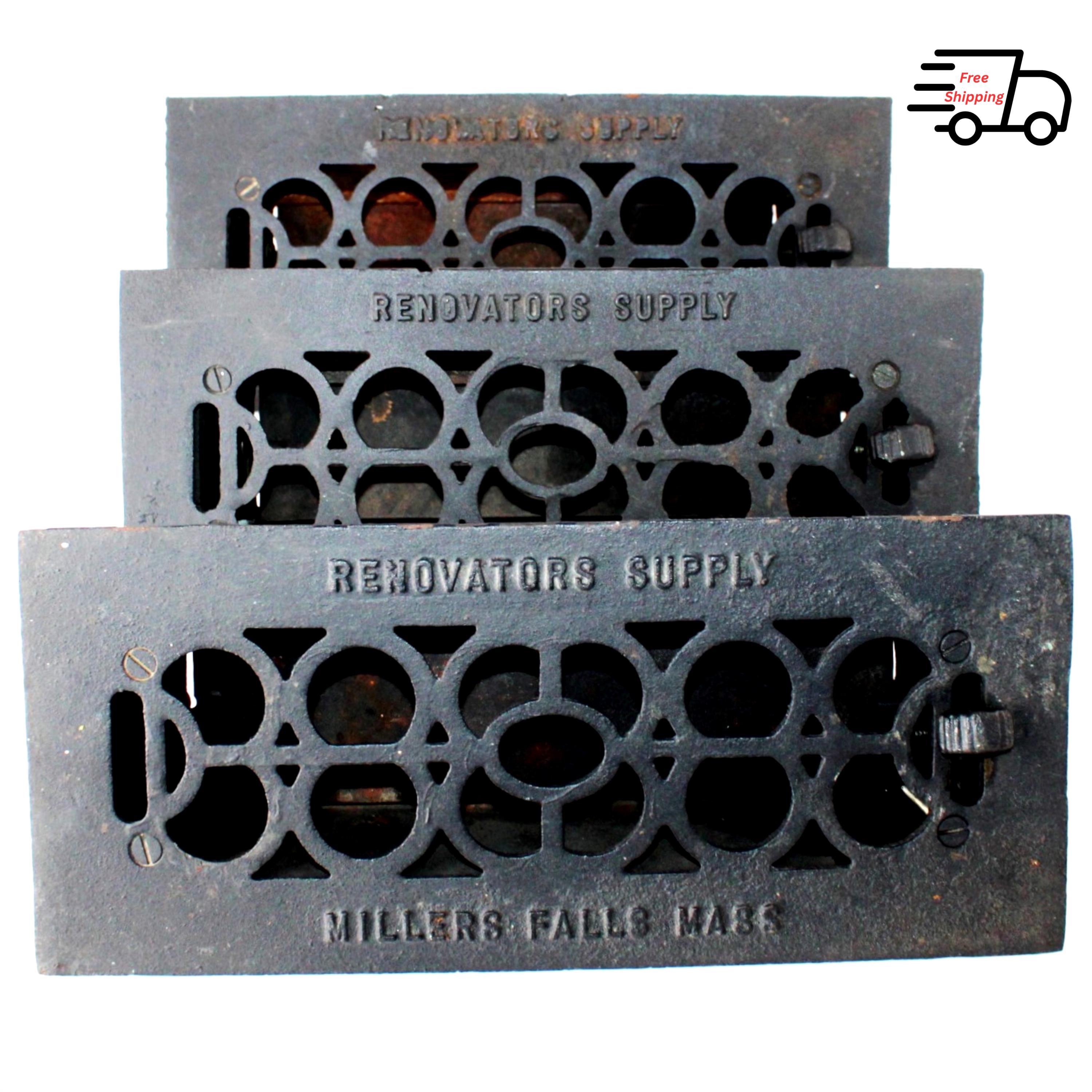 Wonderful find, these cast-iron floor grates with dampers made by the Renovators Supply Company of Miller Falls, Massachusetts.