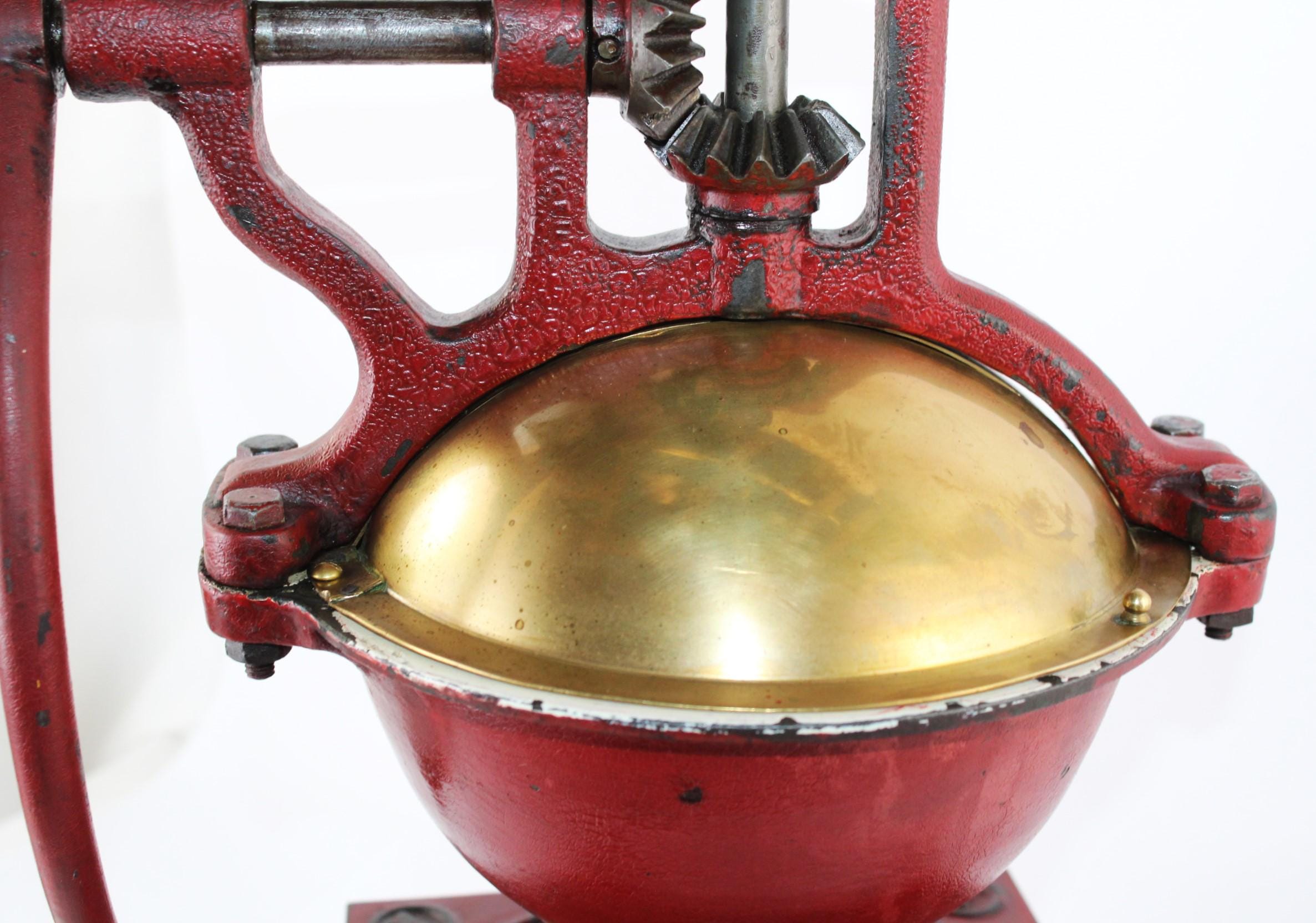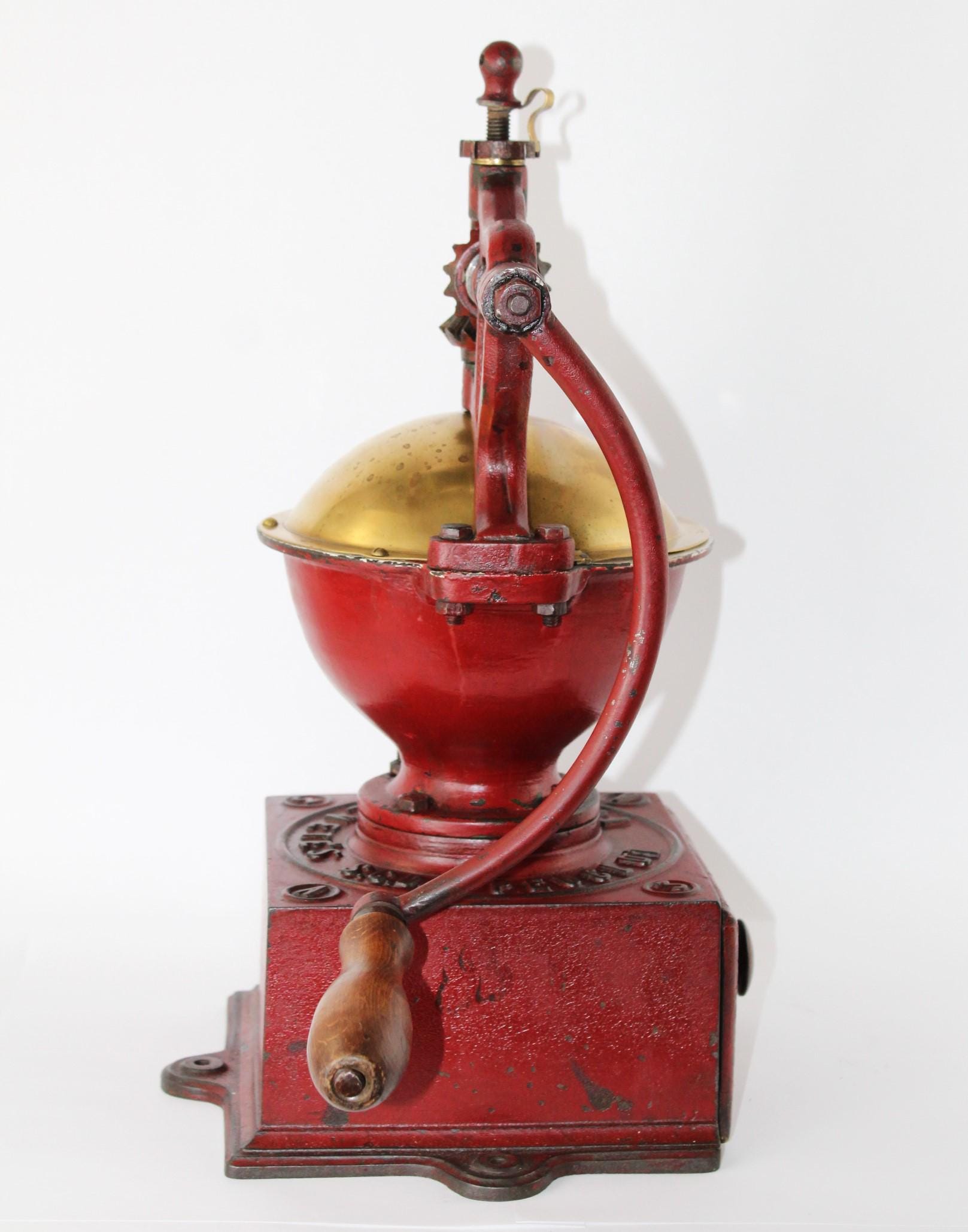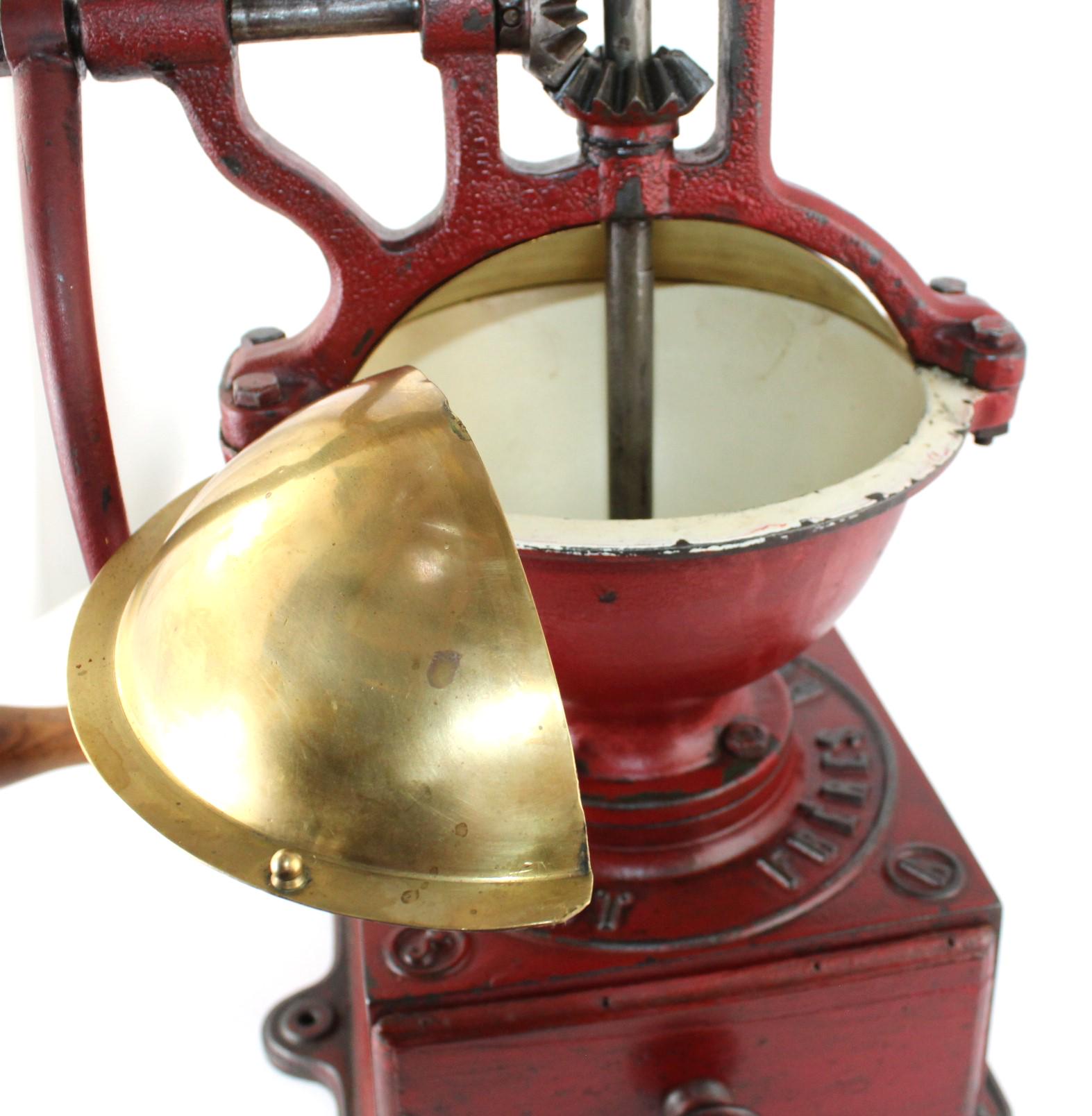 Amazing find, this late 1800s Peugeot Freres No.3, mercantile countertop coffee grinder, made in France. Made of cast iron with a brass hopper cover and steel gears. This is a commercial-size coffee grinder meant to be used in a mercantile store; it will easily hold up to a half pound of beans. The top has an adjustment screw for fine-tuning the grind of the coffee bean.