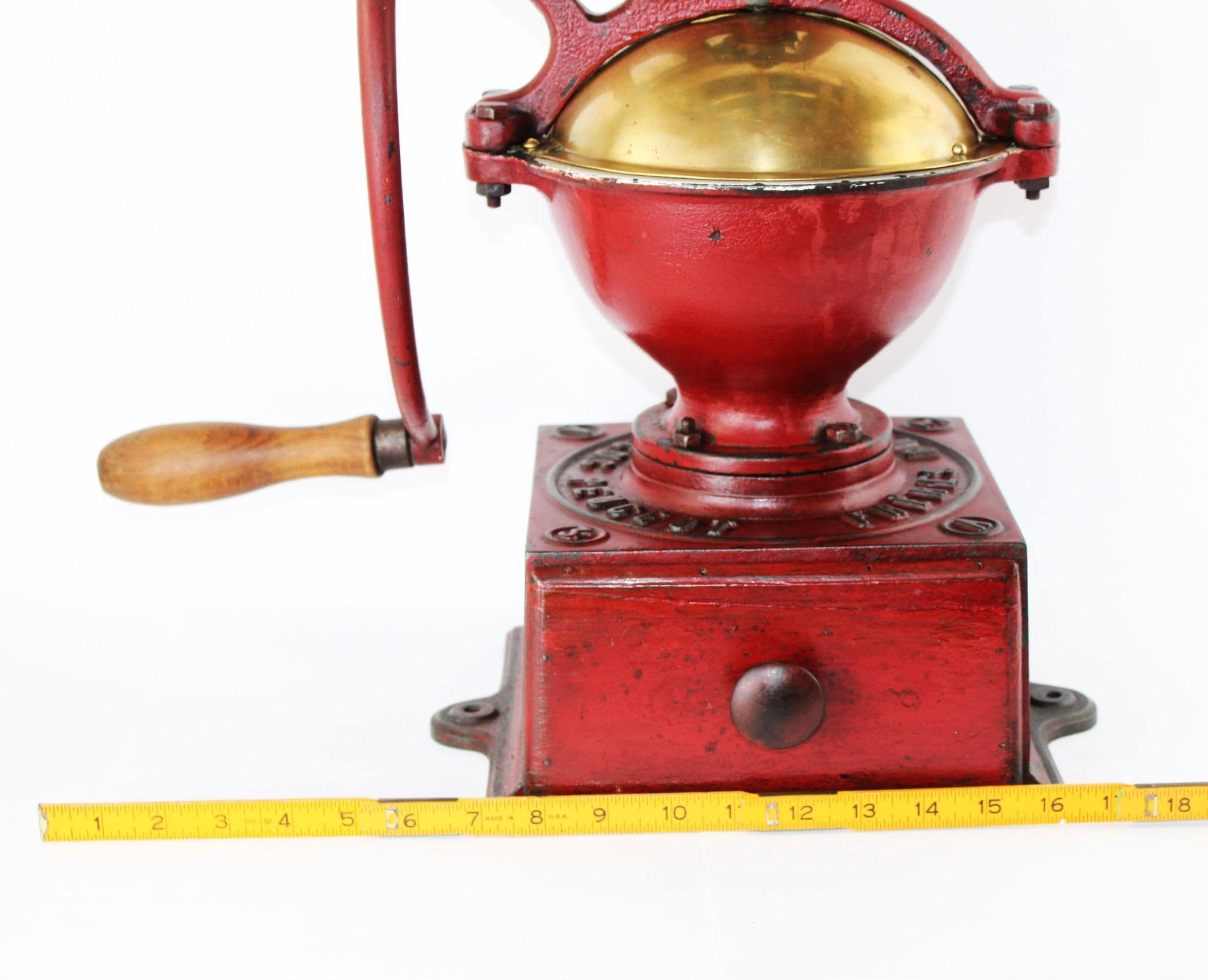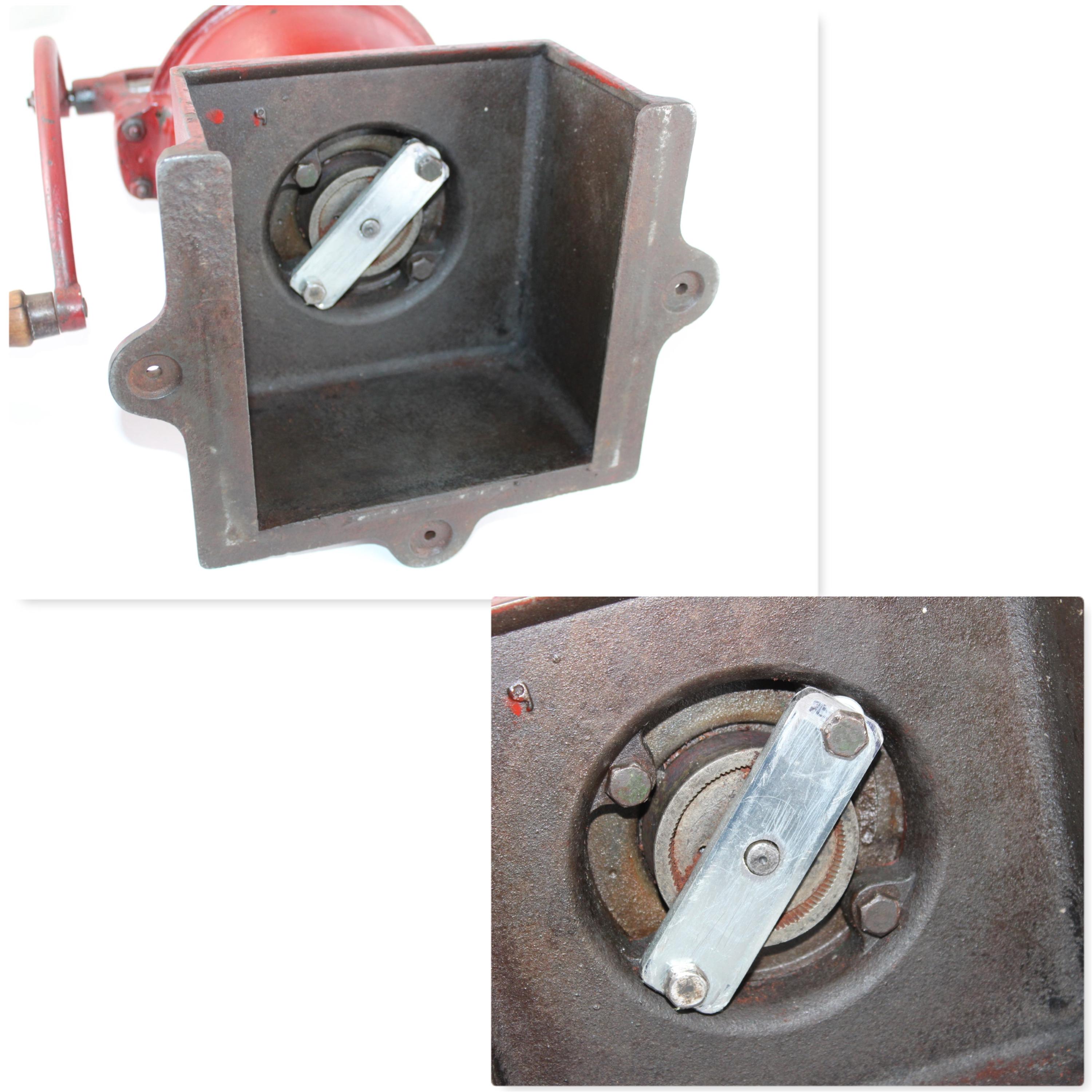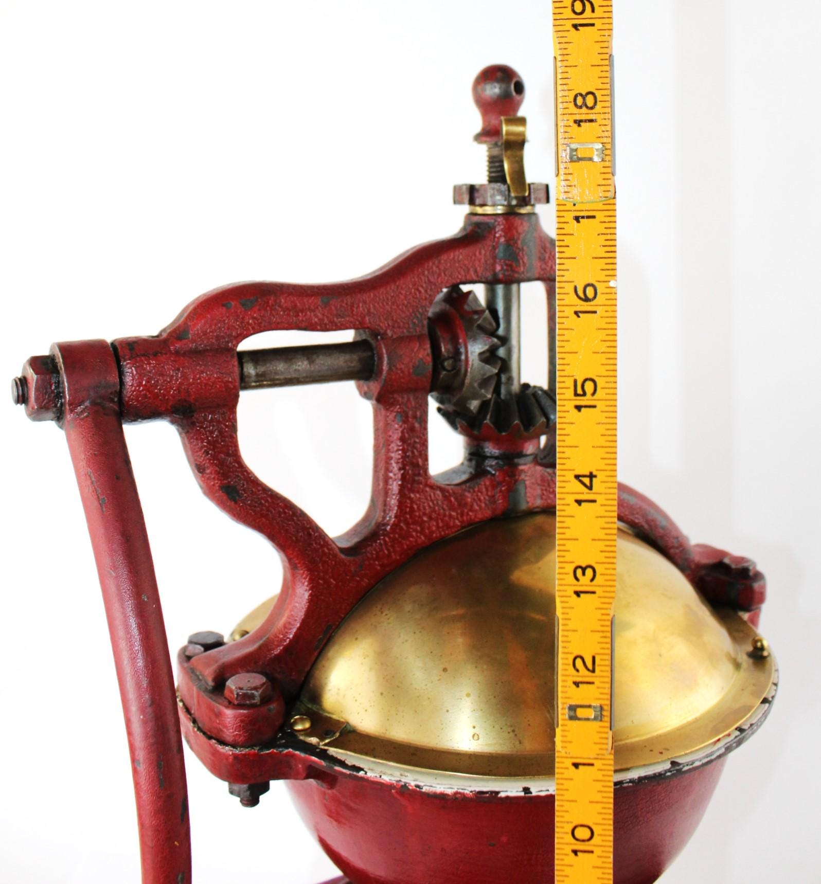 Condition: as shown, it is 135 years old and comes with scuffs. At some time, a replacement steel support was added to the base of the grinder.