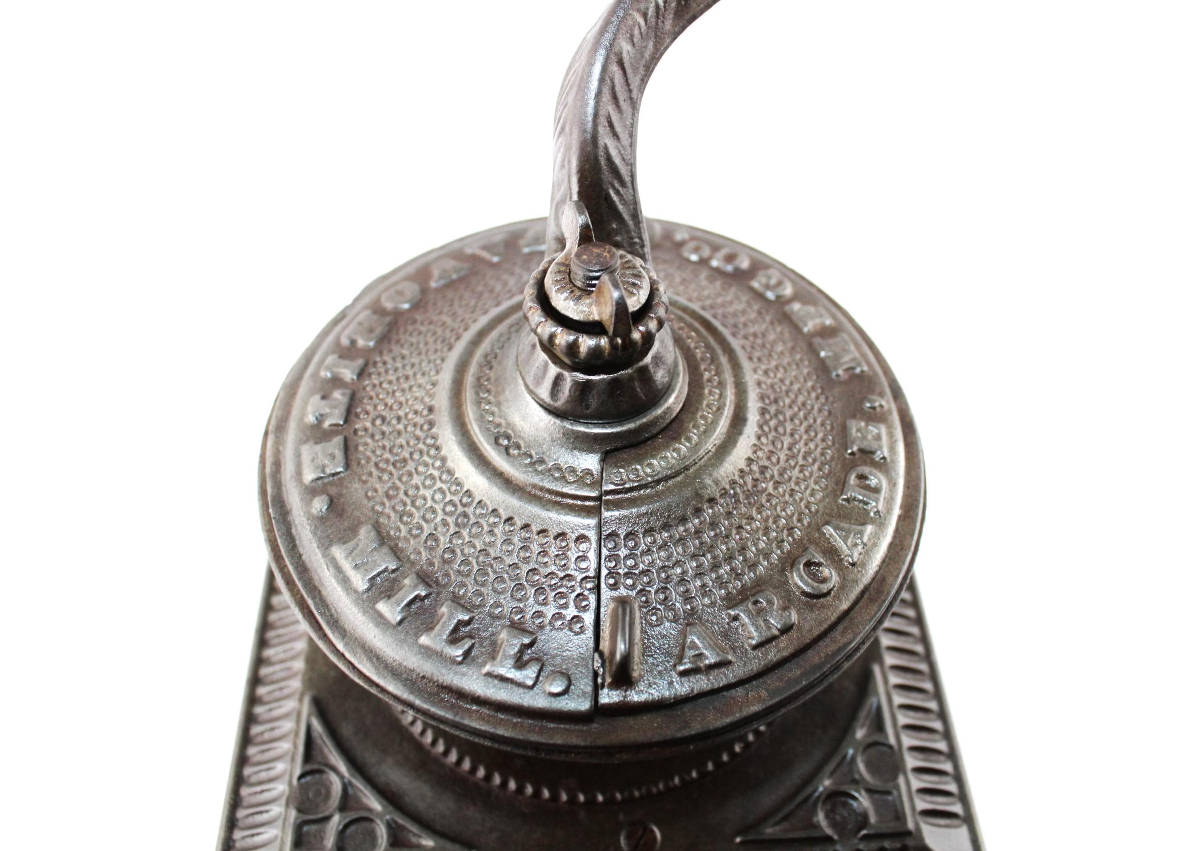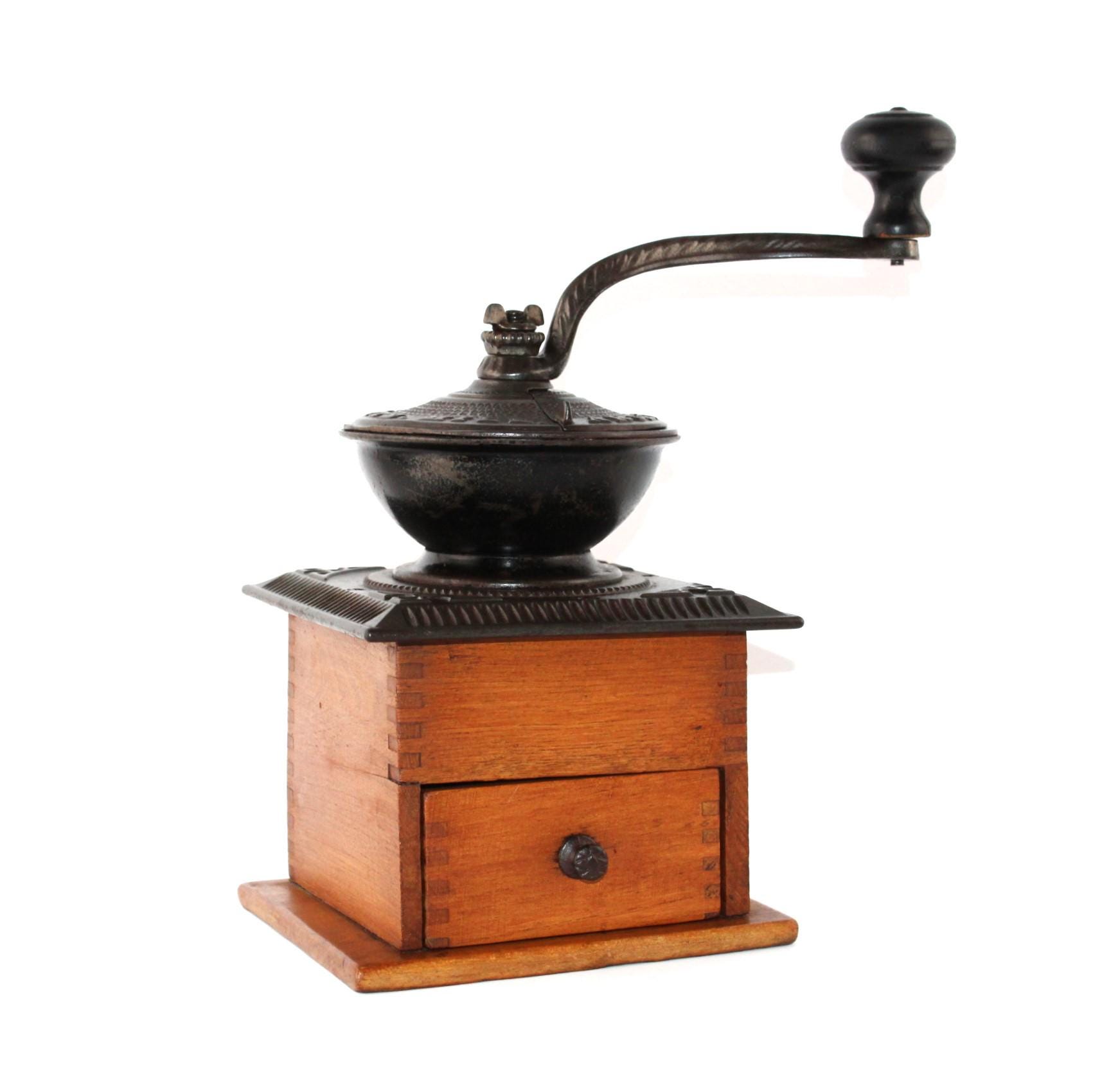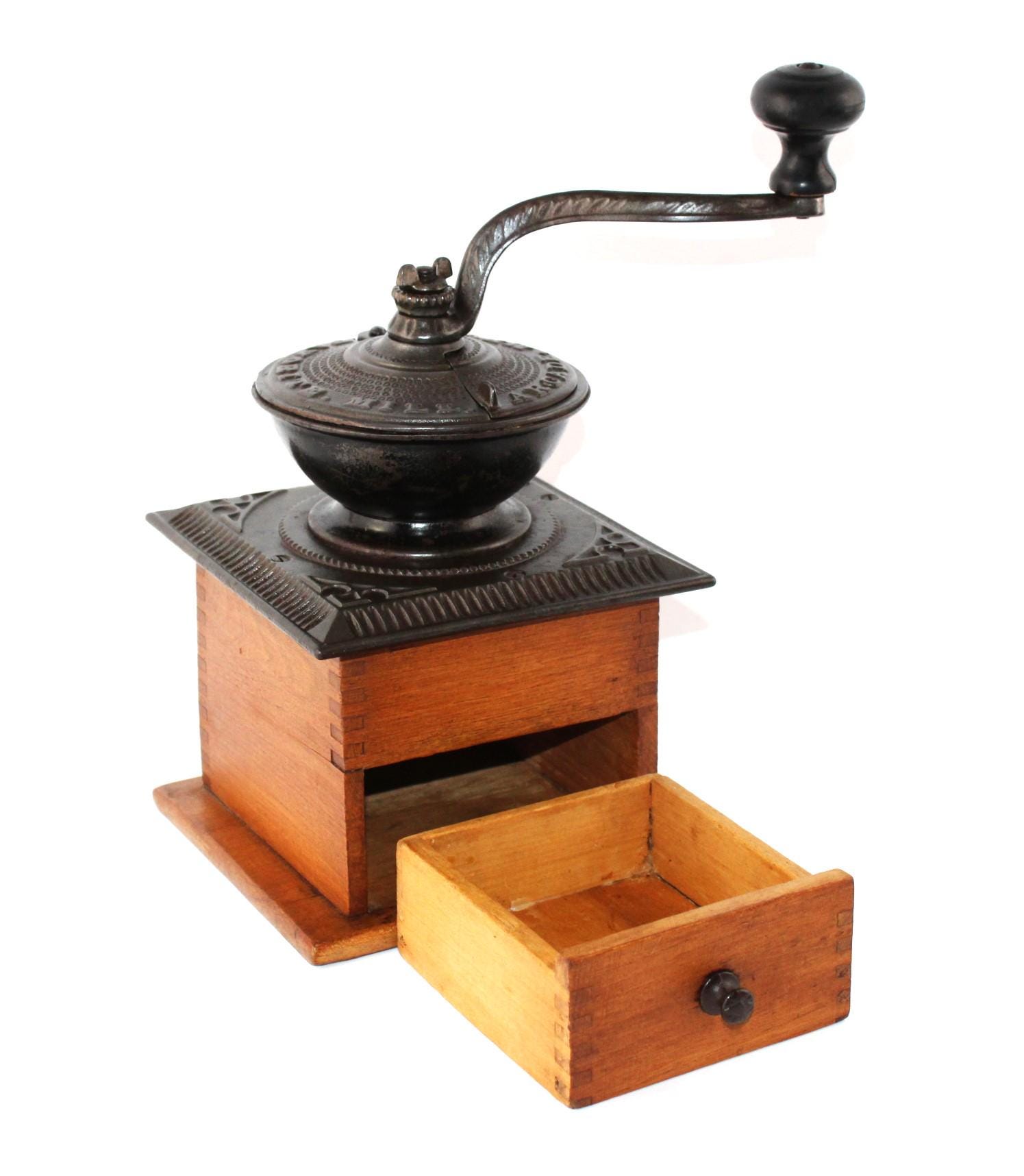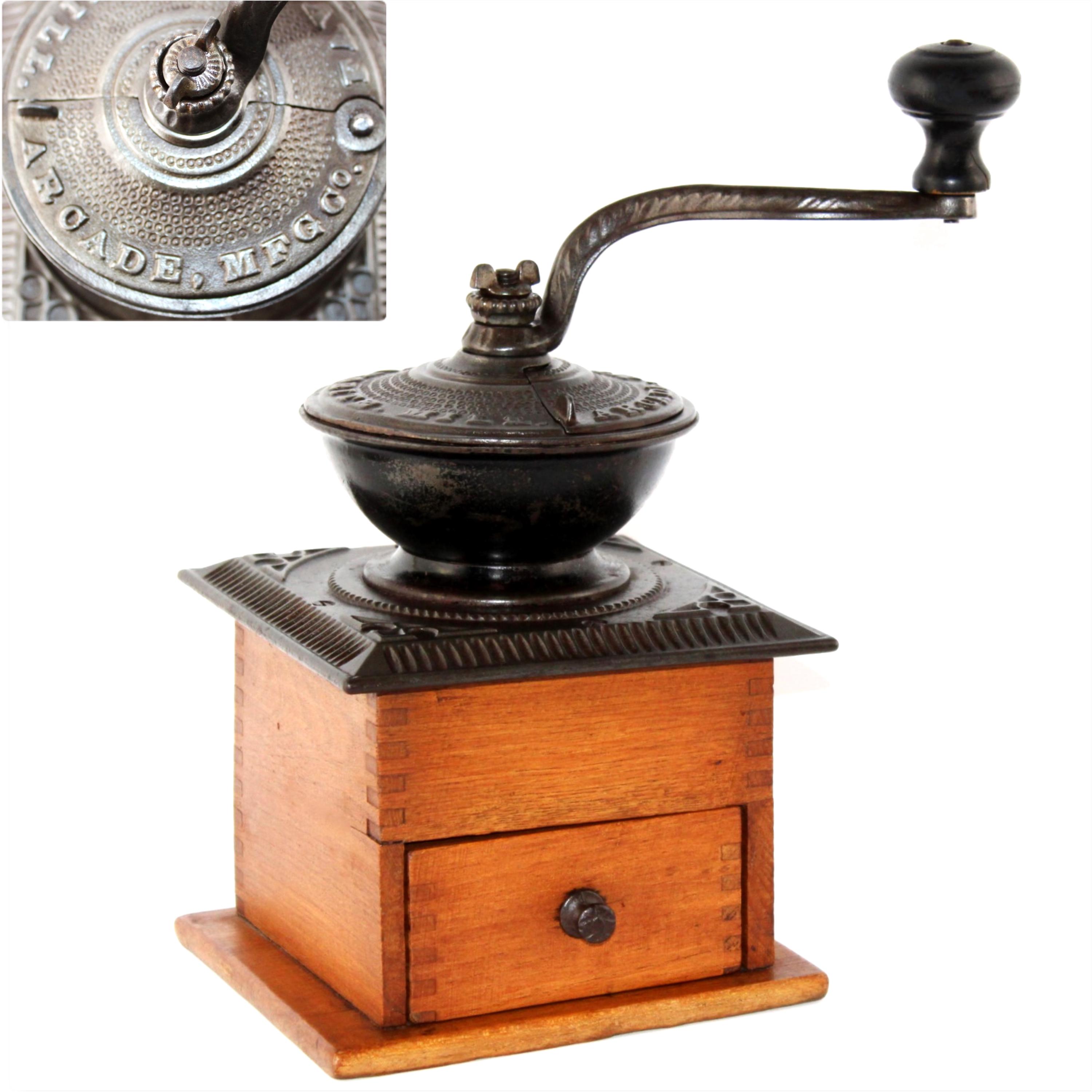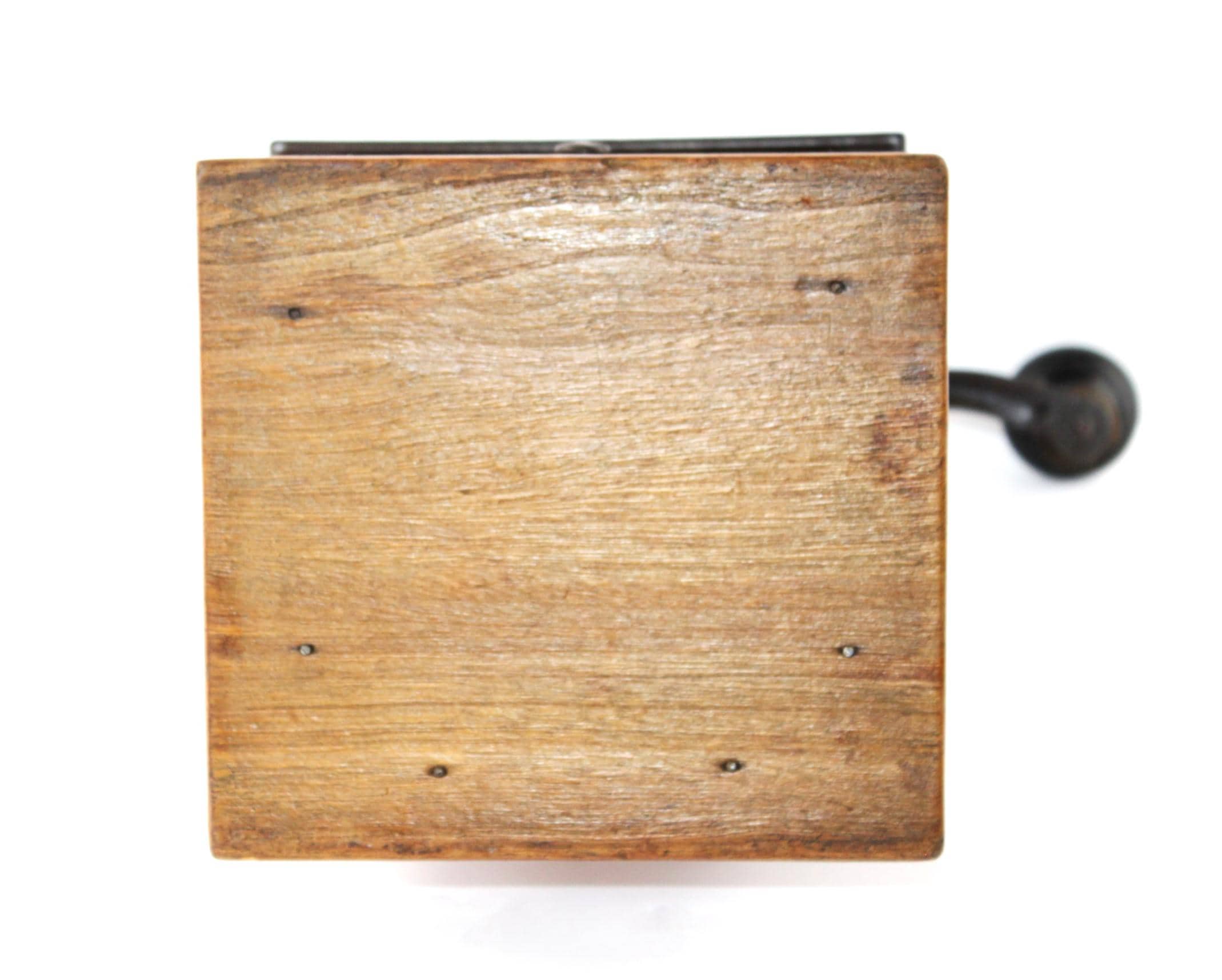 We have thoroughly cleaned the grinder inside and out and oiled it with a food-safe oil; it works wonderfully. The top has an adjustment screw for fine-tuning the grind of the coffee bean. This is a rare and stunning coffee grinder in museum-quality condition.