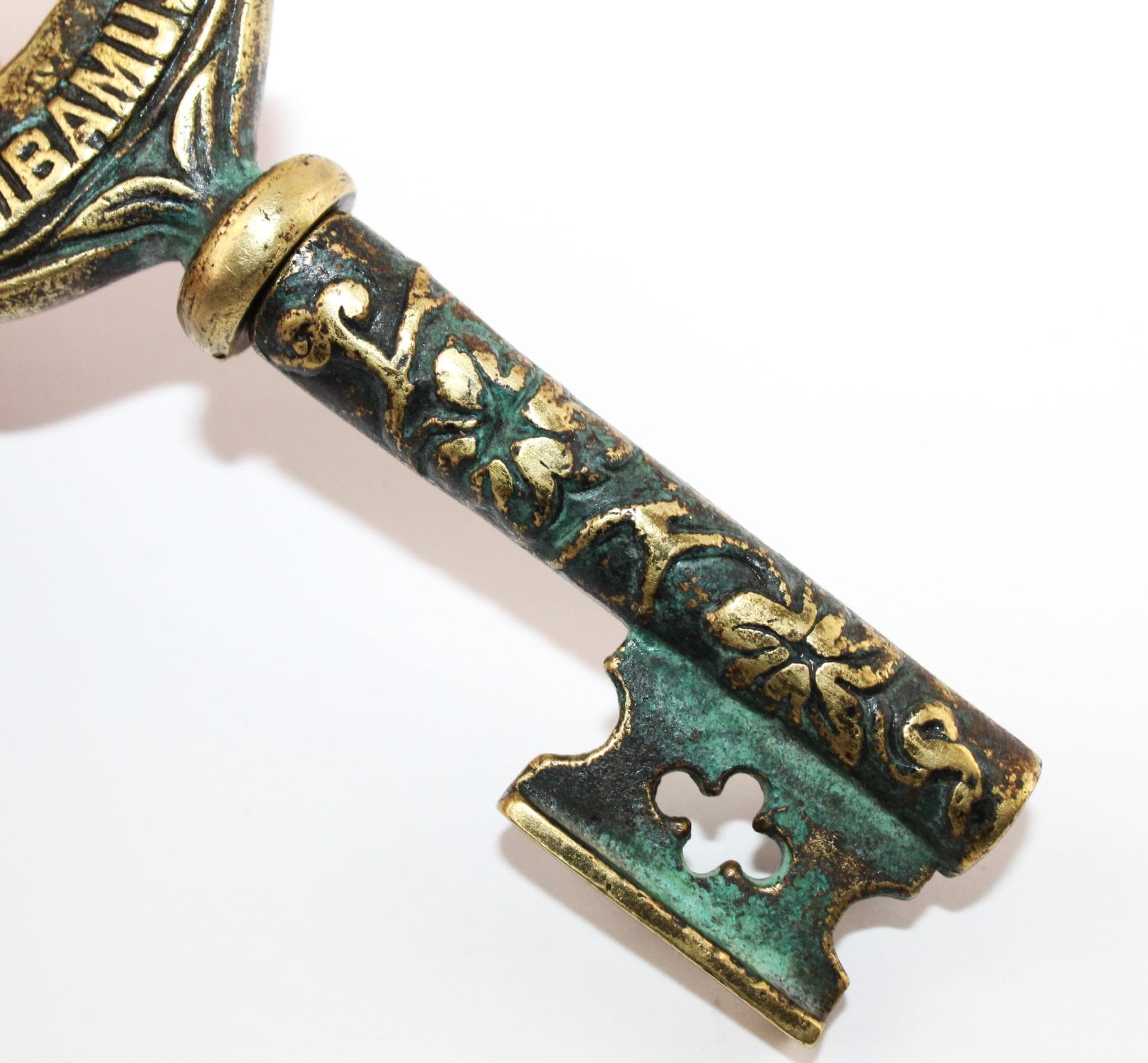 Wonderful heavy brass corkscrew made in Italy. The key pulls apart to reveal a hidden corkscrew; the handle of the key is a bottle opener.