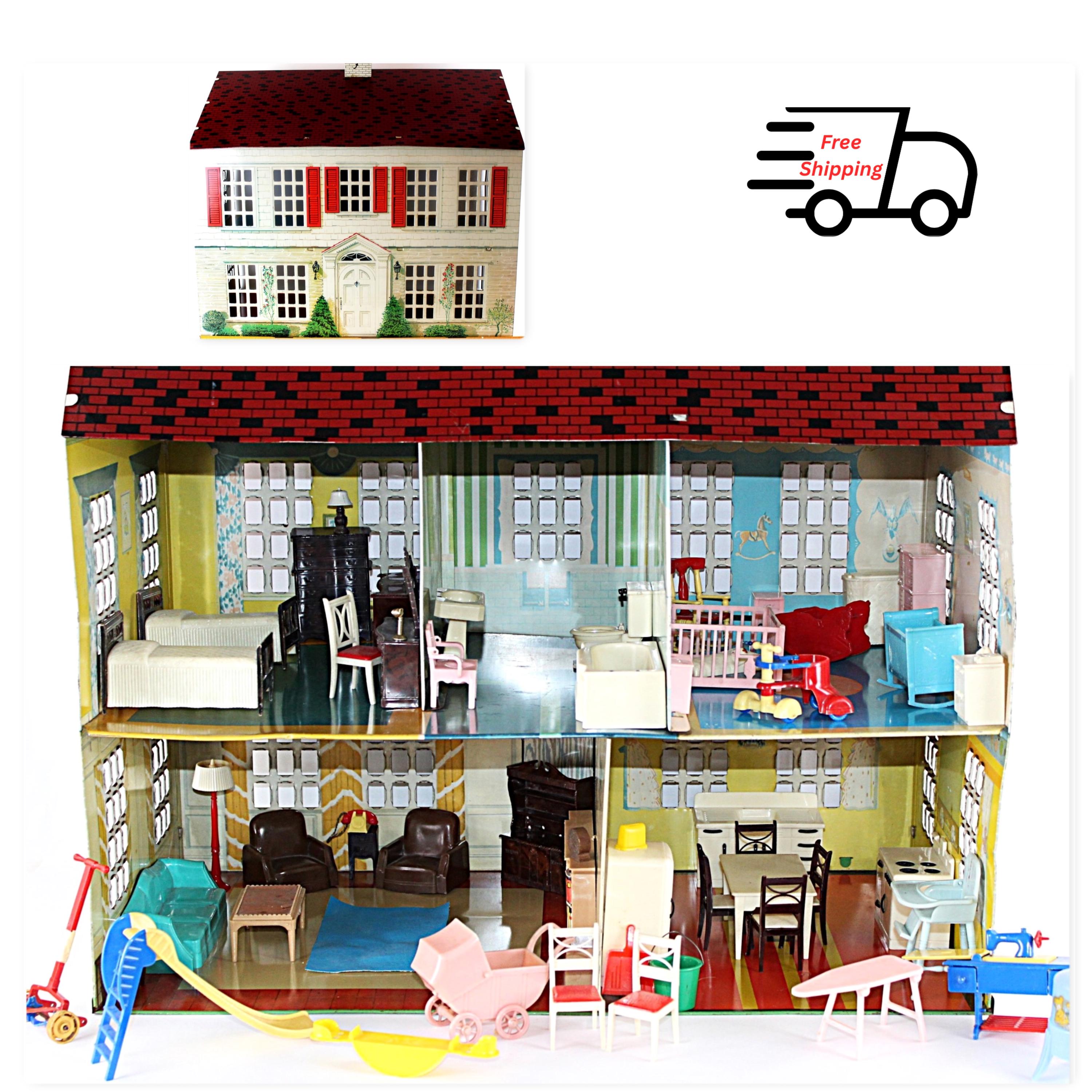 Wonderful find, this 1950s metal dollhouse with doll-sized furniture and accessories. The accessories are made by Renwal Products of the USA and Canada. There are too many accessories to list. Please zoom into all the photographs to see all the furniture and accessories.