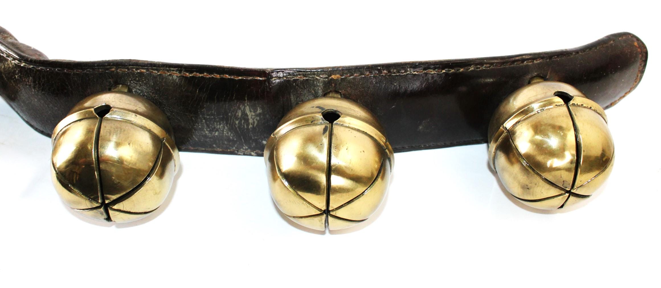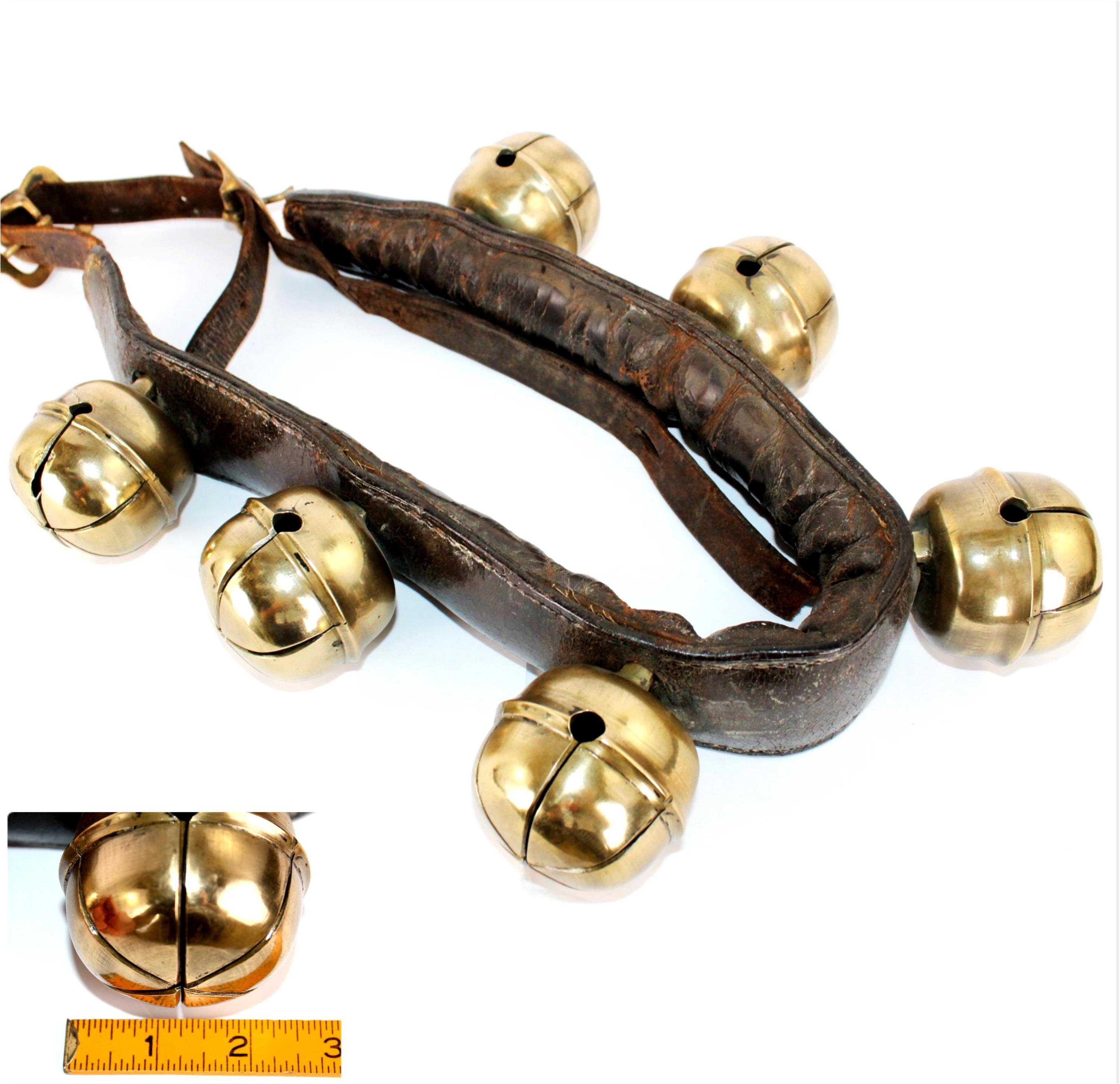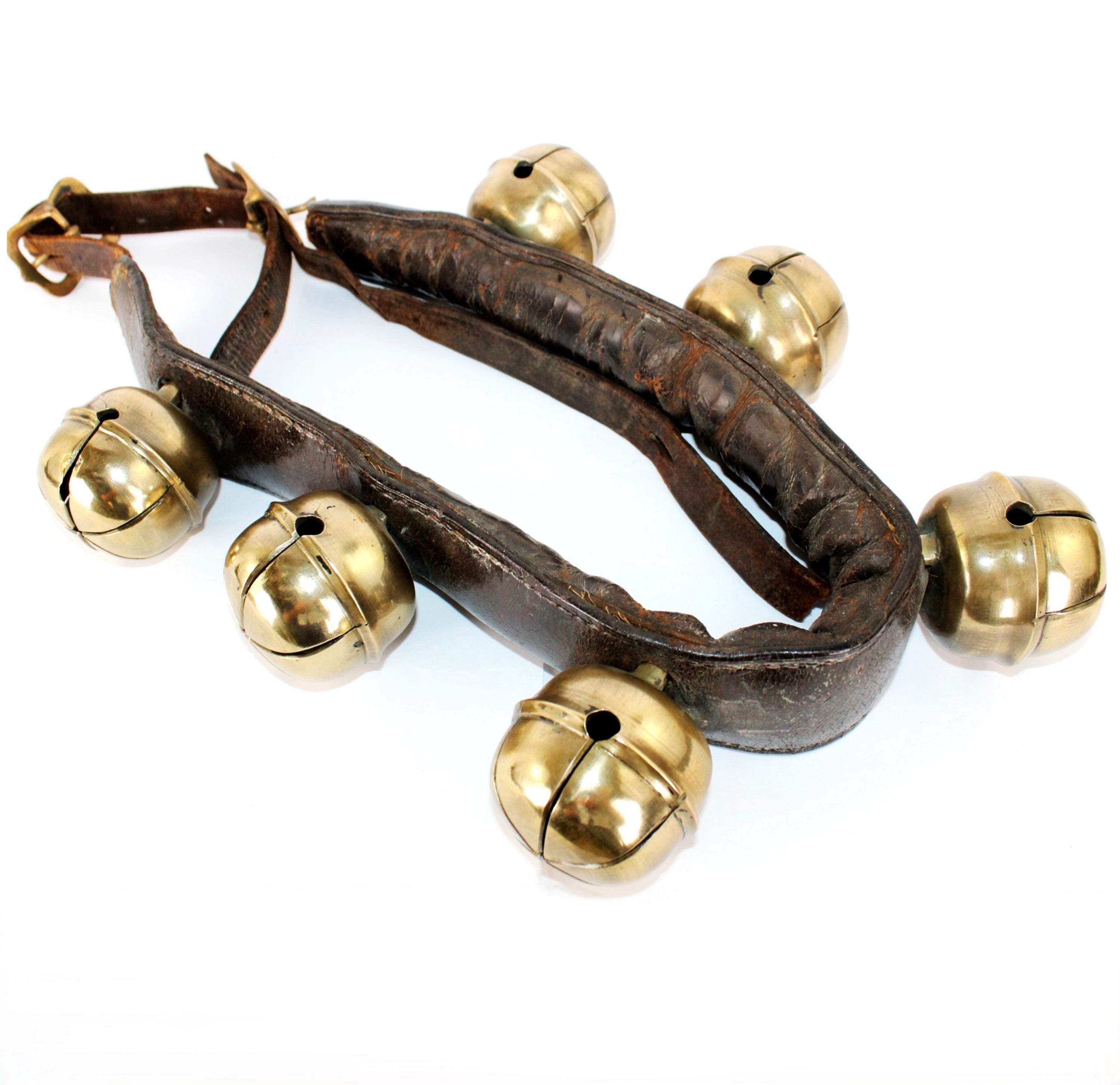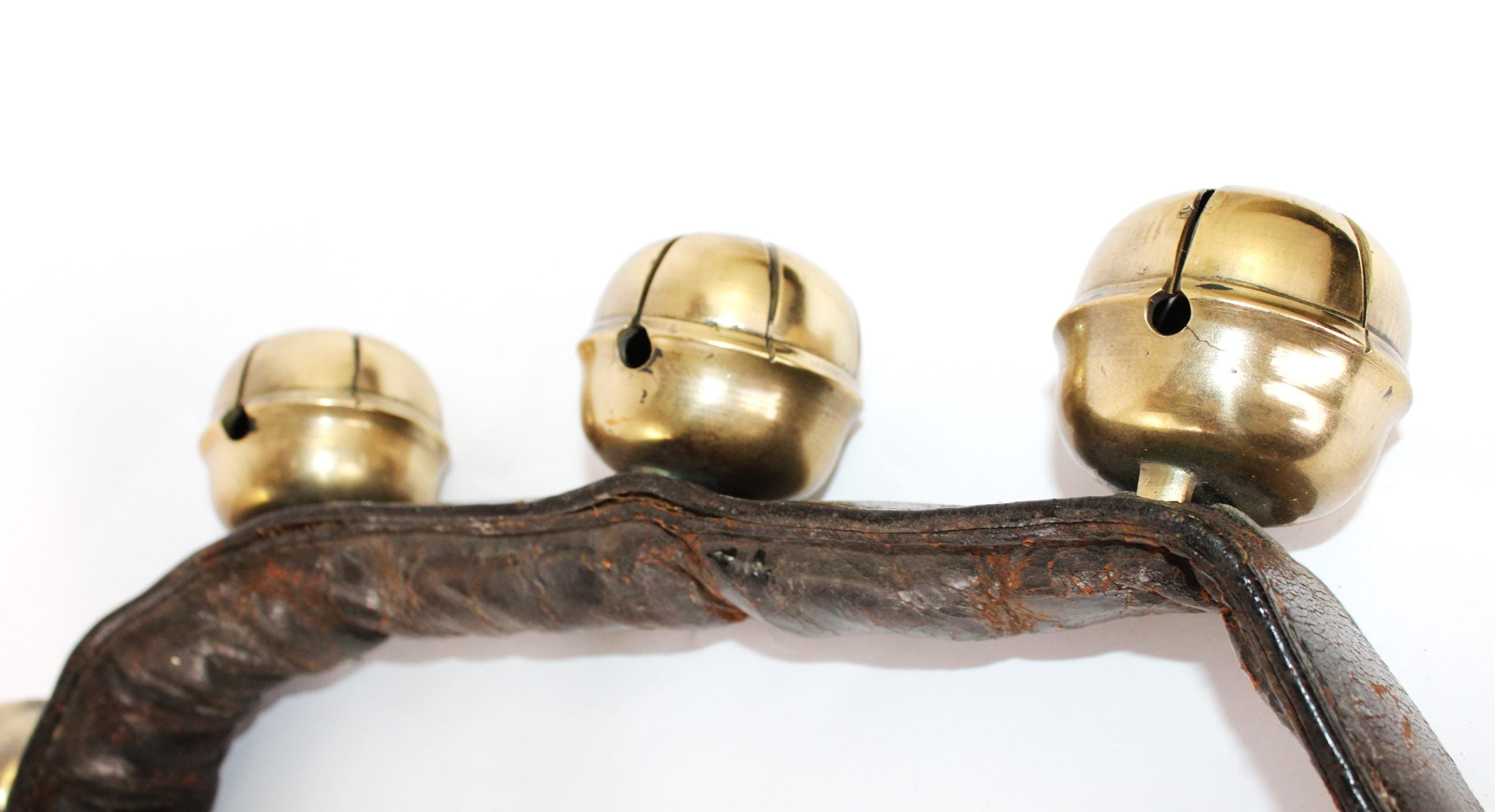 Condition: bells are old and used, with some stress cracks and flaws in the brass, as shown. The leather buckle strap is broken away from the main bell strap.