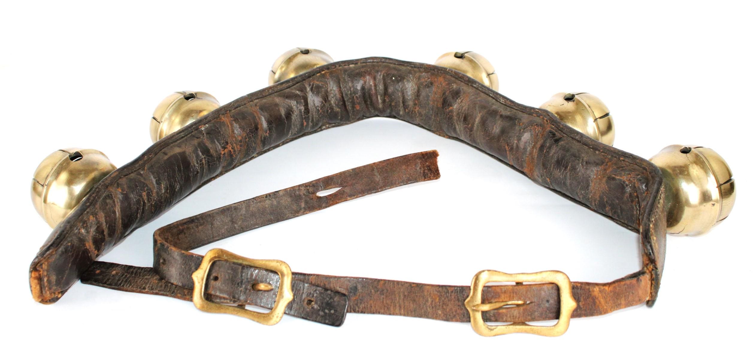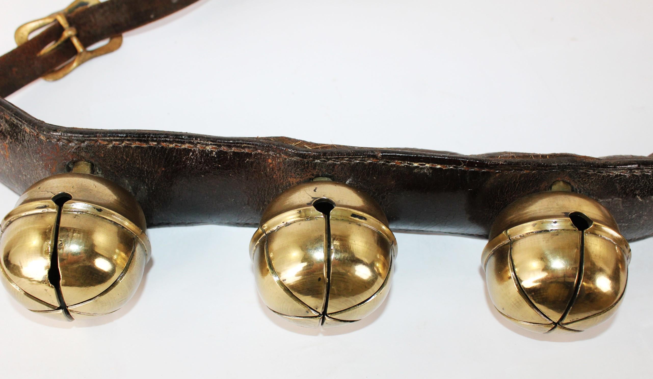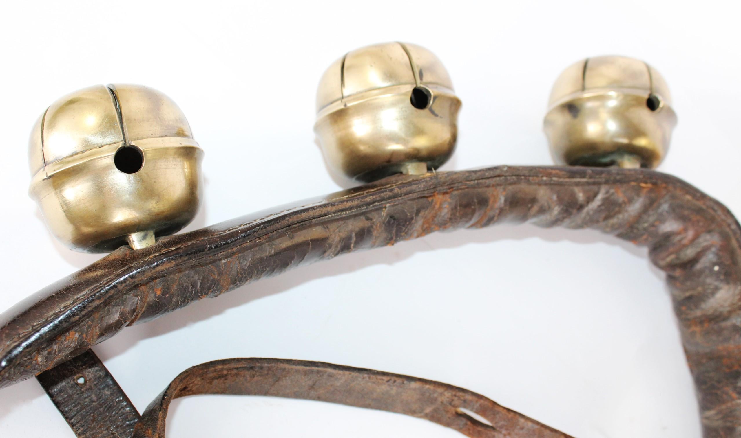 Condition: bells are old and used, with some stress cracks and flaws in the brass, as shown. The leather buckle strap is broken away from the main bell strap.