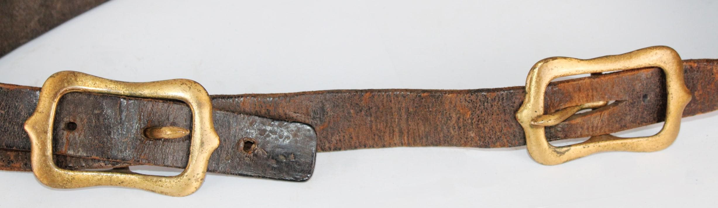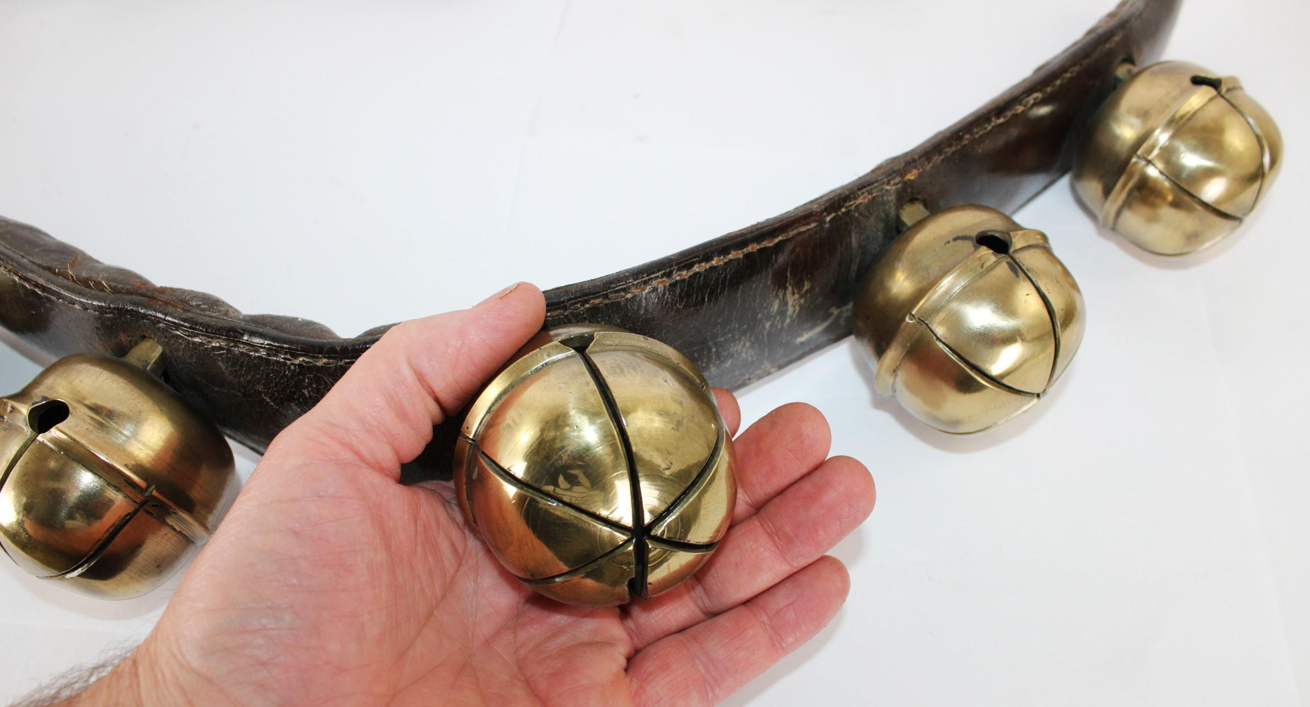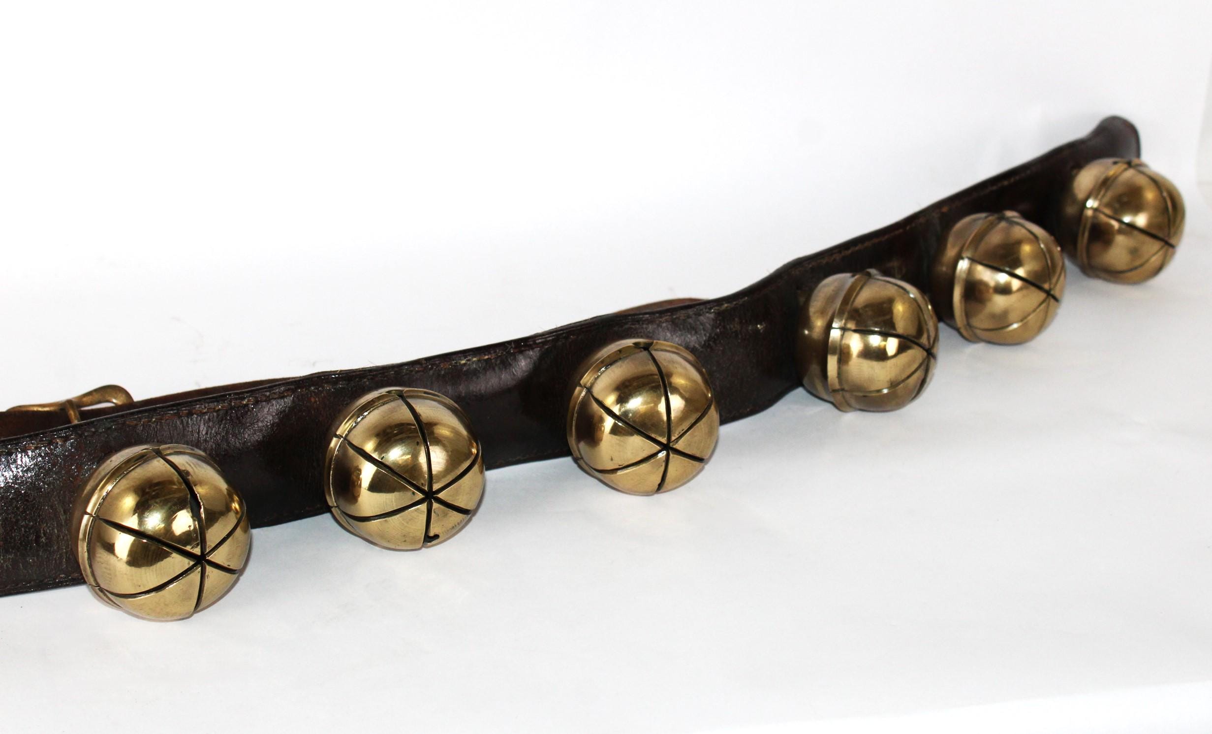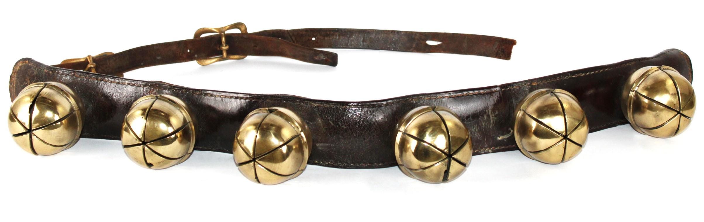 Condition: bells are old and used, with some stress cracks and flaws in the brass, as shown. The leather buckle strap is broken away from the main bell strap.