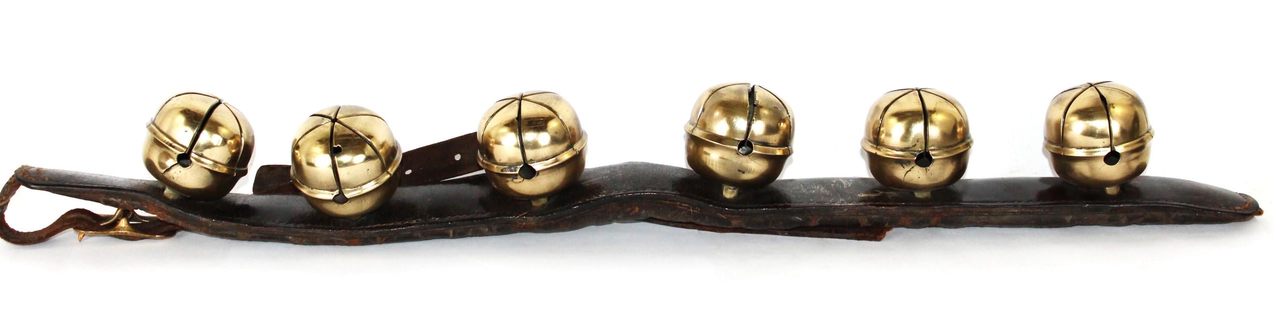 An amazing set of six Swedish Horse bells. This is a larger set of Rump Bells consisting of six 2½” diameter bells. The bells are attached to a horse-hair-filled strap that is 29” long and 2½” in width. There is a two-brass-buckle strap for buckling the bells to the horse, measuring 24” long.