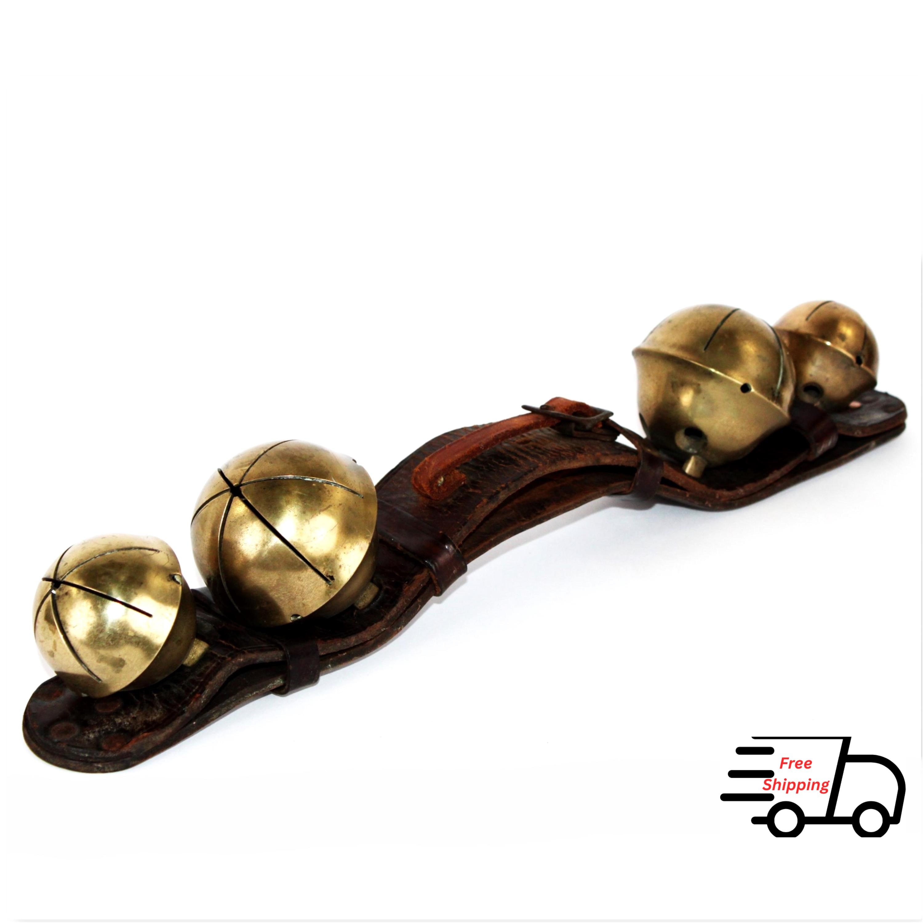 Condition: bells are old and used, with some stress cracks and flaws in the brass, as shown. The leather buckle strap is broken away from the main bell strap.