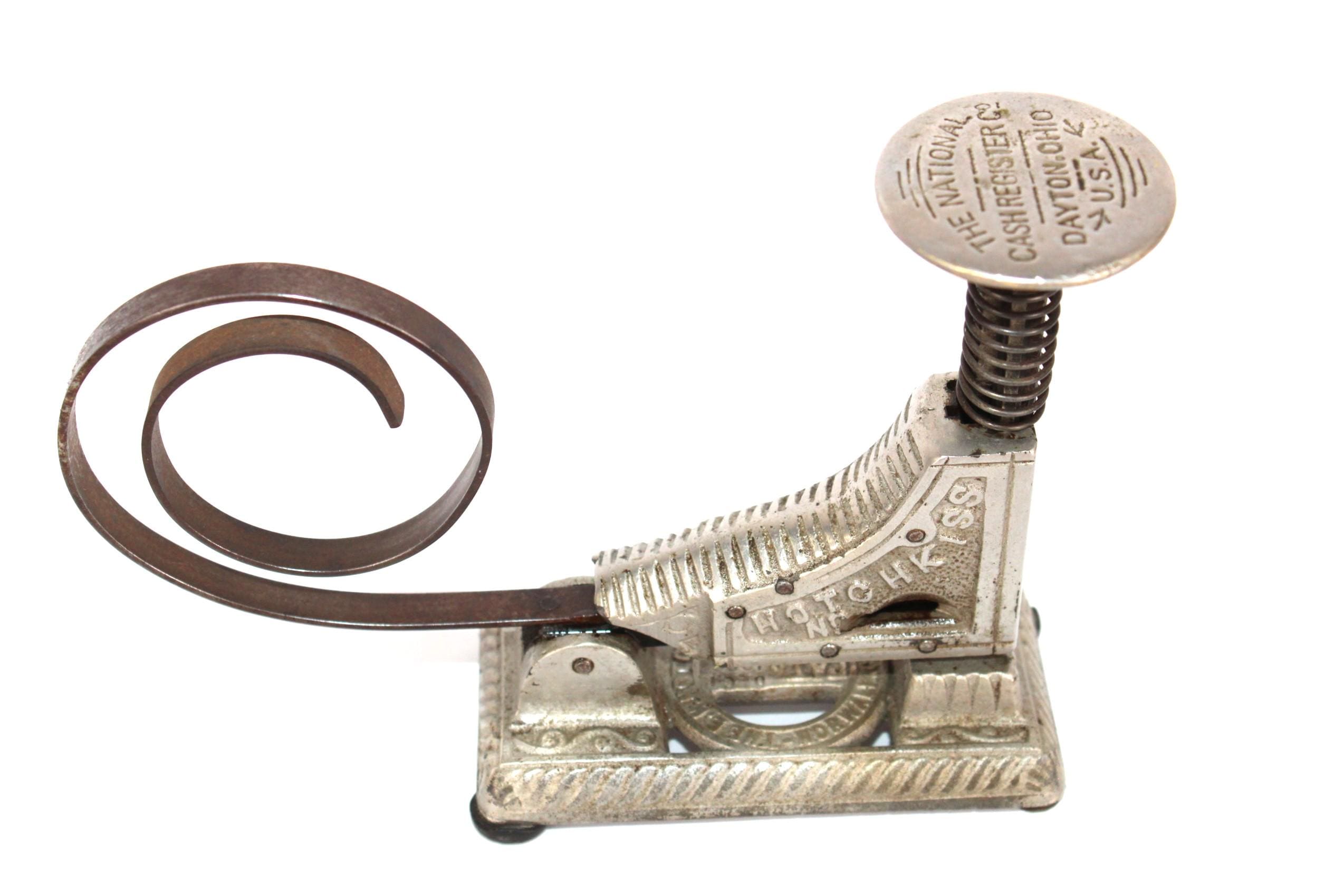This stapler was sold by the National Cash Register Company of Dayton, Ohio, and labeled on the cap of the striking hammer.