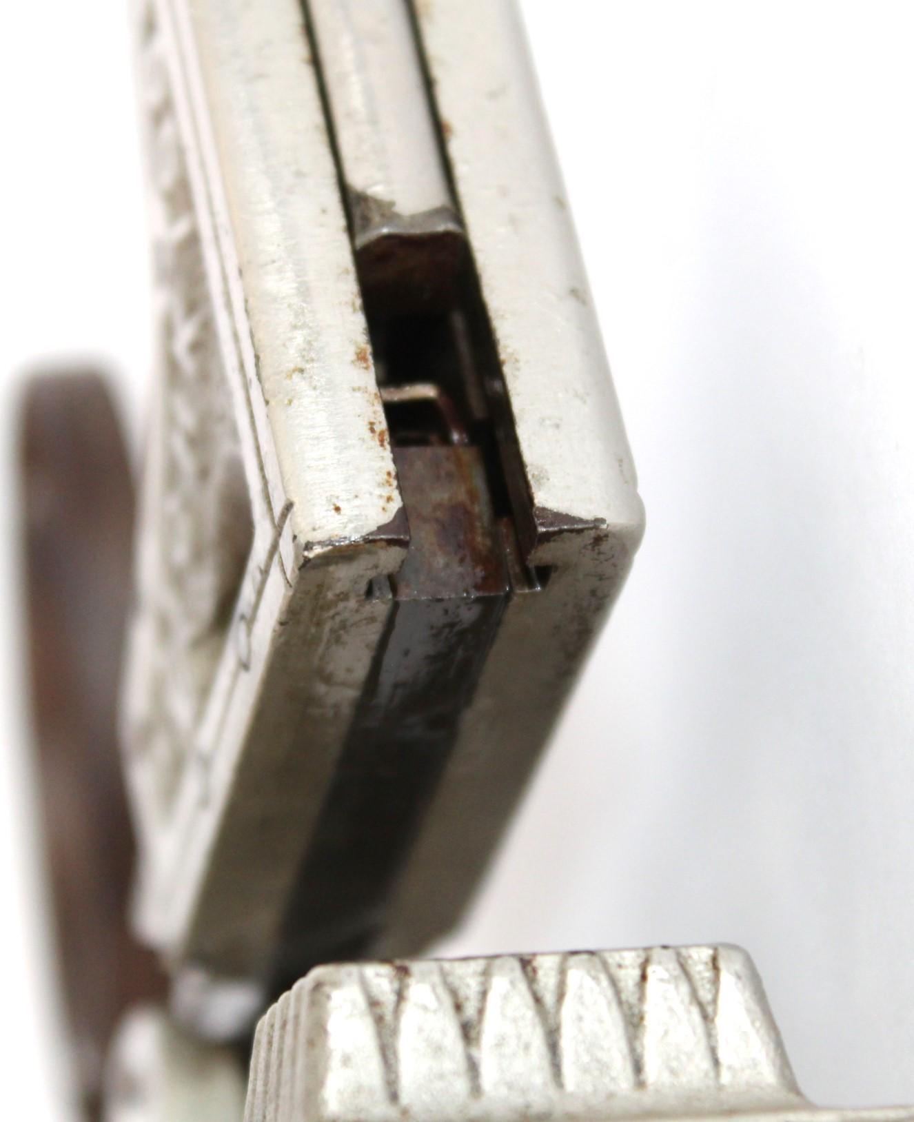 The Stampler is made of cast iron with a nickel finish and a steel spring coil.