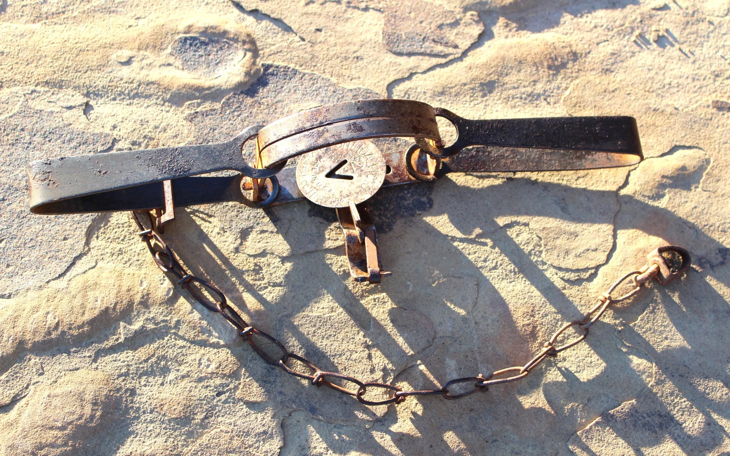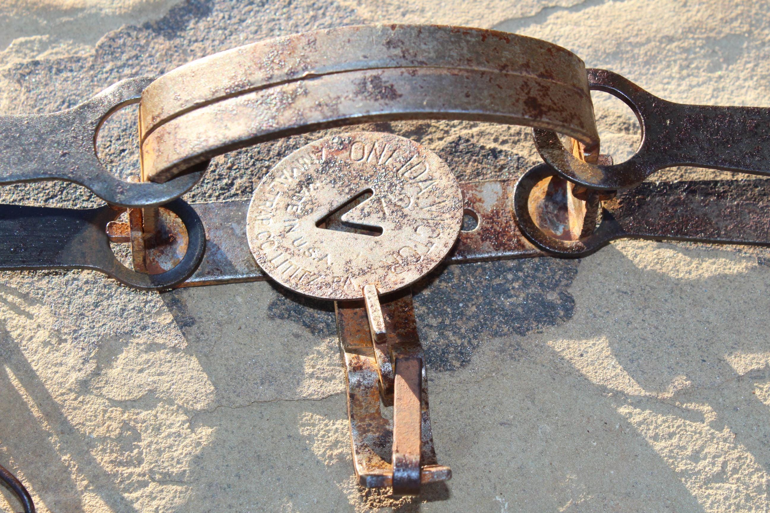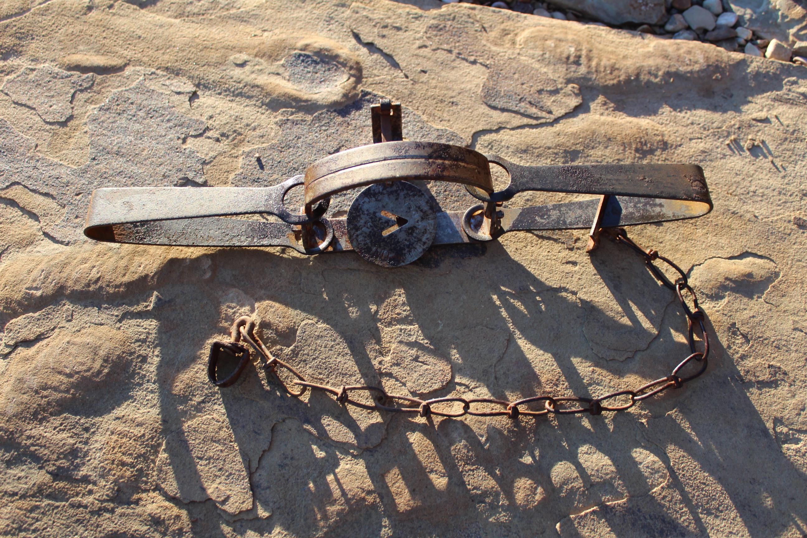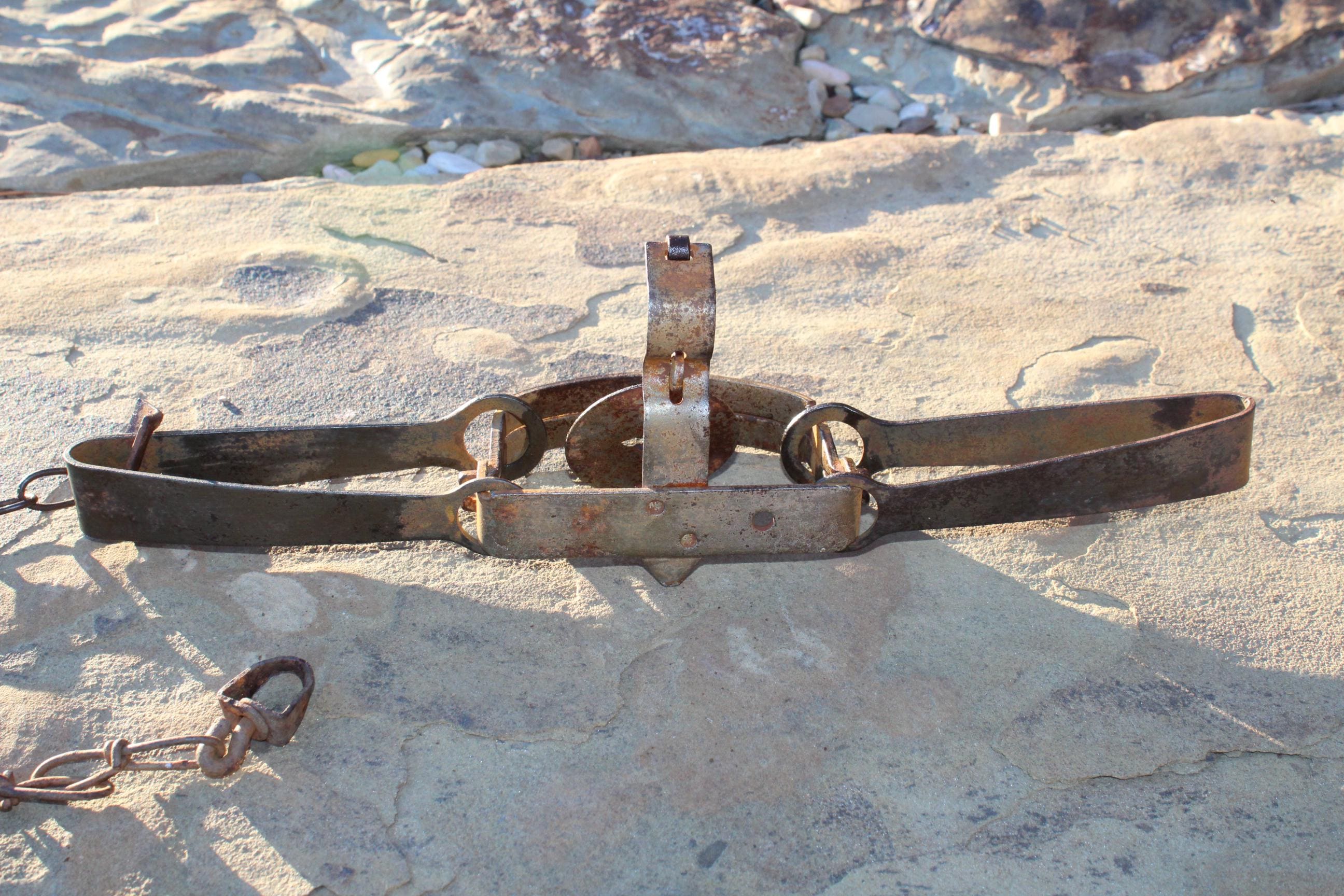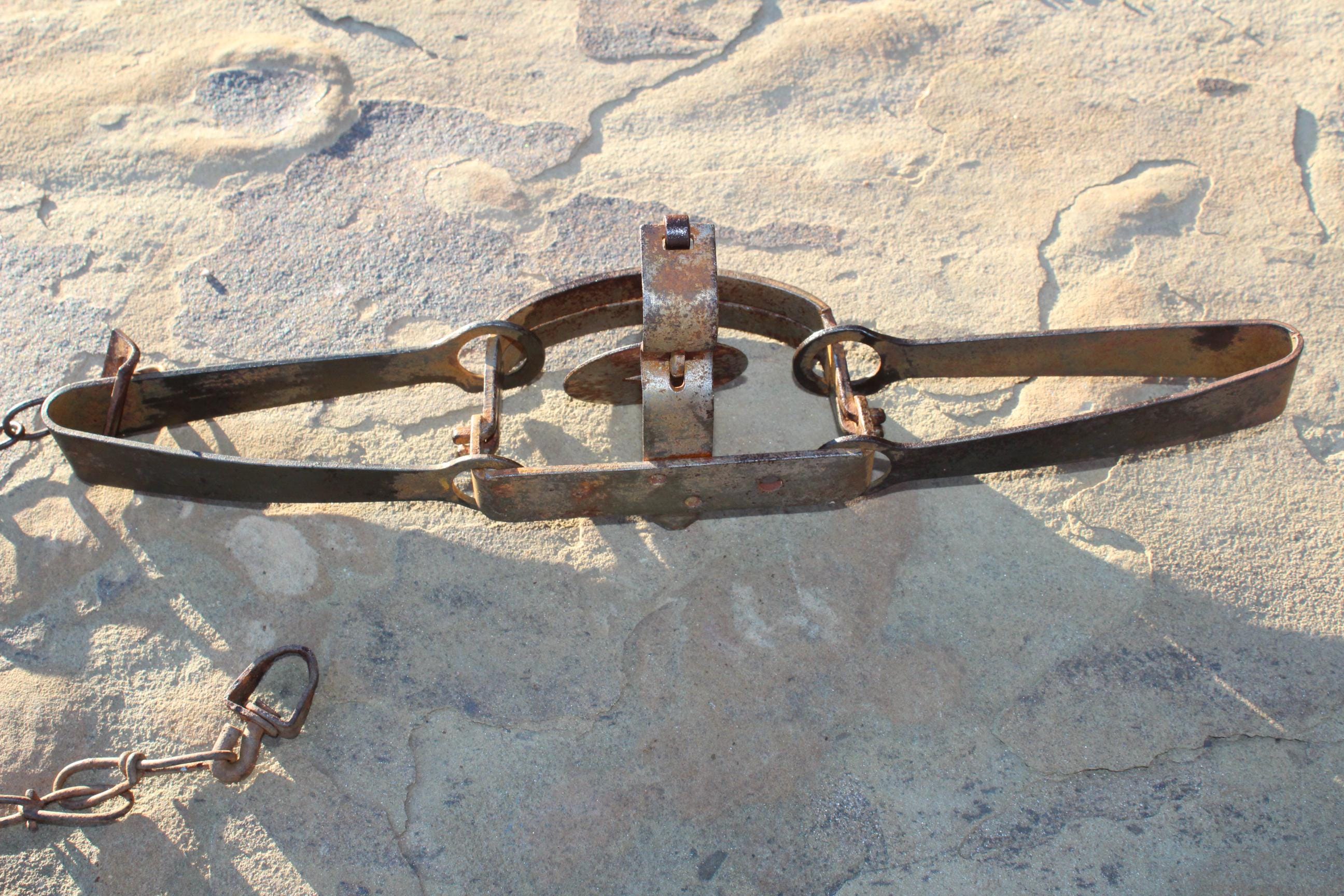 The #2 double long spring trap made by Victor Oneida. This size tarp would be for medium-sized animals such as Beaver, Mink, and Muskrat. The trap is in fair condition with strong springs; the trap is 15 ½ inches long.