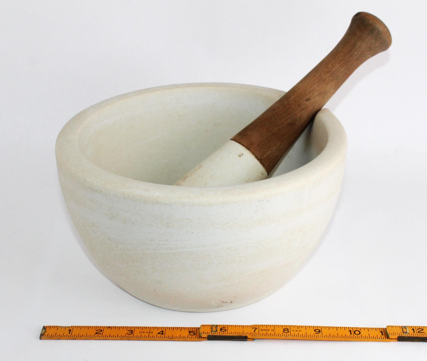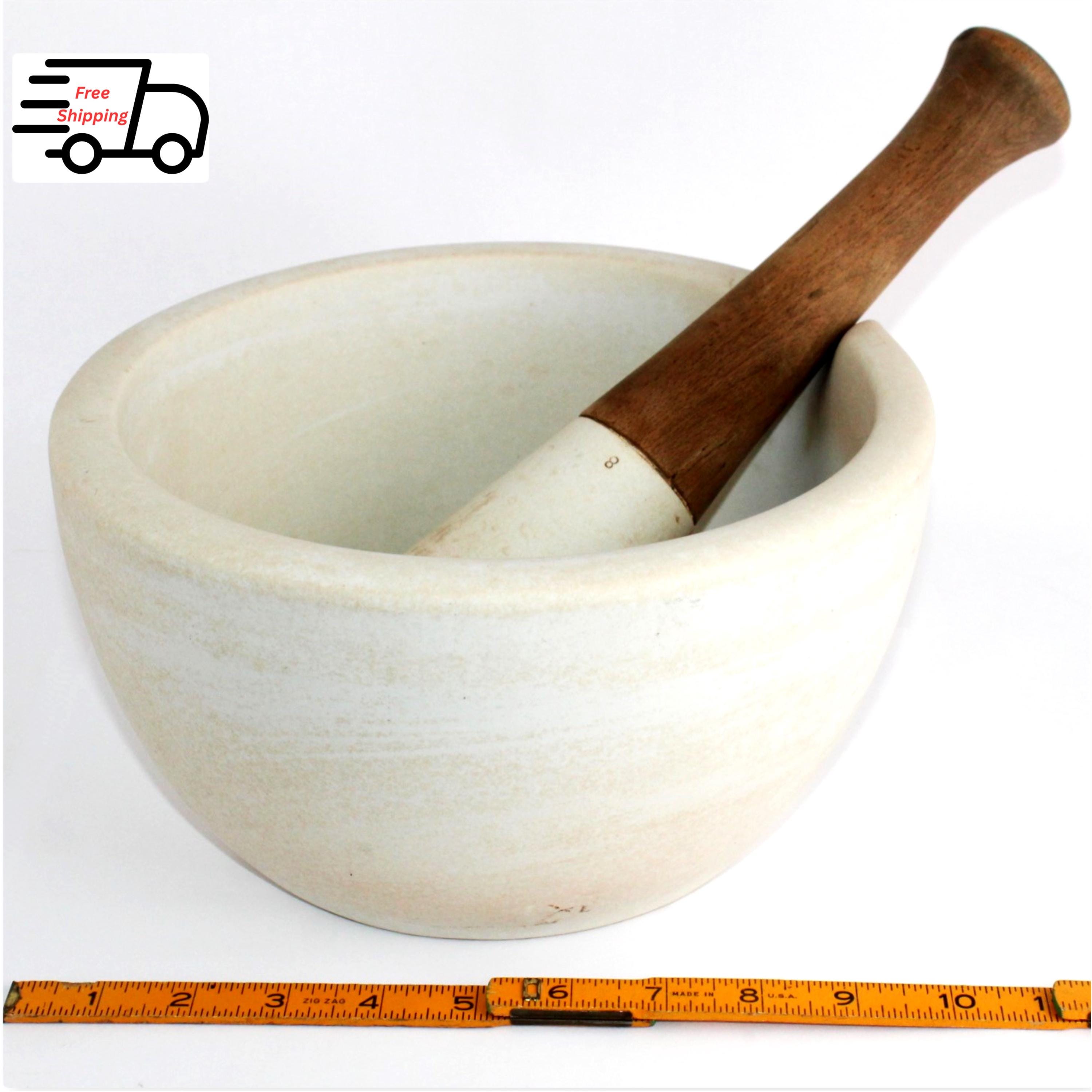 This is a larger Mortar & Pestle Mortar, measures 10” in diameter at the top rim and 5¼” outside height. Pestle measures 11¼” long, 2½” in diameter. Weigh 12.9 pounds.