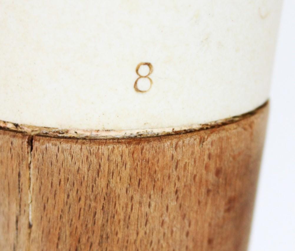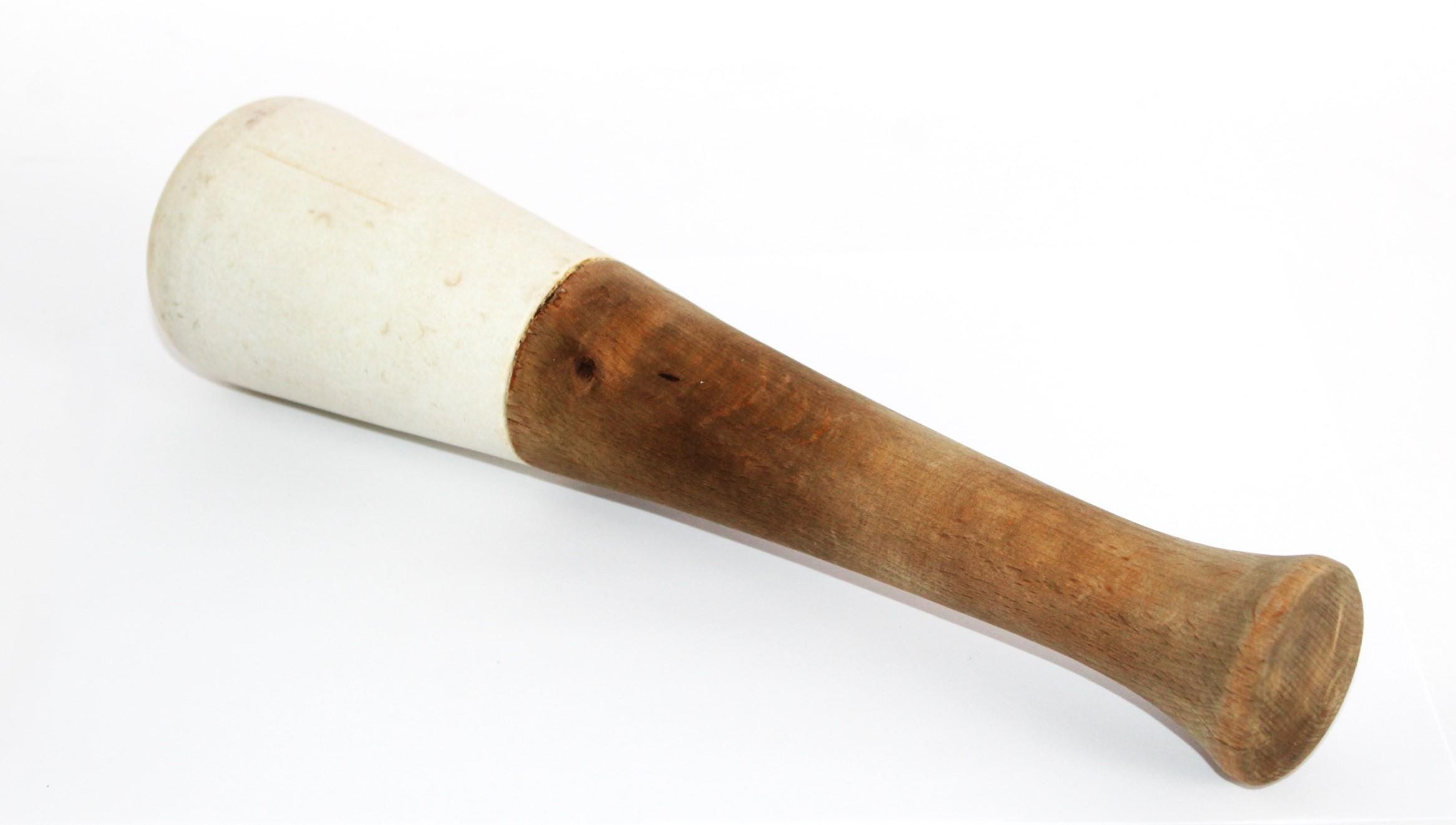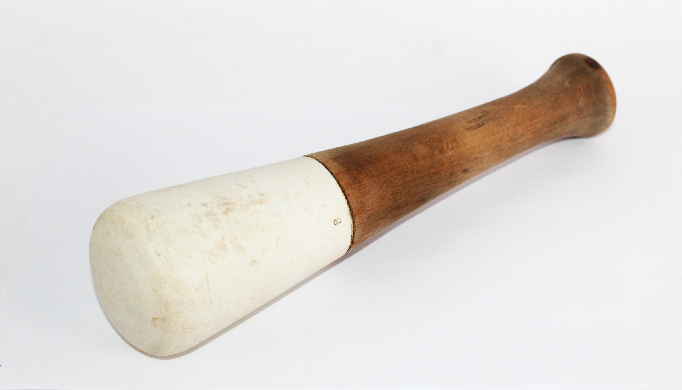 This is a #7 porcelain mortar and embossed with the maker's mark Thos Maddock & Sons Co. on the base. The Pestle is also made of porcelain with a wood handle and marked #8.