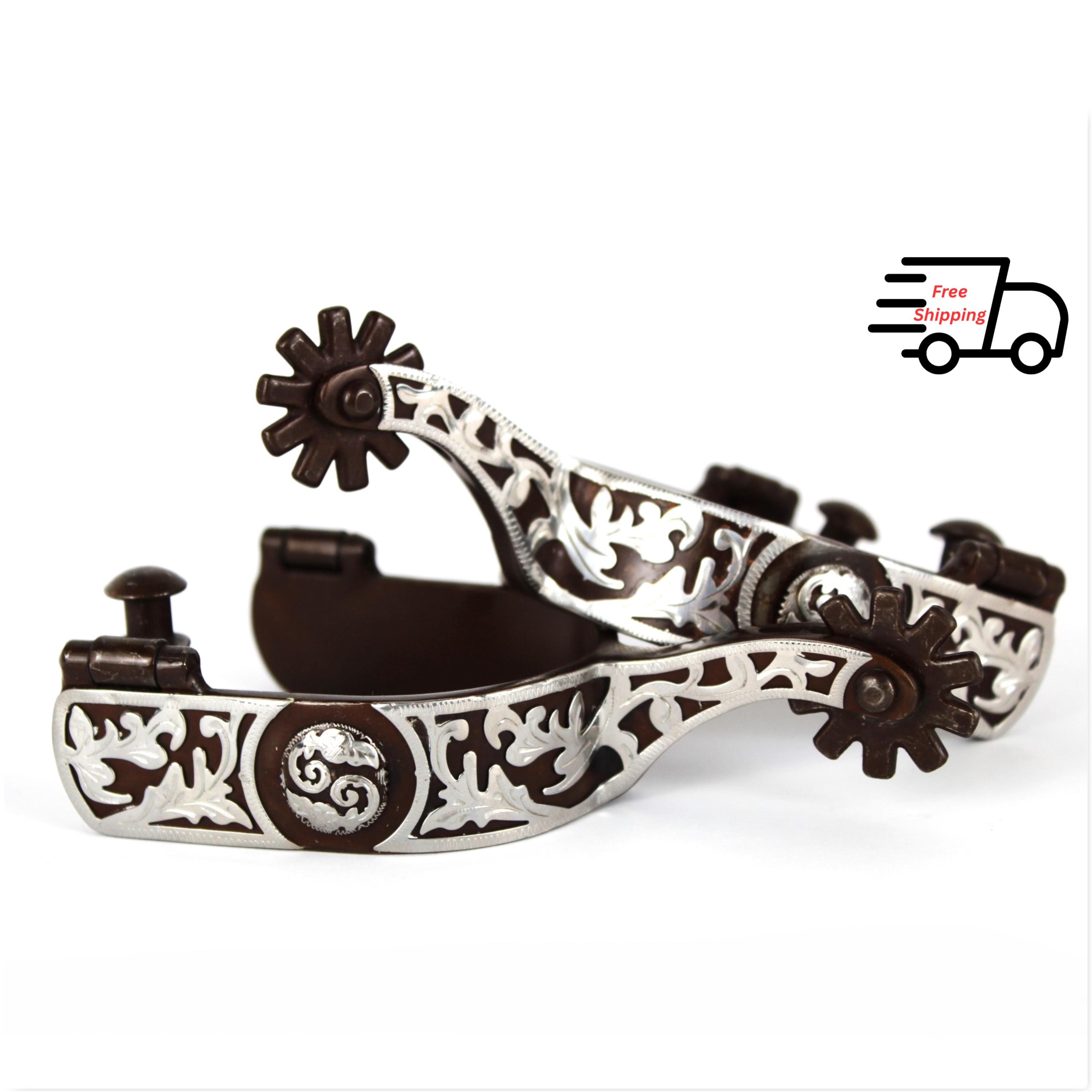 Wonderful heavy-duty western spurs finished in a flat brown color finish and a silver overlay scroll Oak Leaf scene.