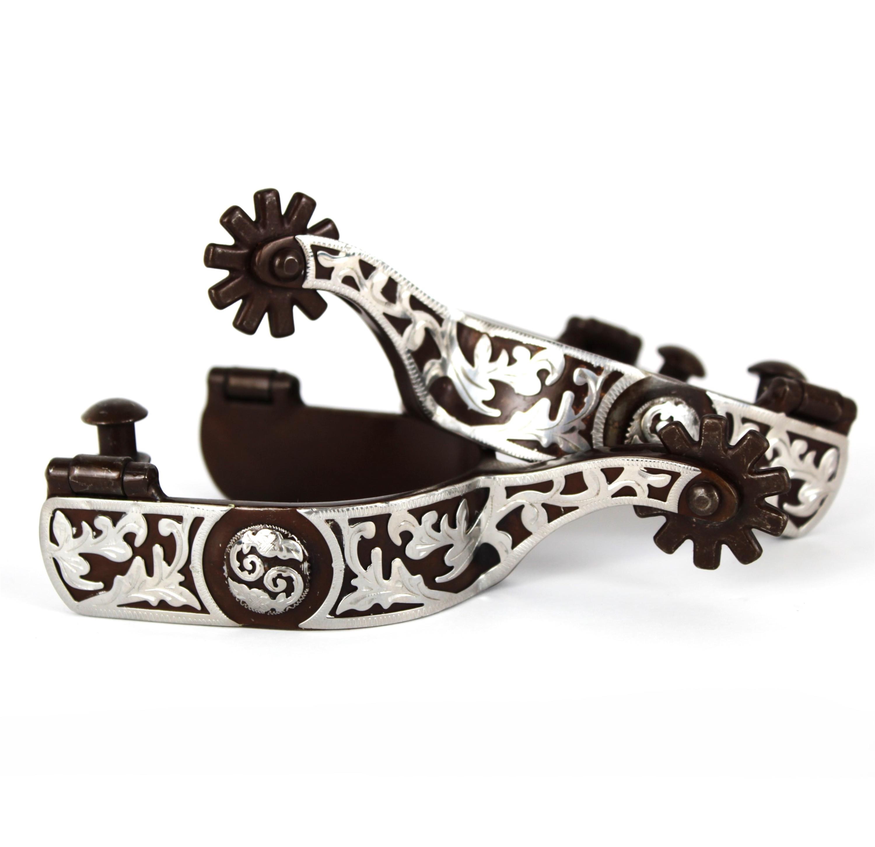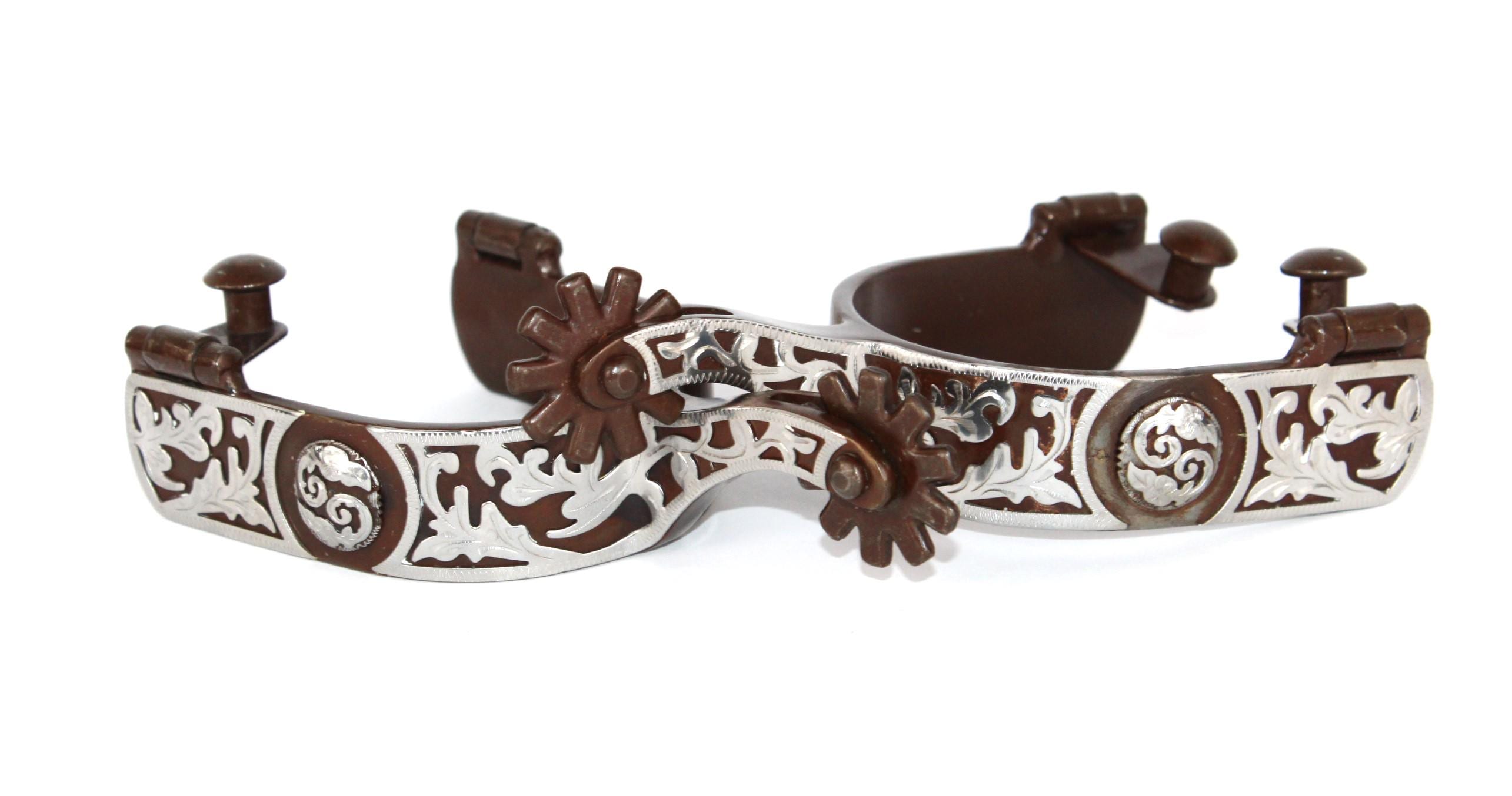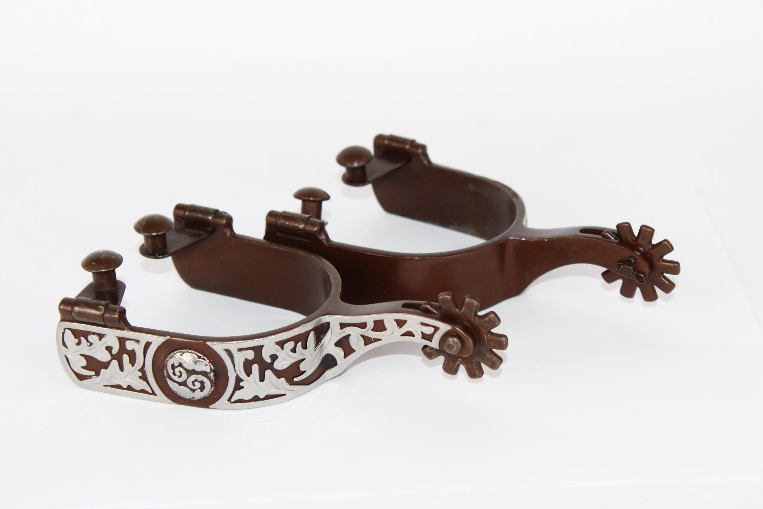Wonderful heavy-duty western spurs finished in a flat brown color finish and a silver overlay scroll Oak Leaf scene.