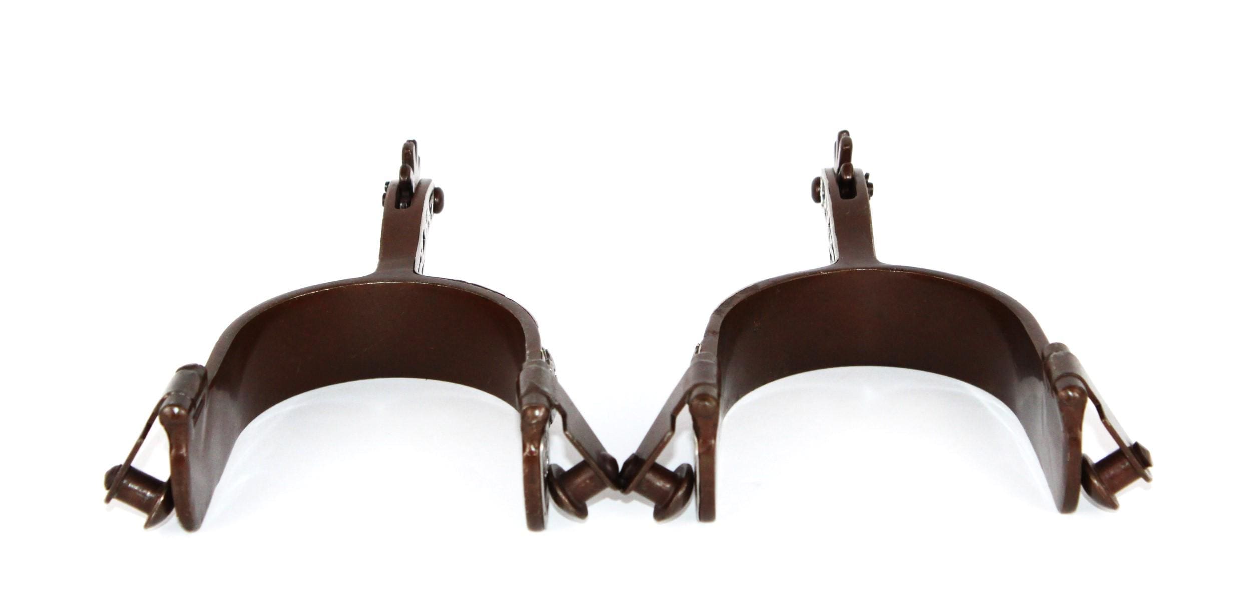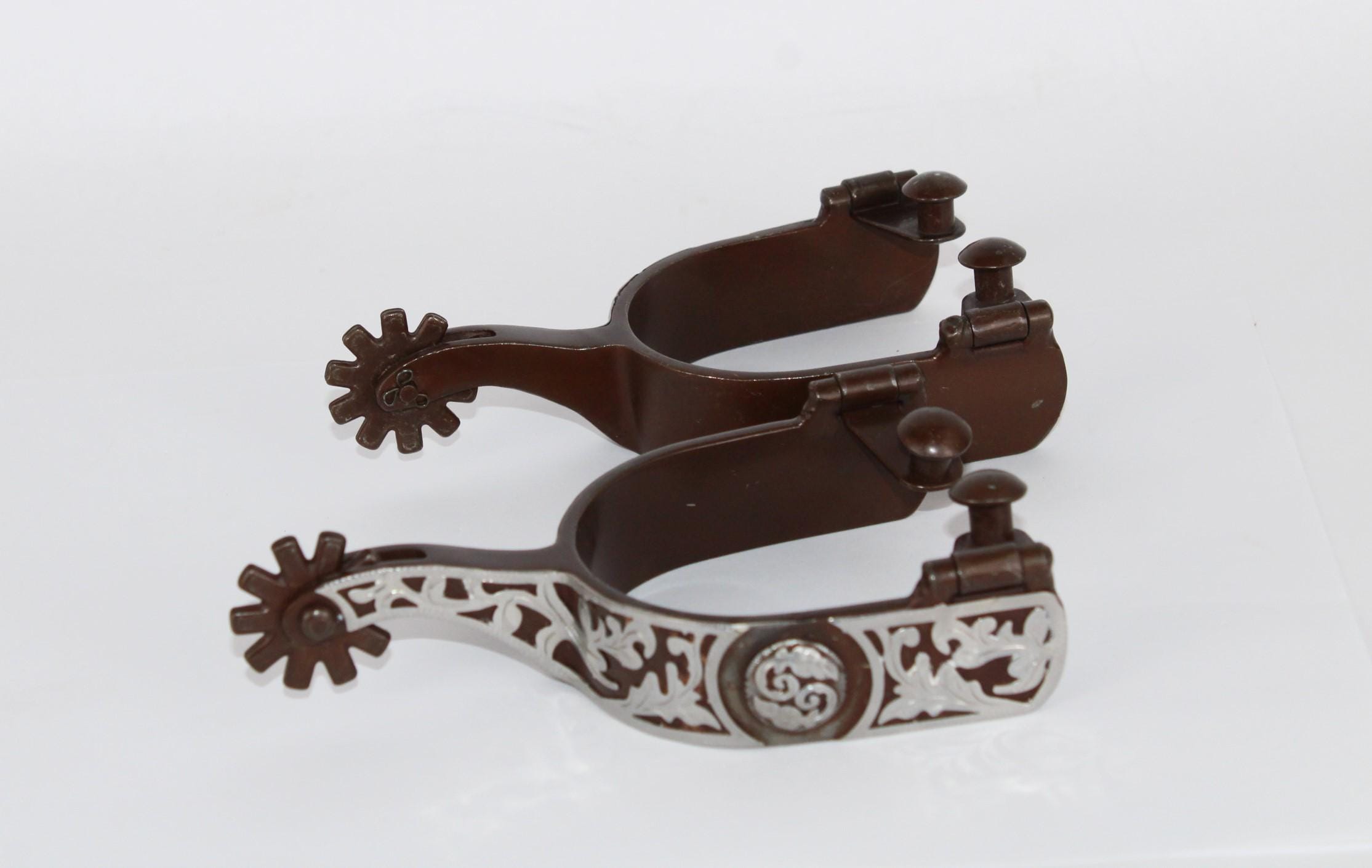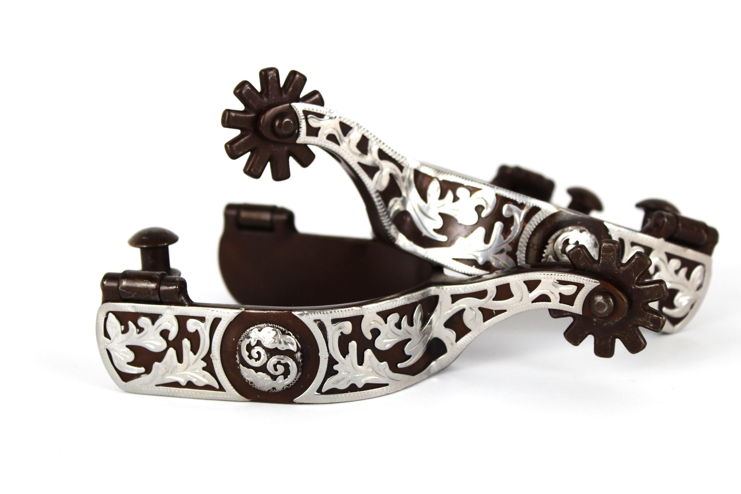 Wonderful heavy-duty western spurs finished in a flat brown color finish and a silver overlay scroll Oak Leaf scene.