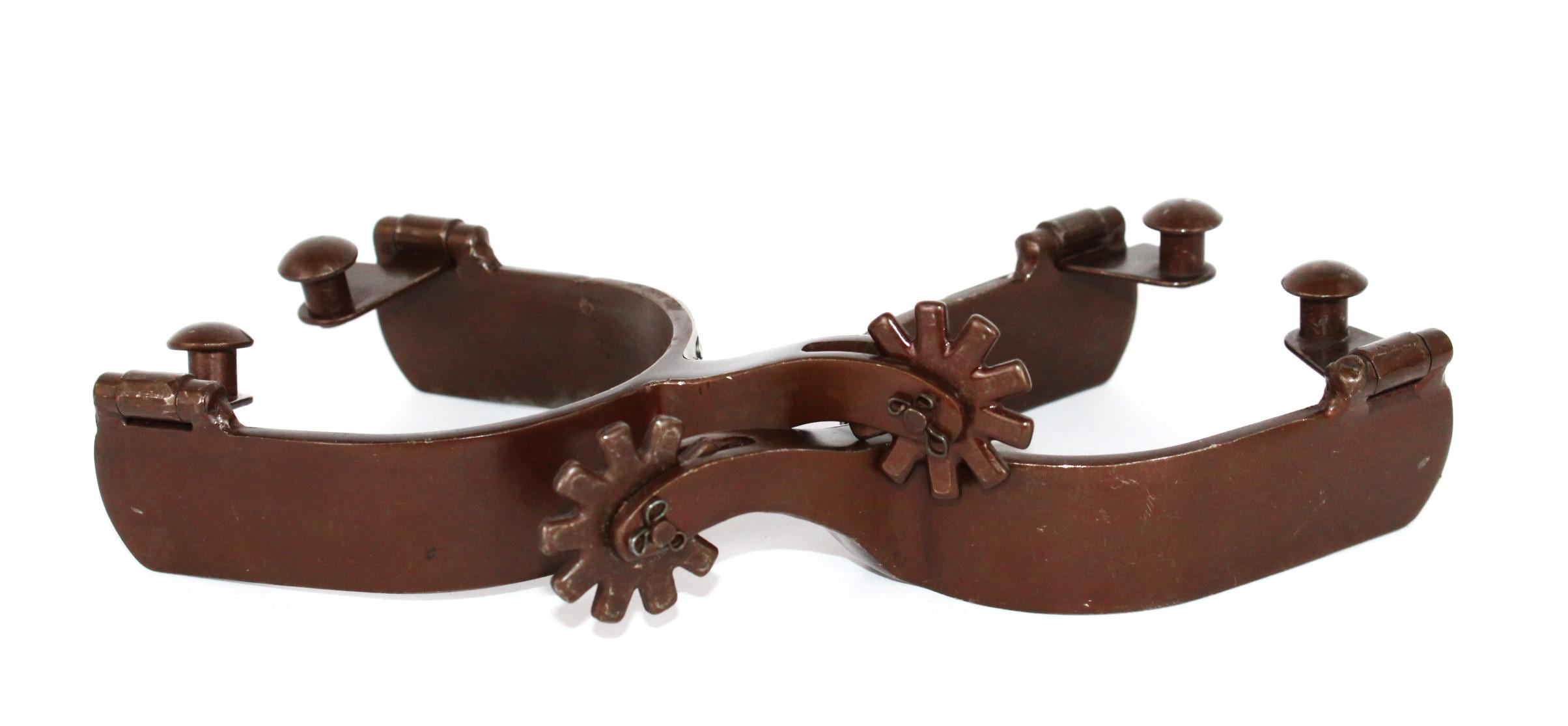 The spurs have a 2¼” shank, with a 1¼” ten-point rowel, heel bands have a 2¾” spread.