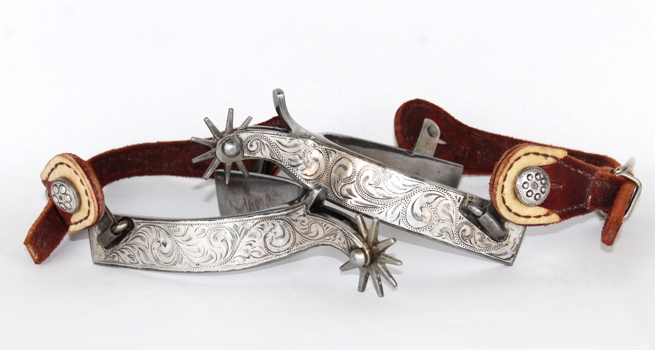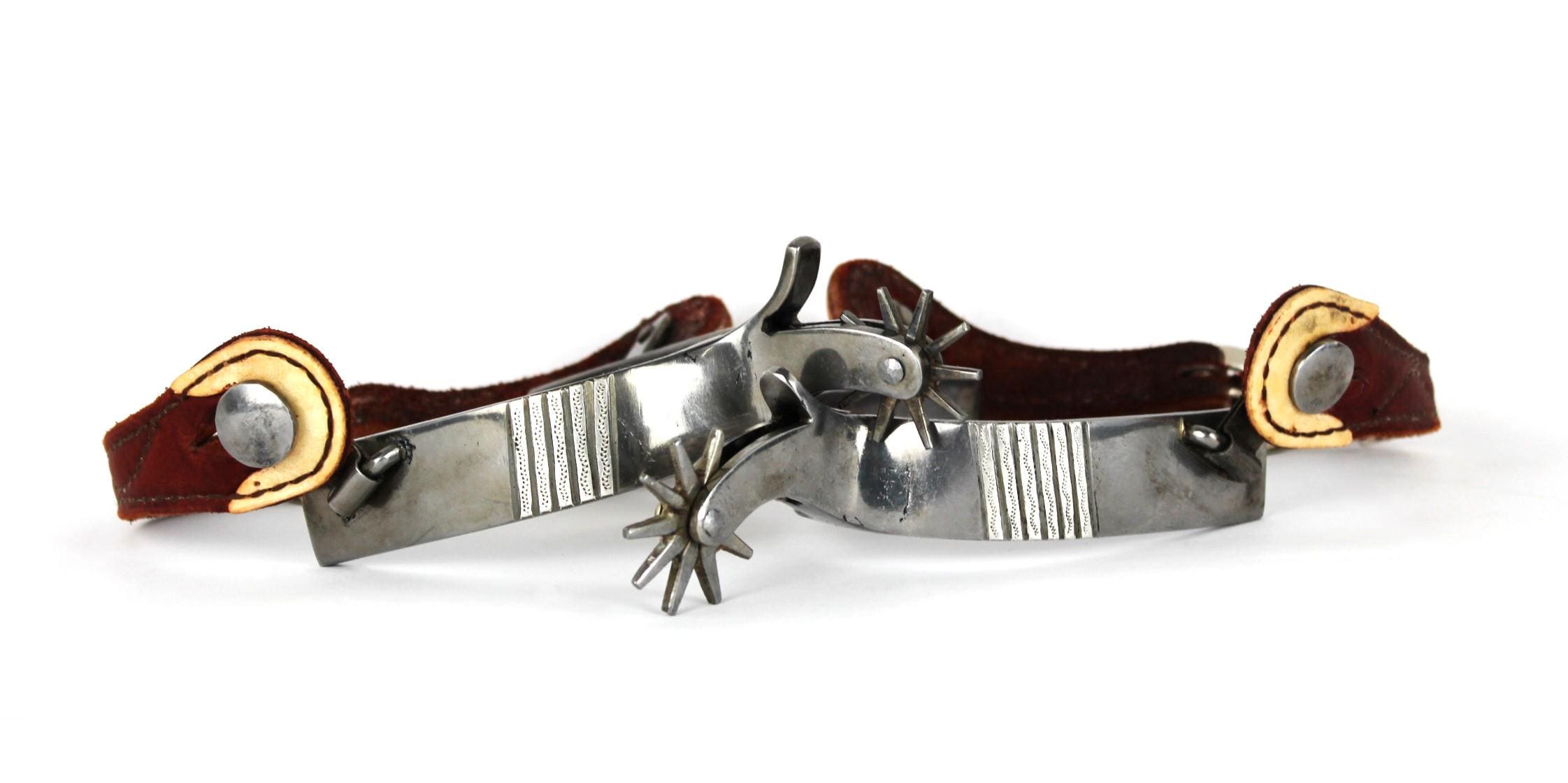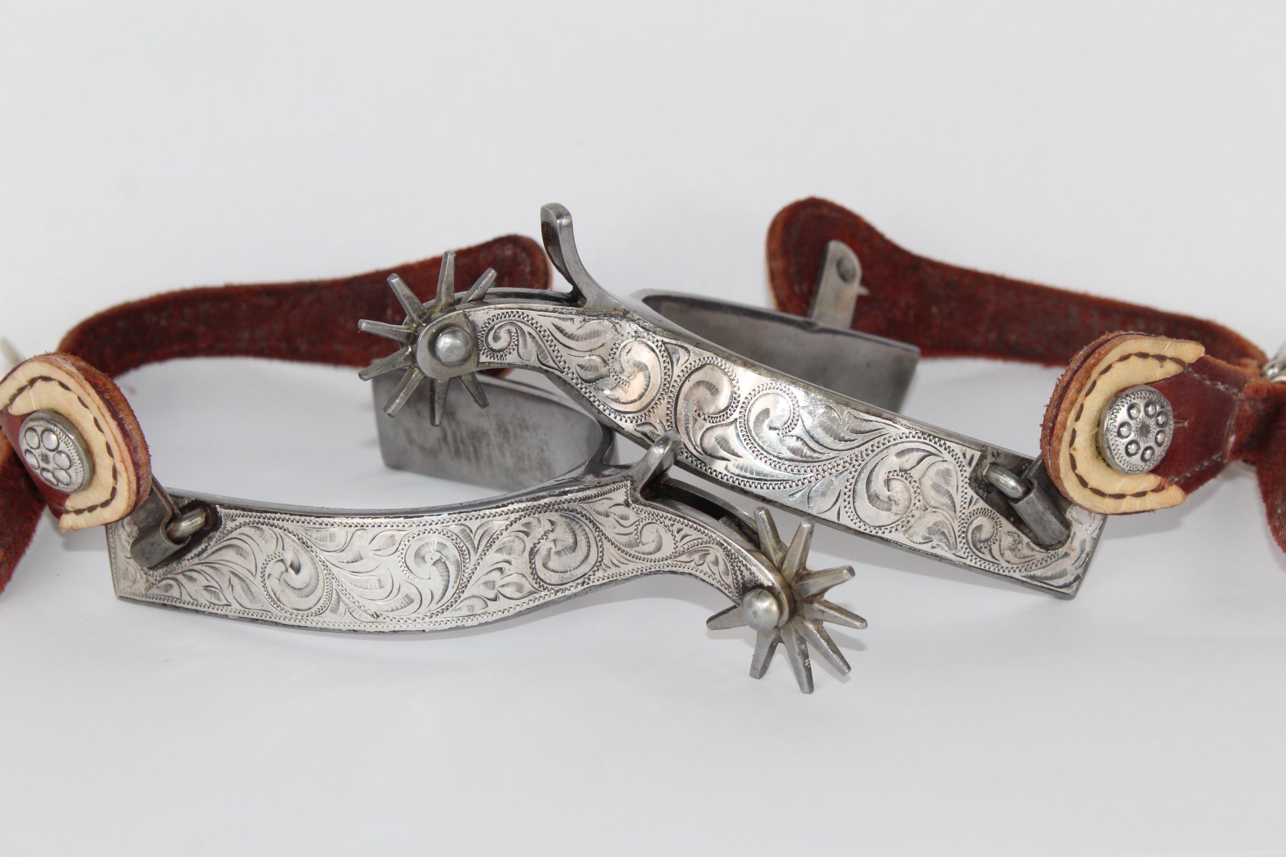 The spurs have a 1¾” drop shank with built-in chap guard, with a 1½” ten-point rowel; the heel bands have a 3” spread. The leather straps are pliable and in very nice condition.