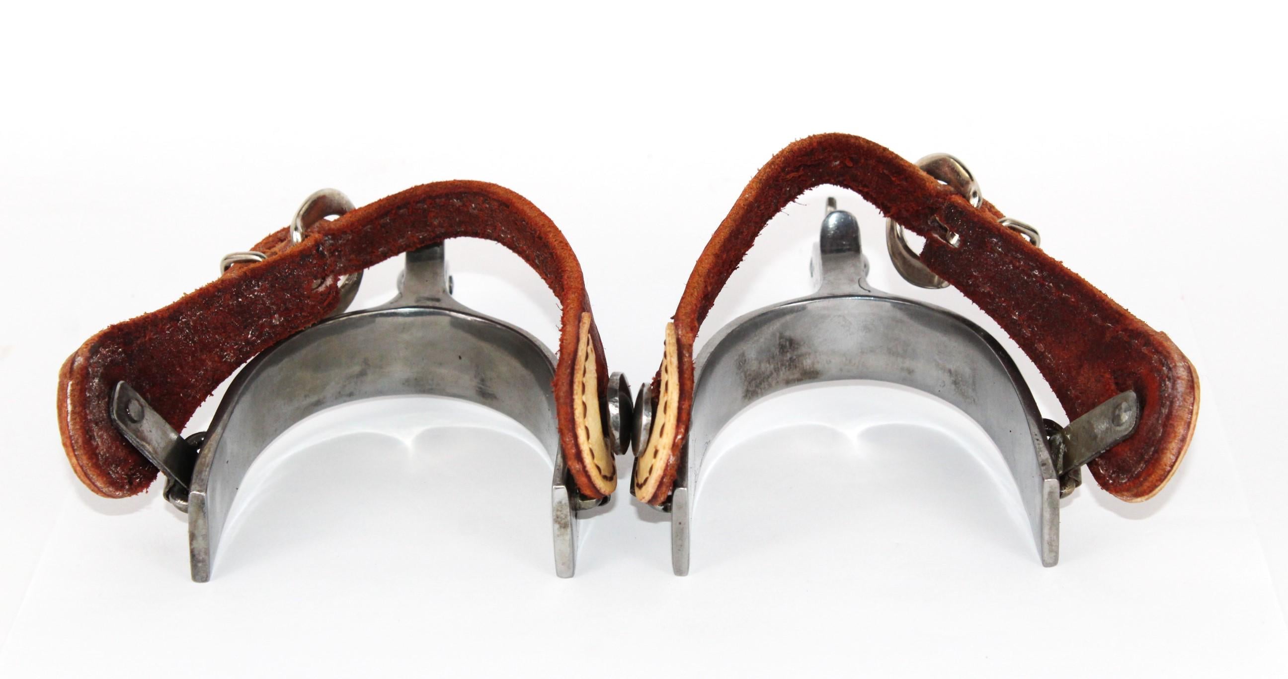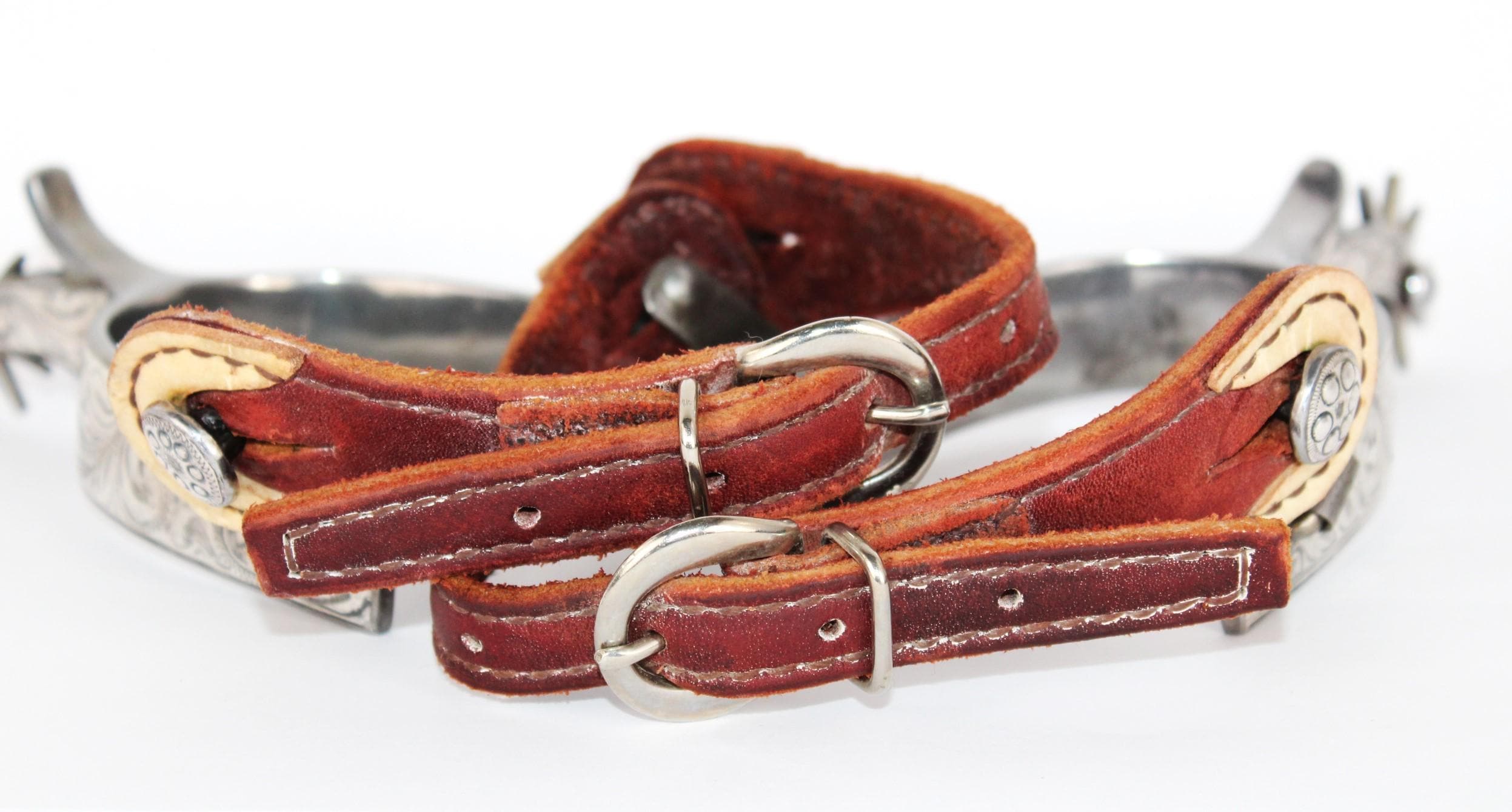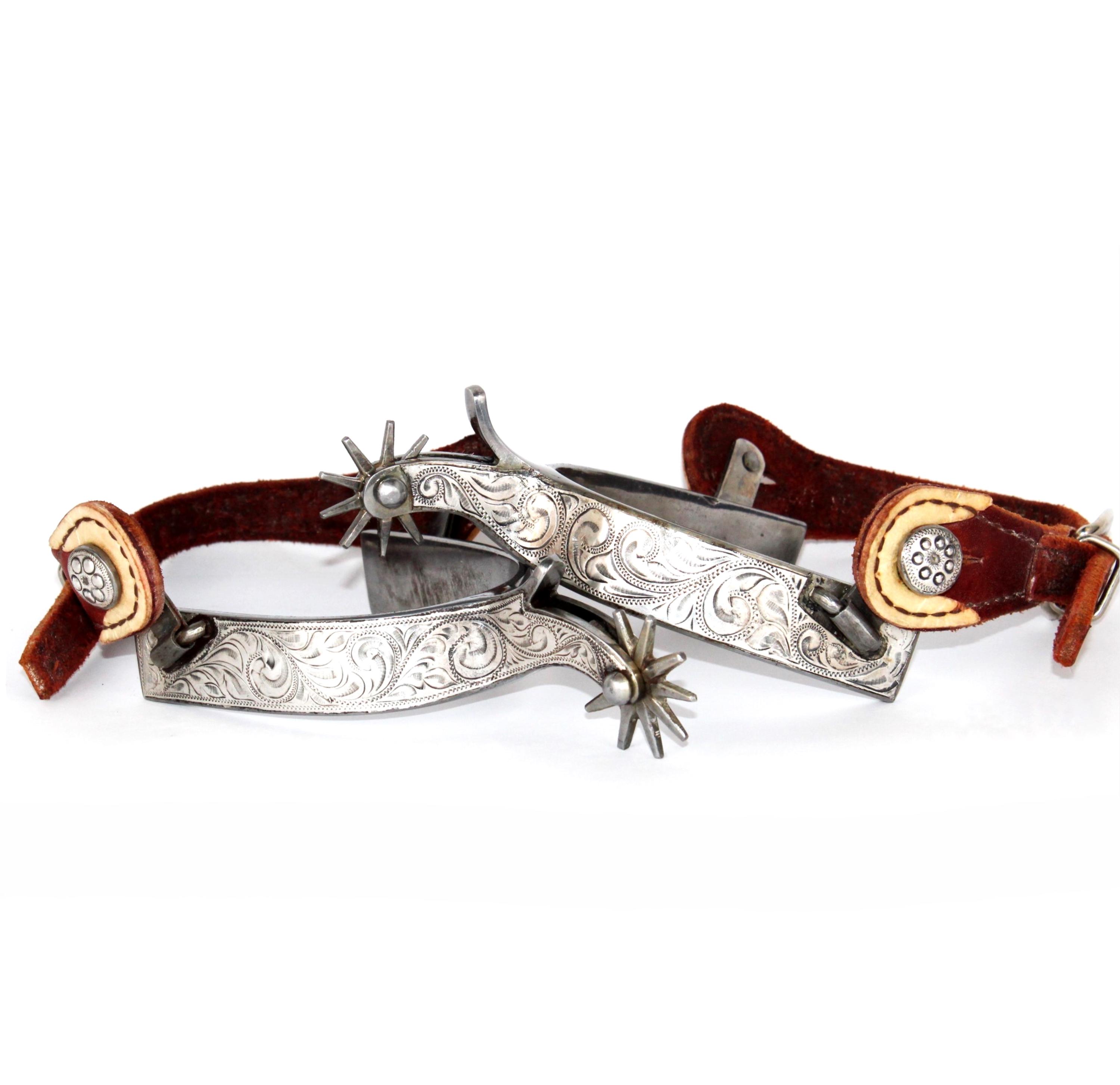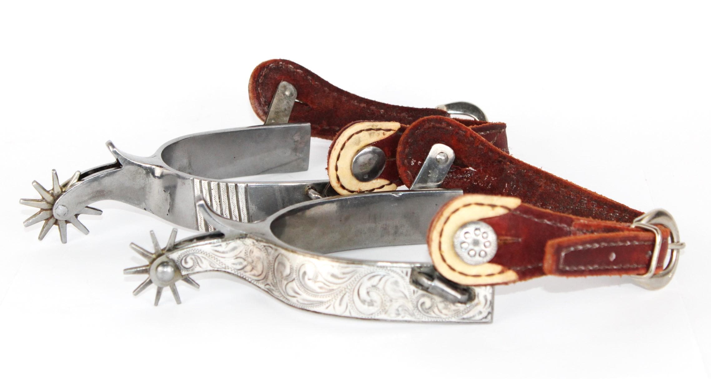 The spurs have a 1¾” drop shank with built-in chap guard, with a 1½” ten-point rowel; the heel bands have a 3” spread. The leather straps are pliable and in very nice condition.