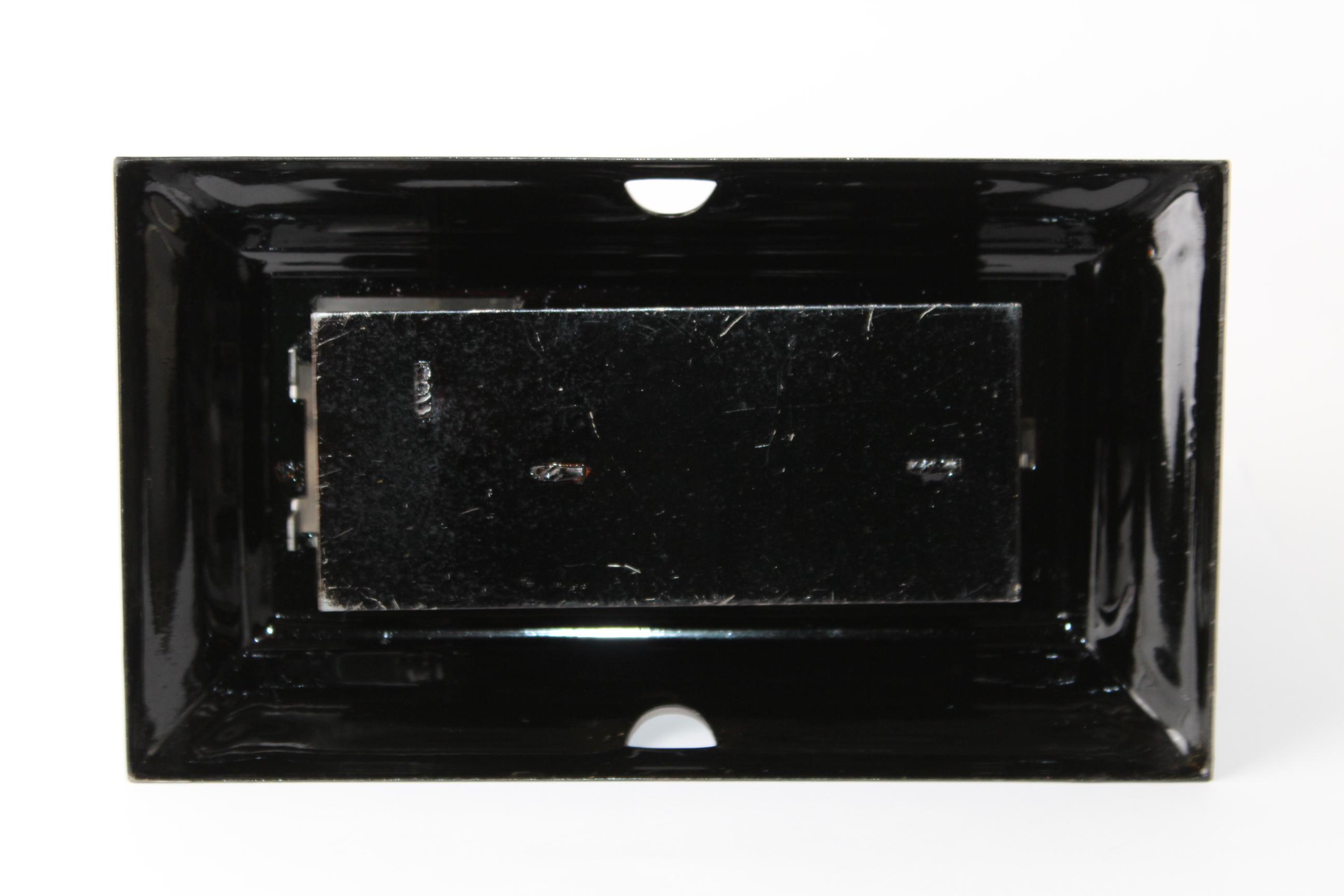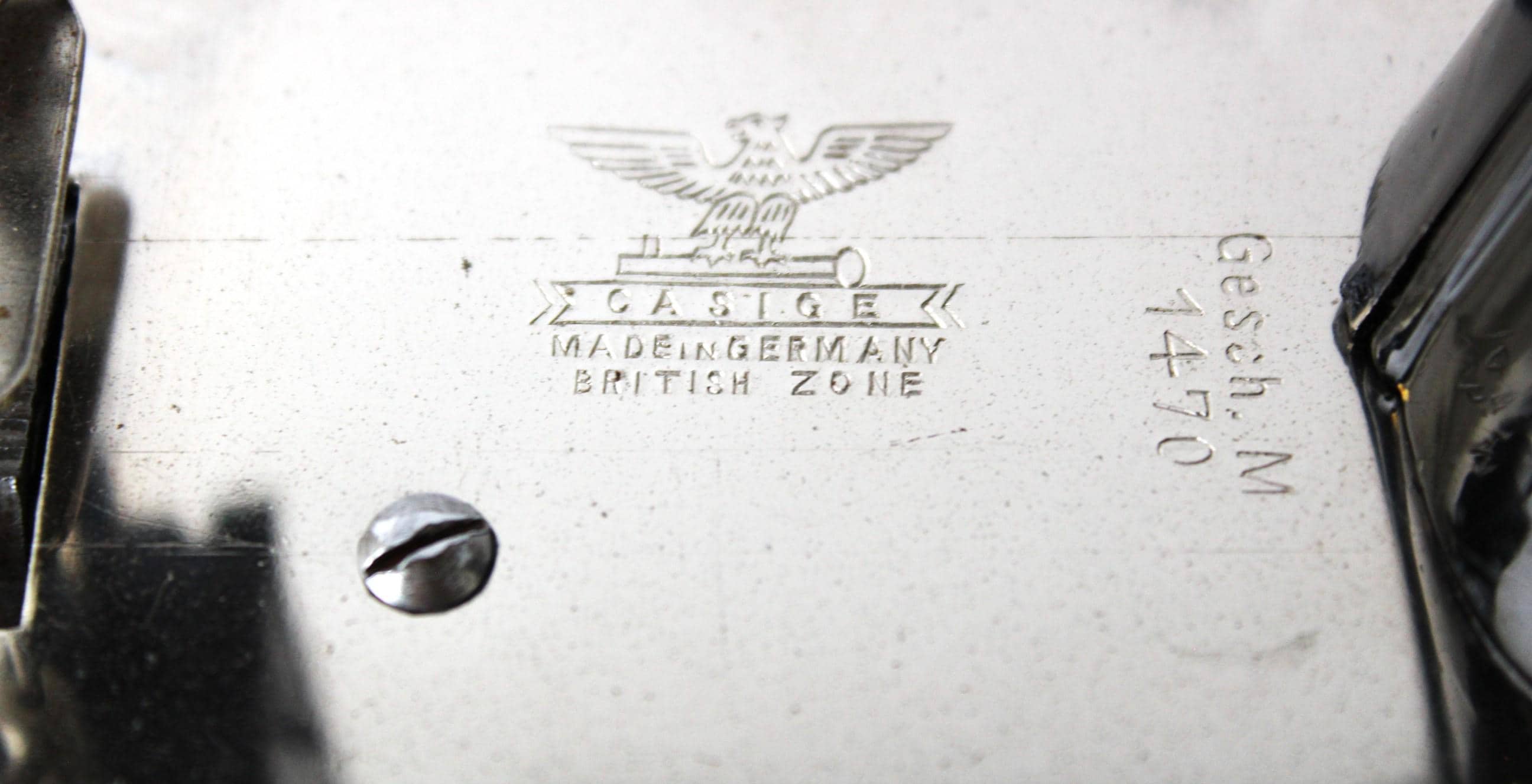 Engraved on the silver sewing plate is an eagle and Casige Made in Germany British Zone. Color is gloss black on the base, with a wonderful Art Deco design. Comes with original box, hold-down clamp, small screwdriver, instruction manual in English, French, German, and Spanish, original thread (worn), and spool felt (cardboard).