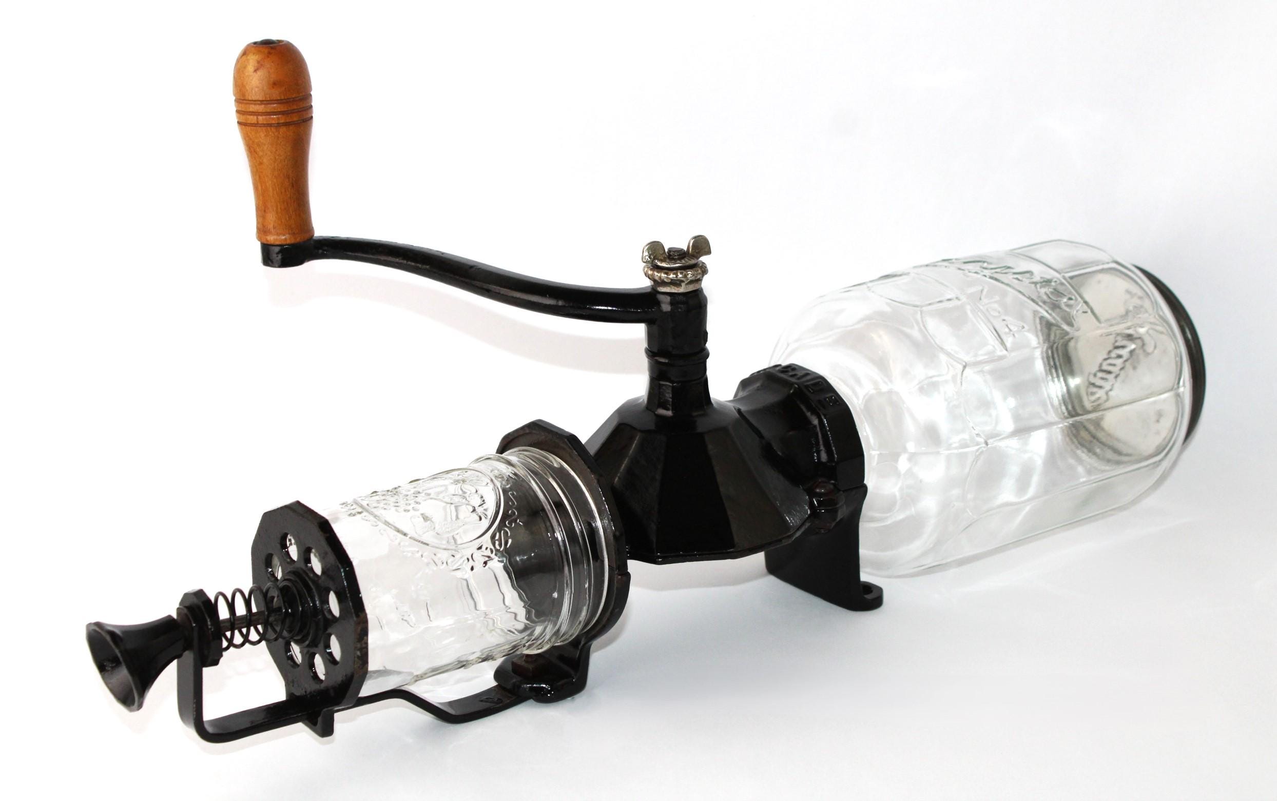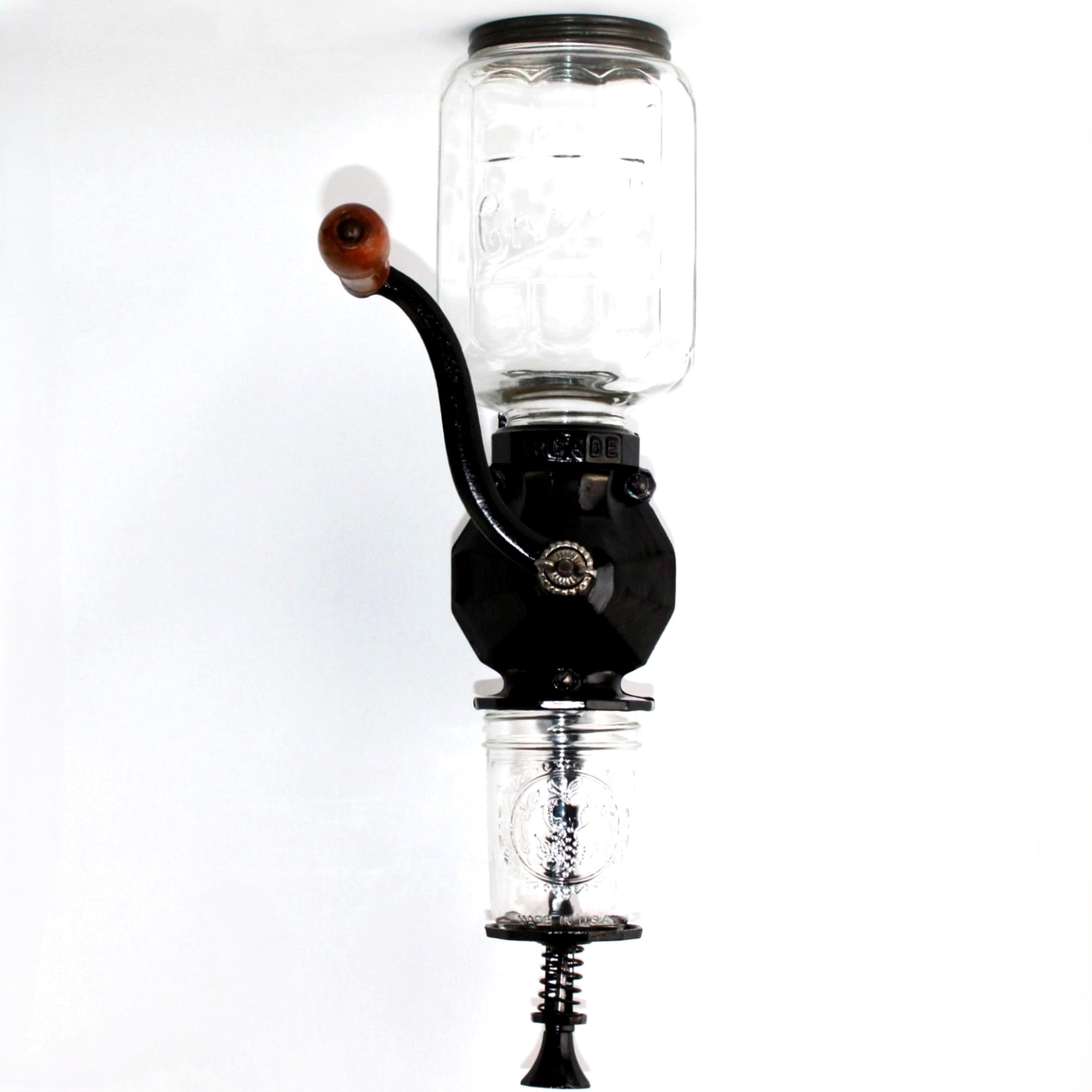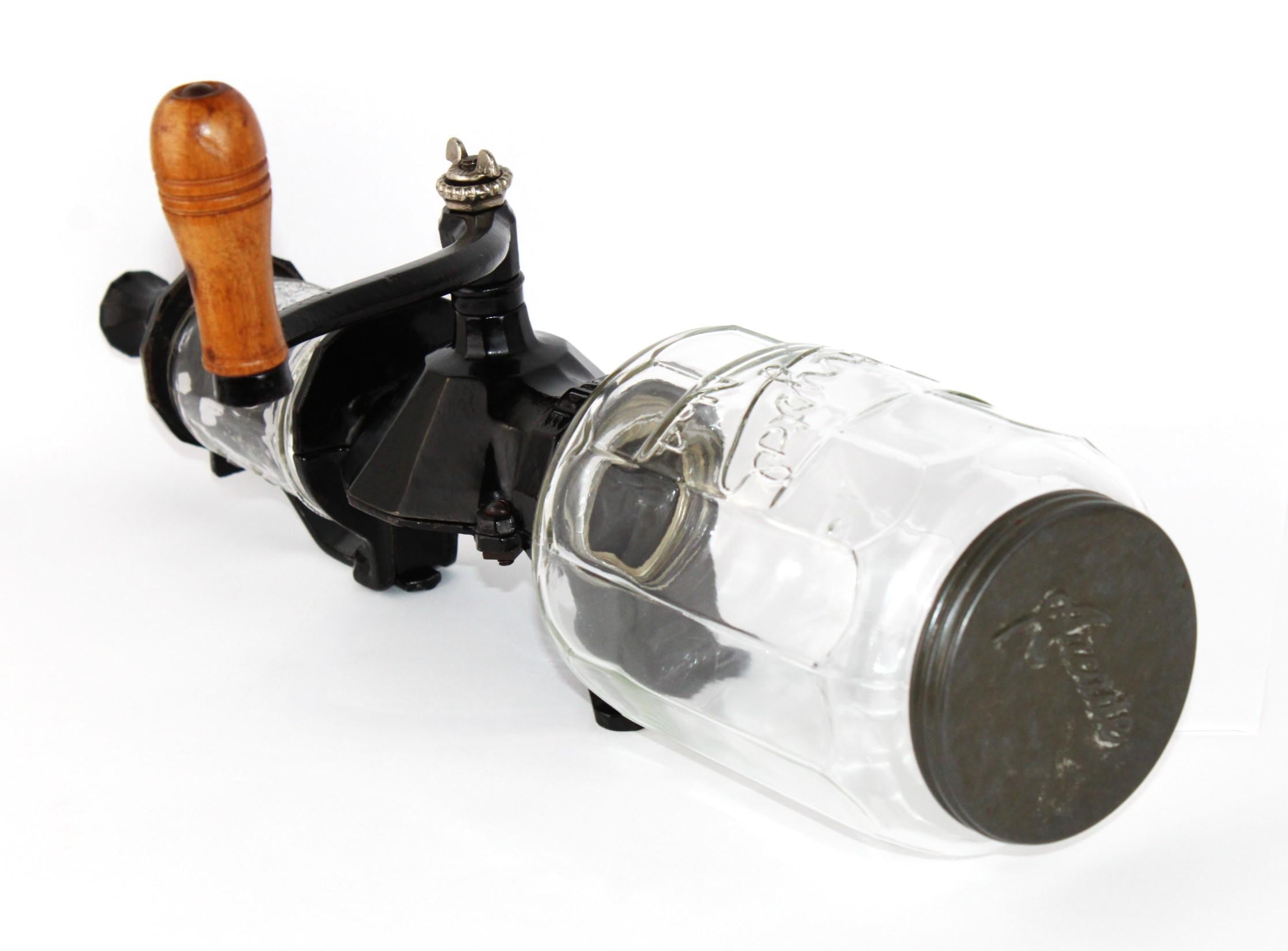 Arcade grinders are very well made and easy to use, which is the reason they are so sought after. This one is over 100 years old and will easily last a hundred more years. The original catch cup, as usual, was broken a long time ago and replaced with a jelly jar. The glass bean hopper unscrews from the grinder for easy cleaning. Earlier models before 1910 had a fixed bean hopper, which made cleaning difficult.