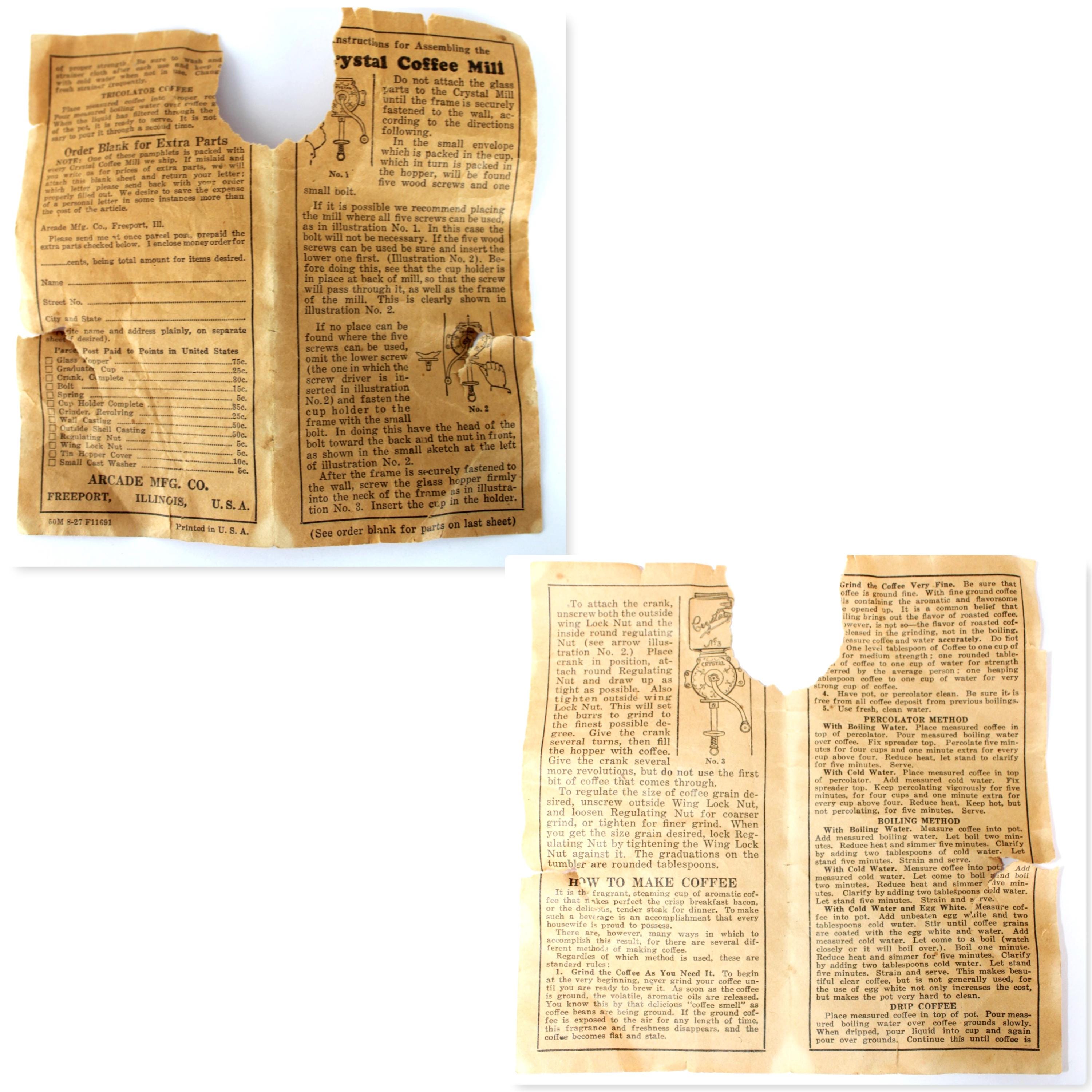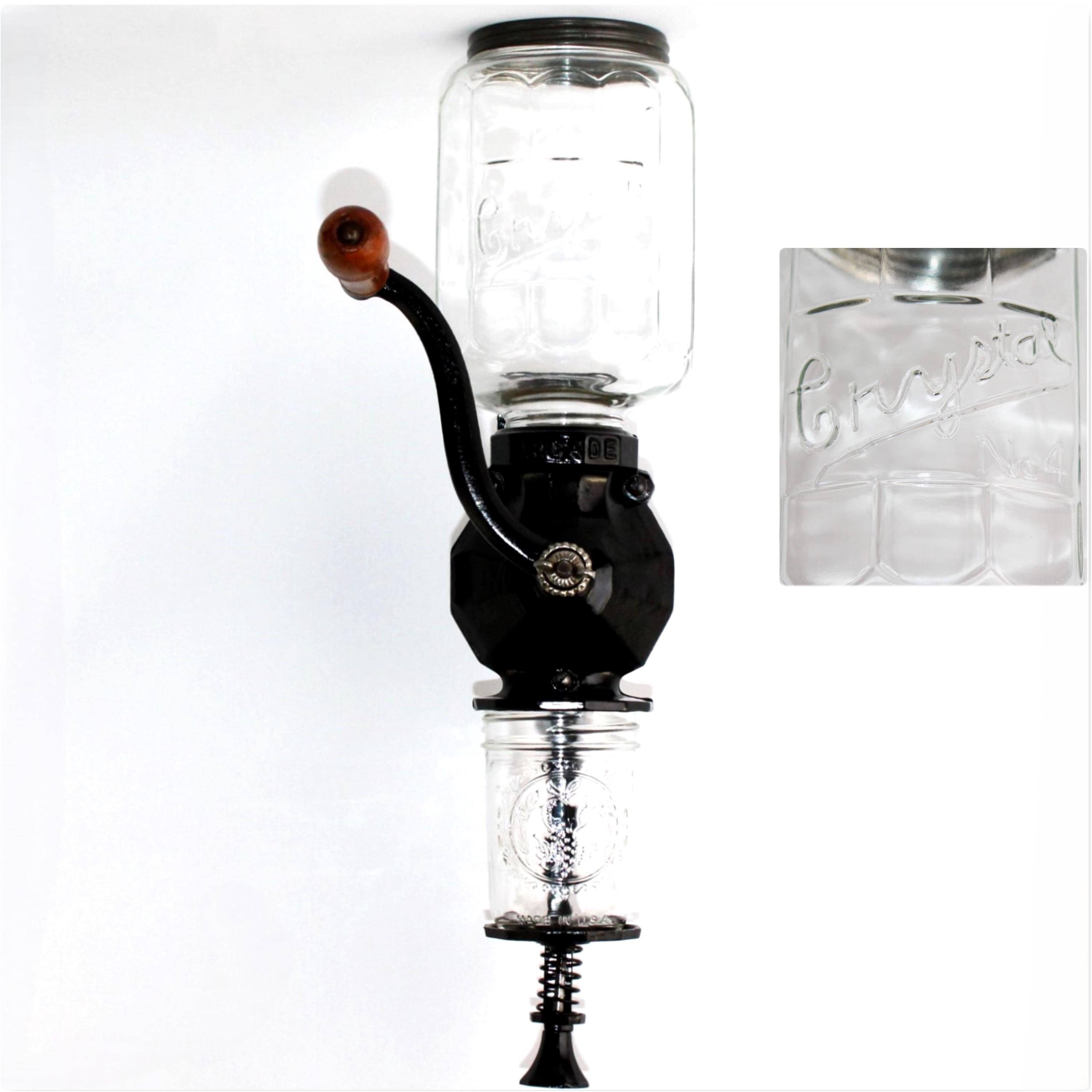 This is the Arcade Crystal number 4 coffee bean grinder. Made by the Arcade Manufacturing Company of Freeport, Illinois. It is made of cast iron with a glass hopper and catch-cup; these would have been found hanging on the wall of your kitchen between 1900 and the 1930s.
