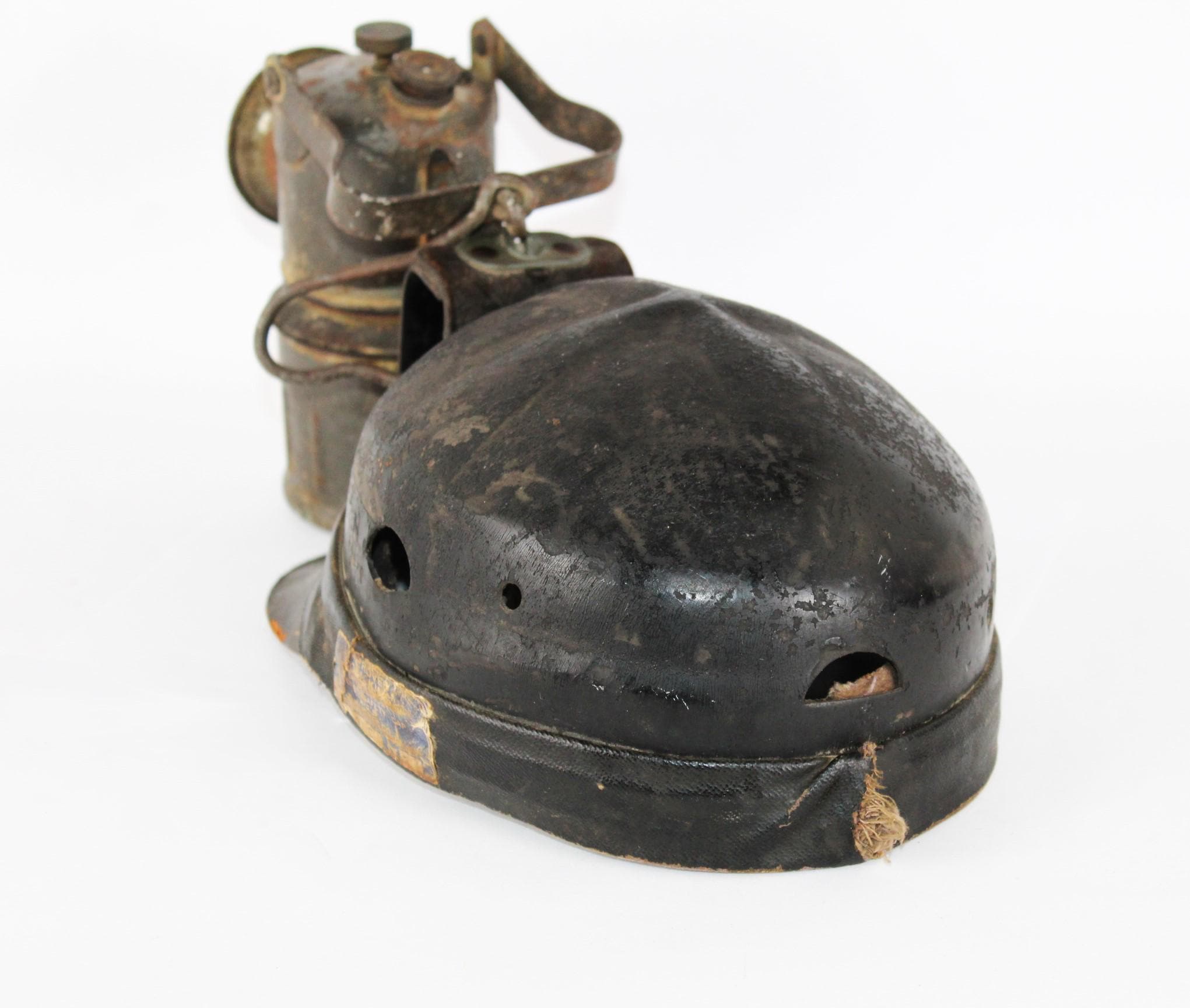 The hat is made of a reinforced Bakelite plastic shell with a thick leather brim and a leather-and-metal lamp bracket on the front. The inside of the shell has a leather band with the Jones Company label on the outer edge. The front bracket holds a larger-sized Justrite carbide lamp. The lantern is metal, not brass. Lantern is marked on top (Justrite, Made in USA).