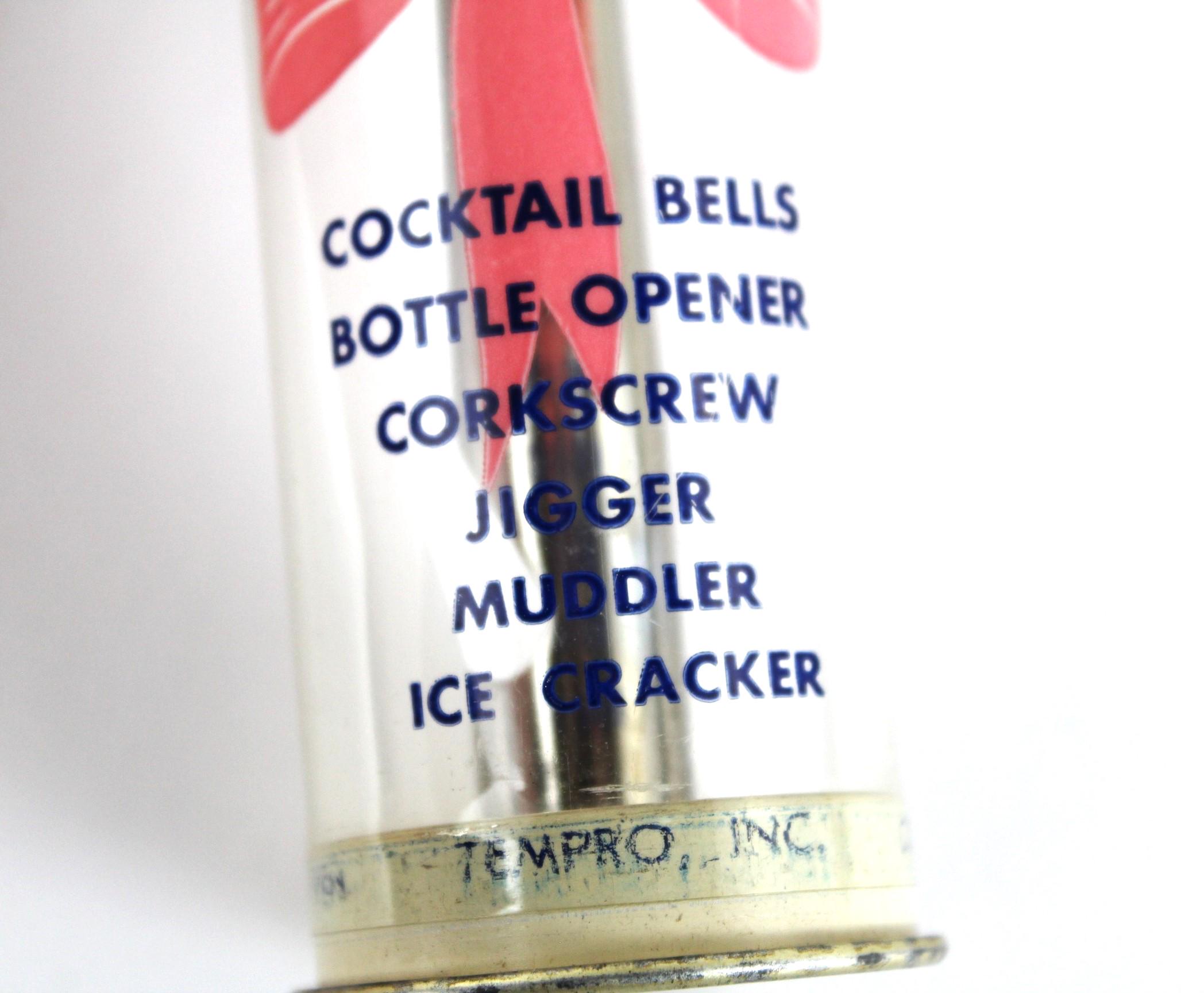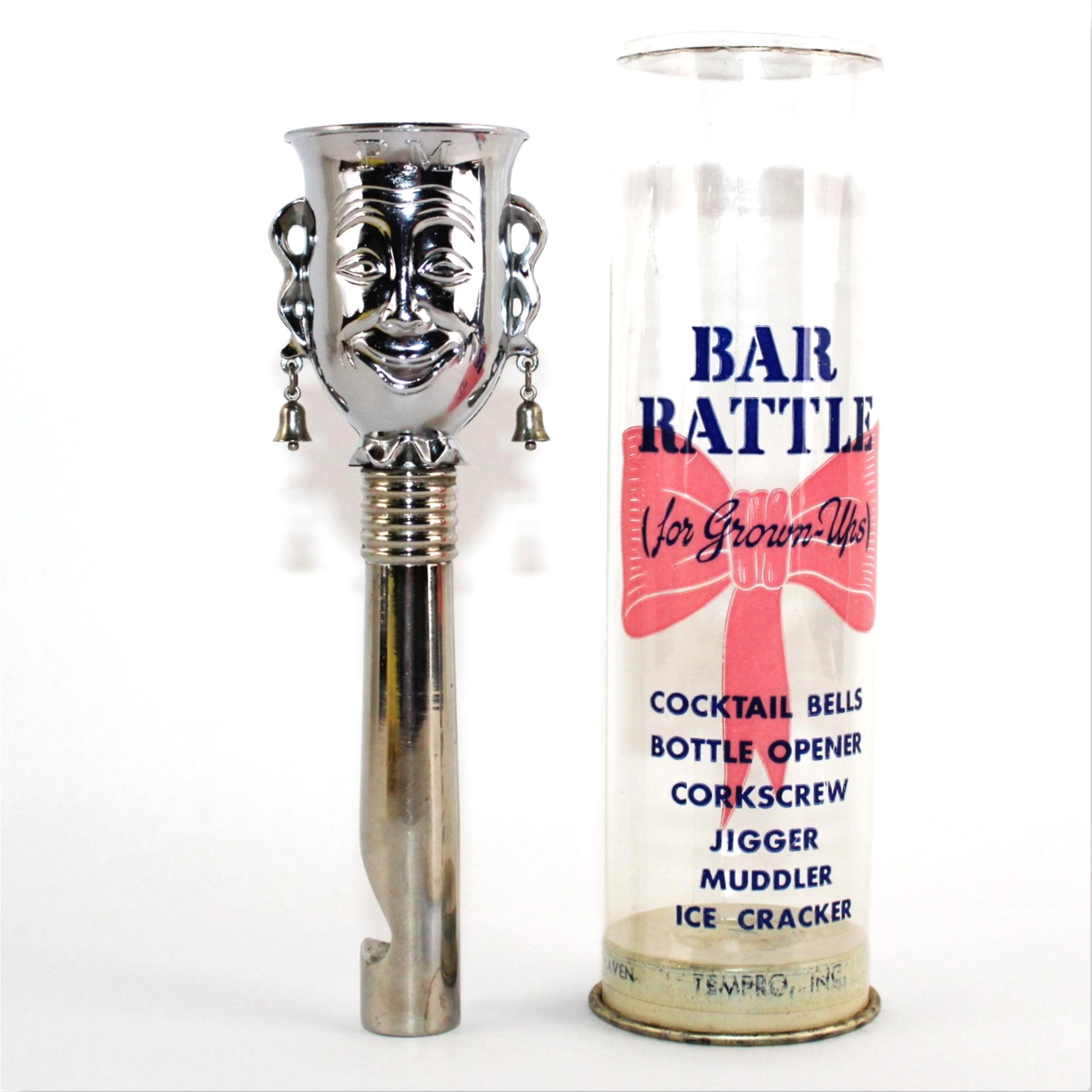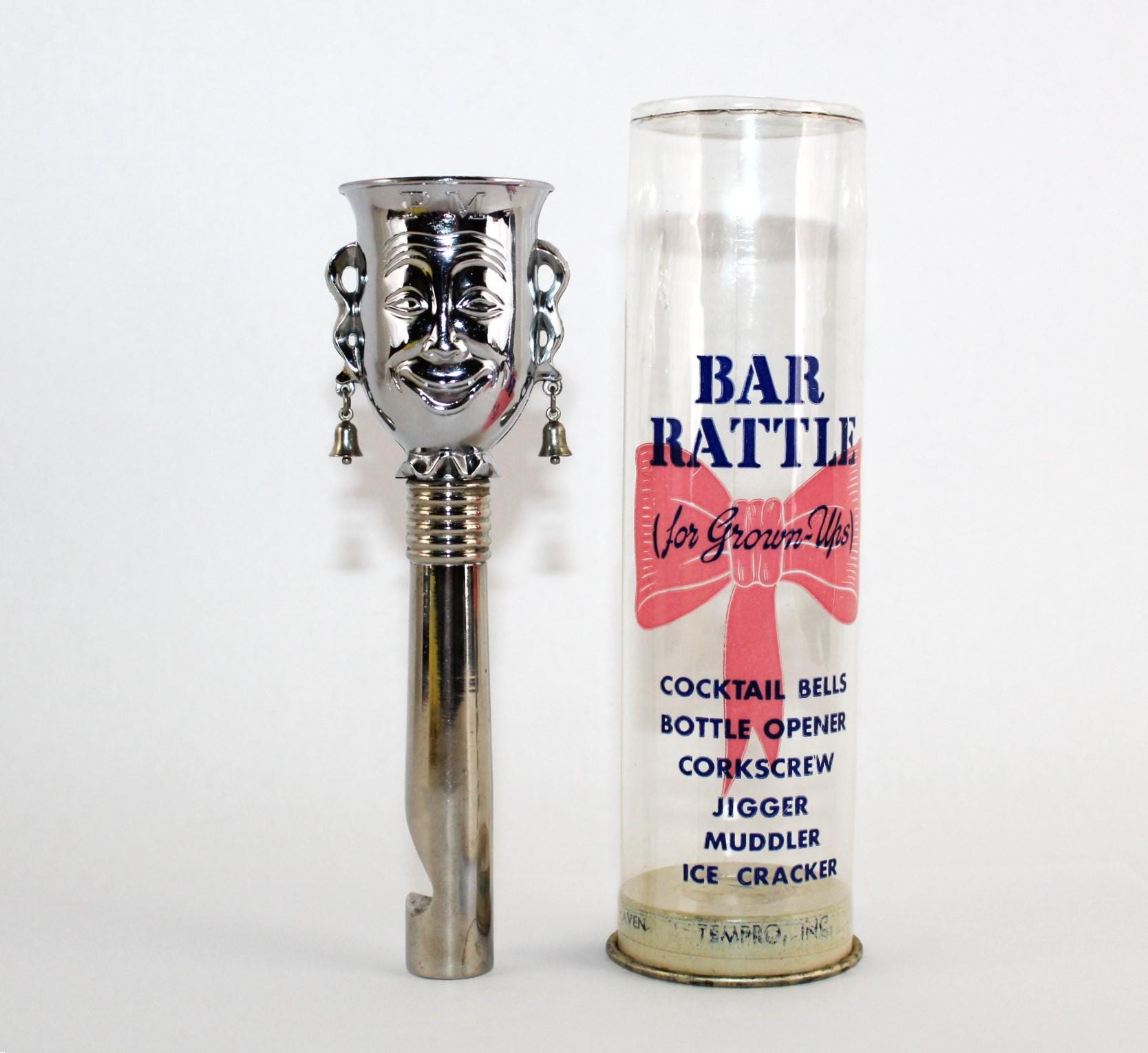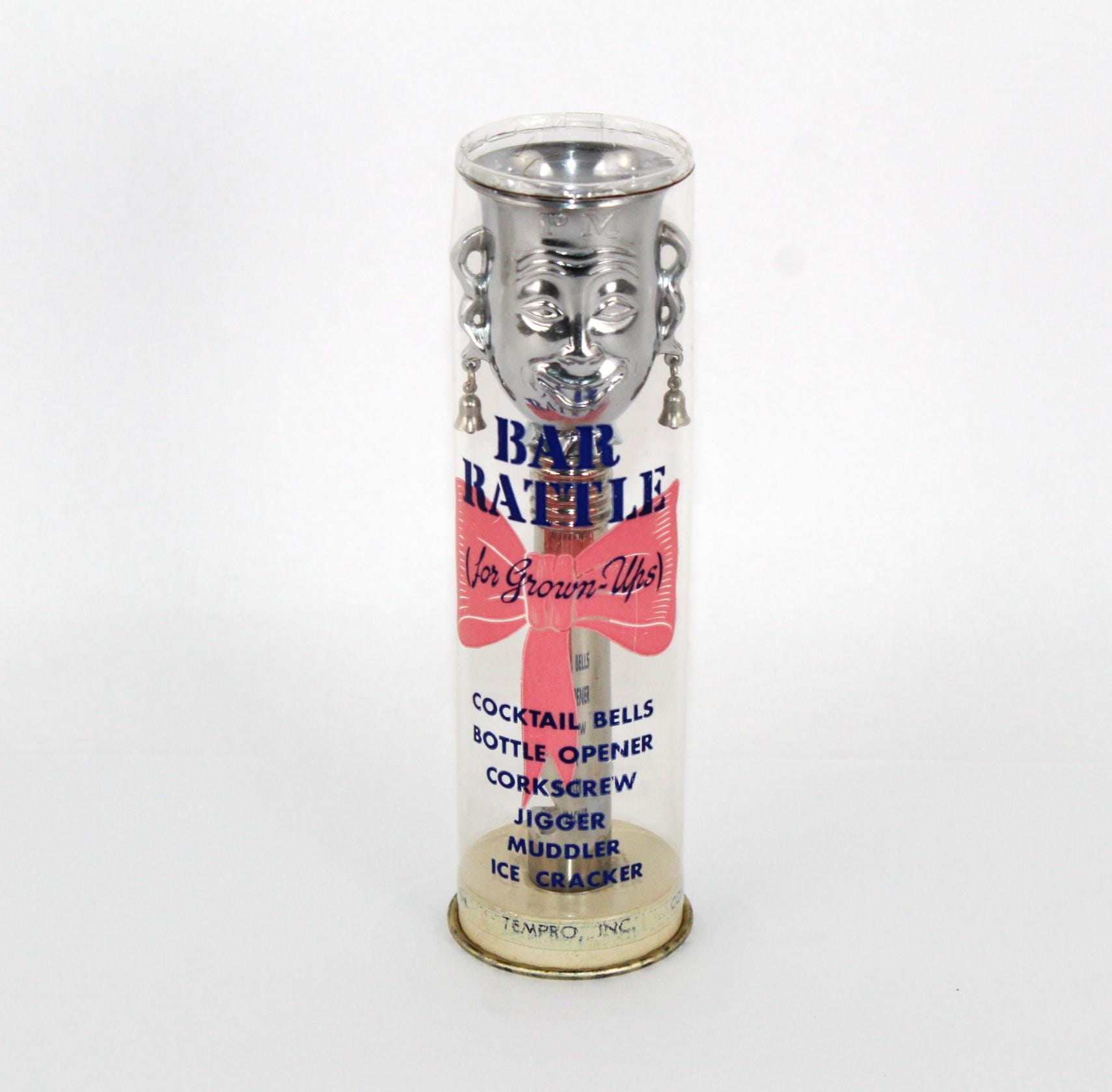 Vintage Bar Rattle, AM / PM Ringing Jester Cocktail Jigger with hidden Corkscrew and Bottle Opener