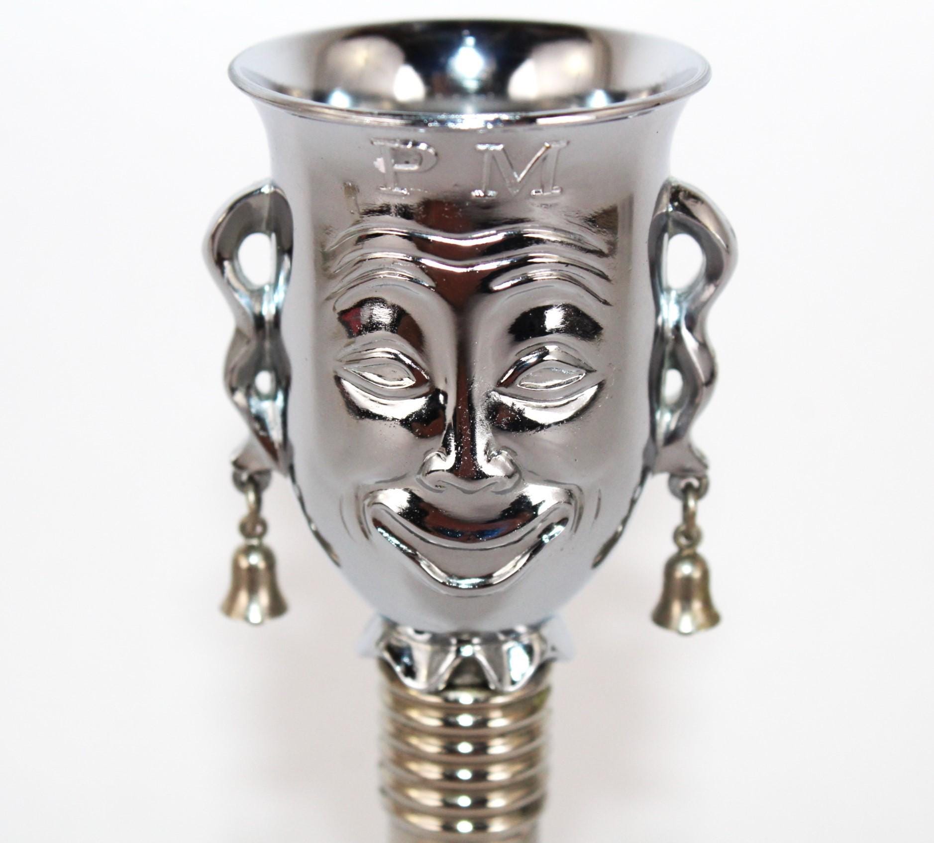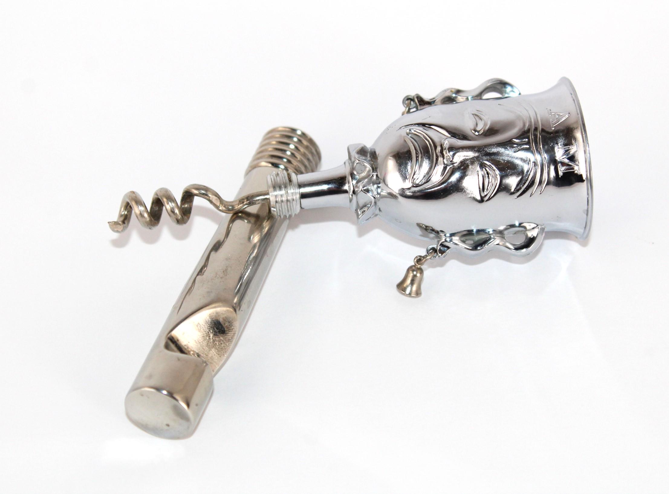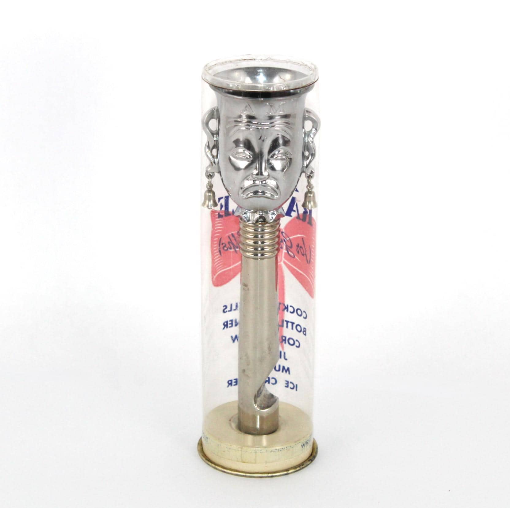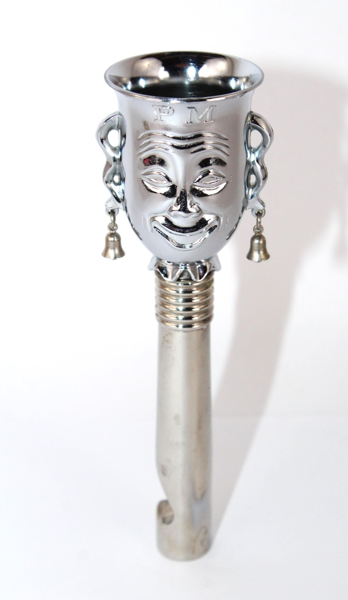 Wonderful find, this retro barware item from the 60s, this is the Ringing Jester AM/PM Jigger, and we all know just what this means. The Jester has earrings that ring if shaken. The handle has a bottle opener in the base. Unscrew the handle to reveal a hidden corkscrew.