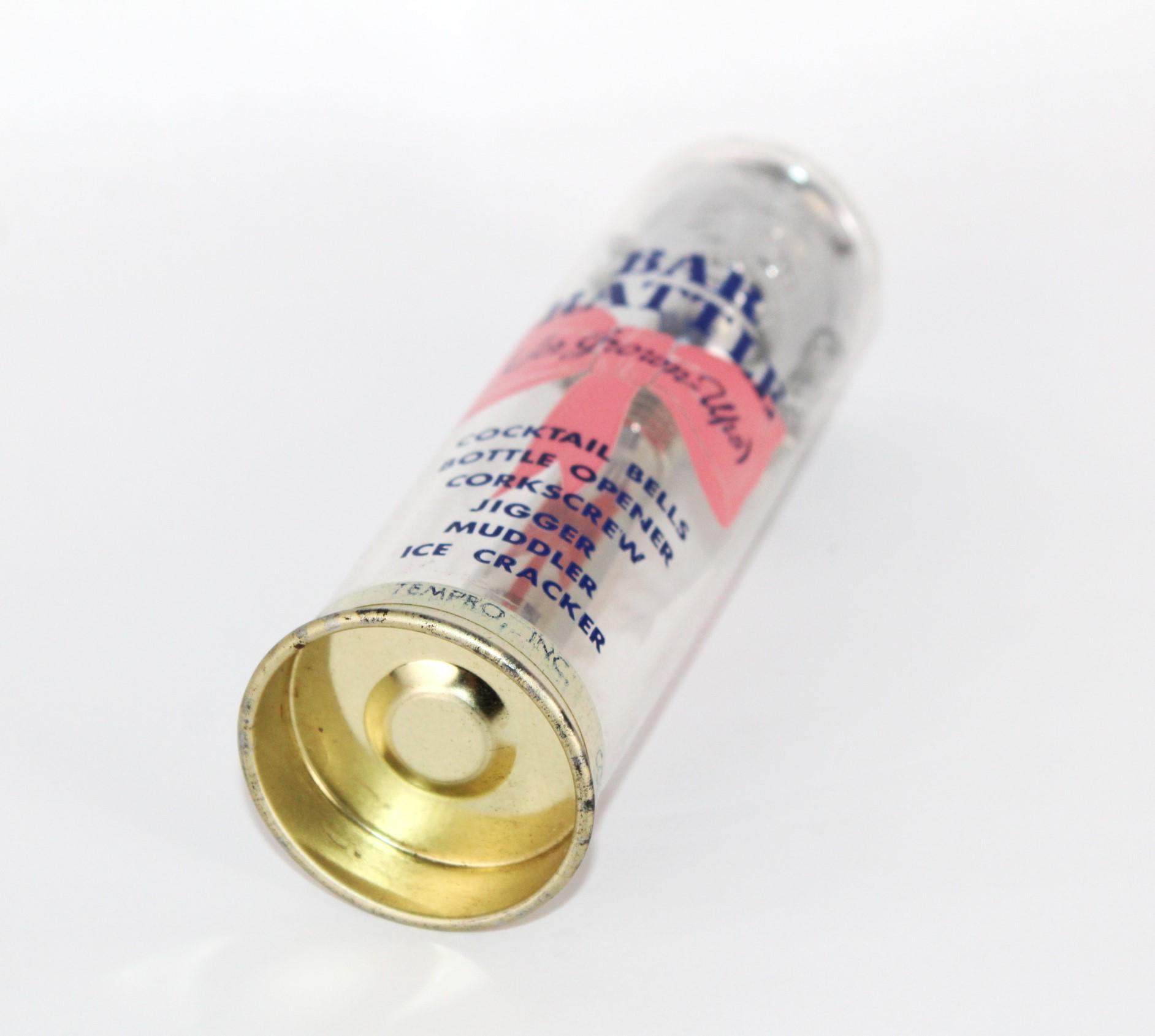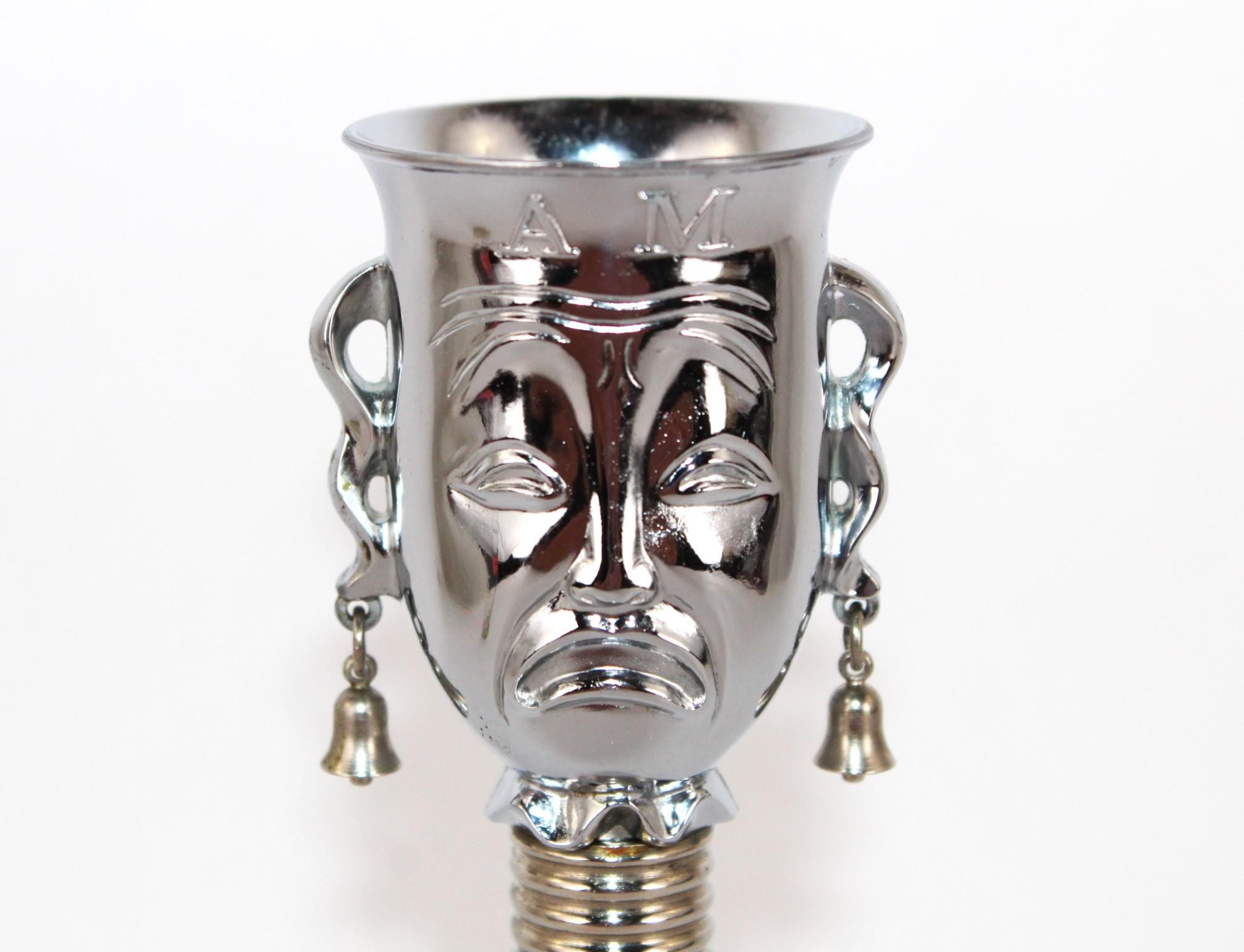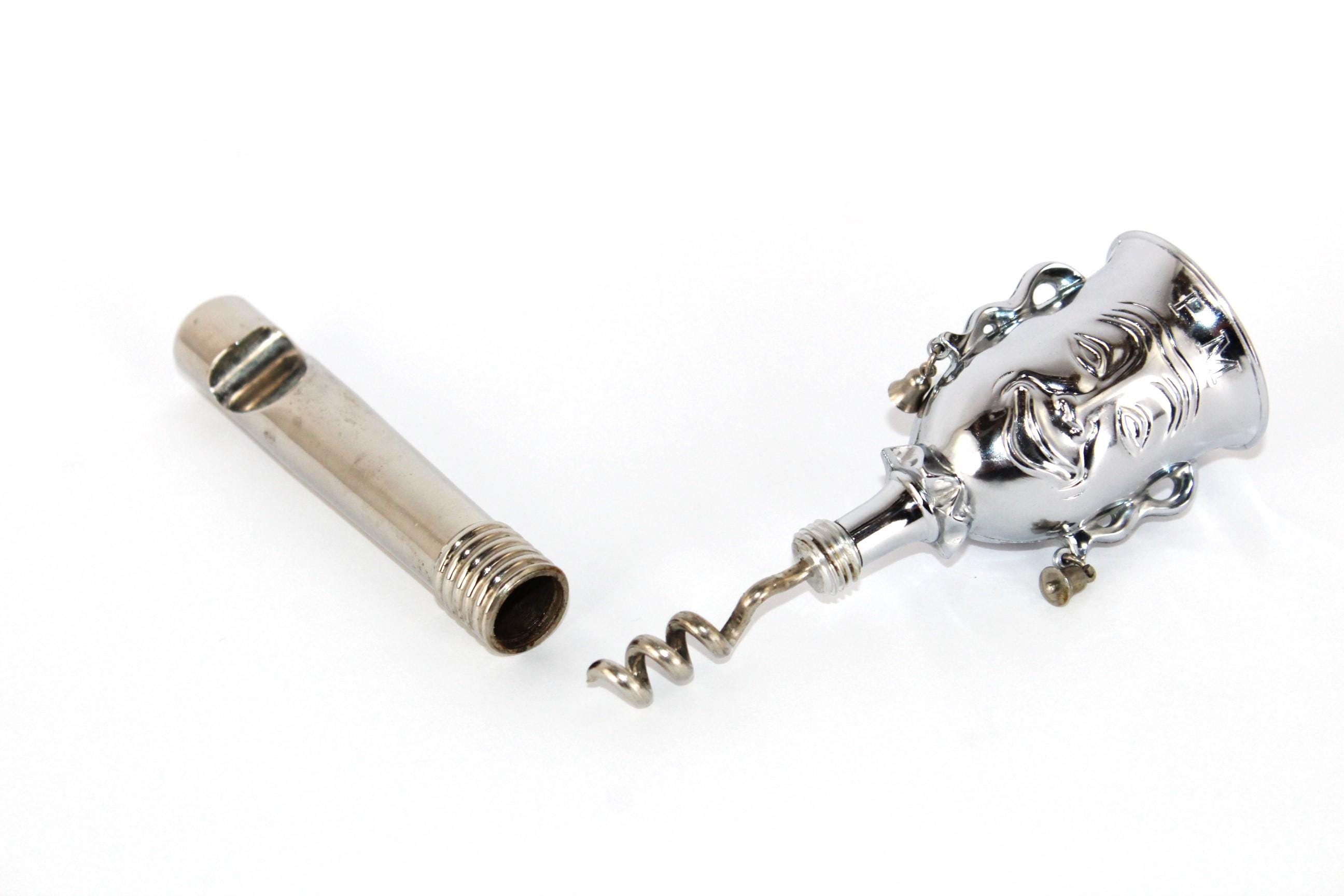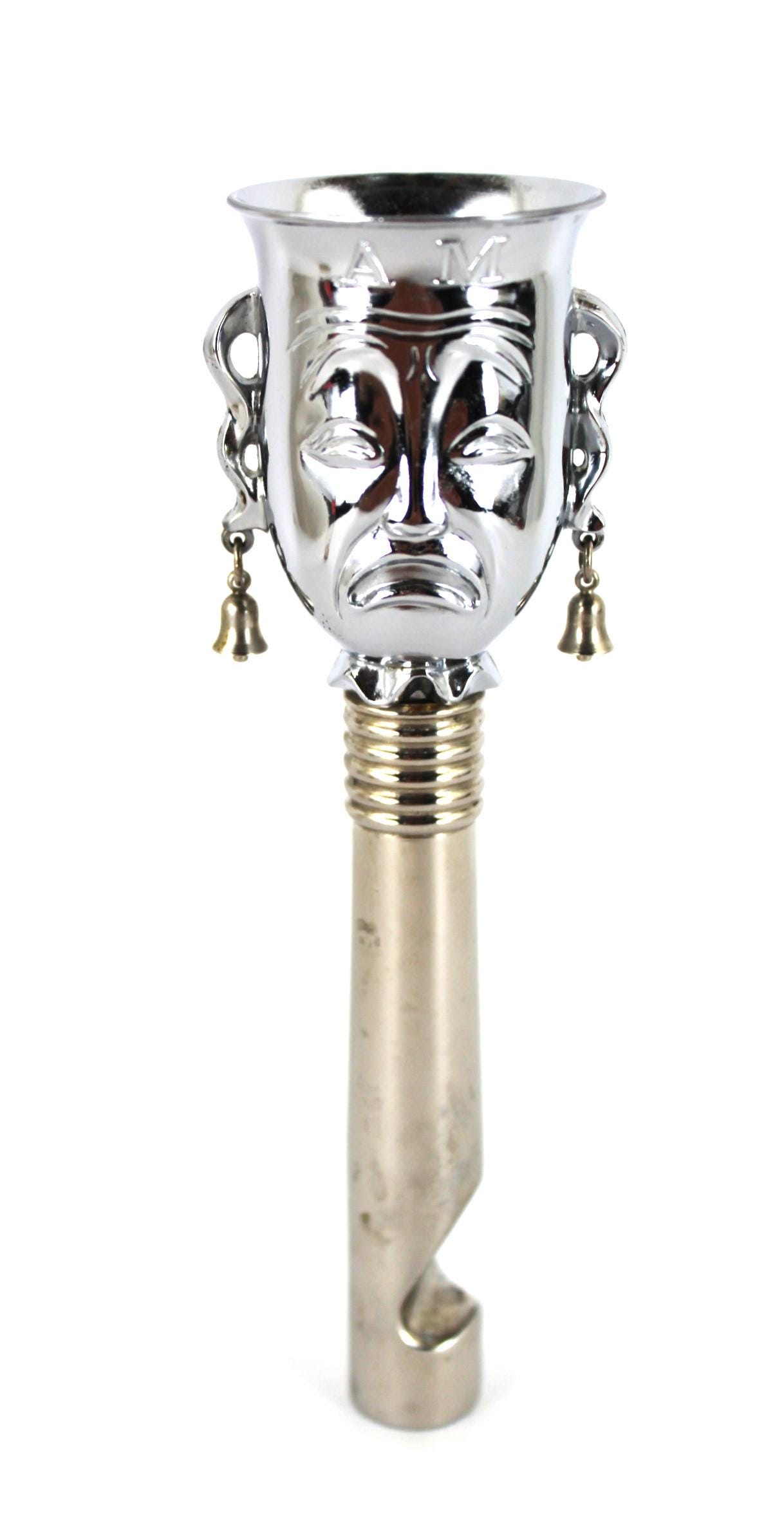 Wonderful find, this retro barware item from the 60s, this is the Ringing Jester AM/PM Jigger, and we all know just what this means. The Jester has earrings that ring if shaken. The handle has a bottle opener in the base. Unscrew the handle to reveal a hidden corkscrew.