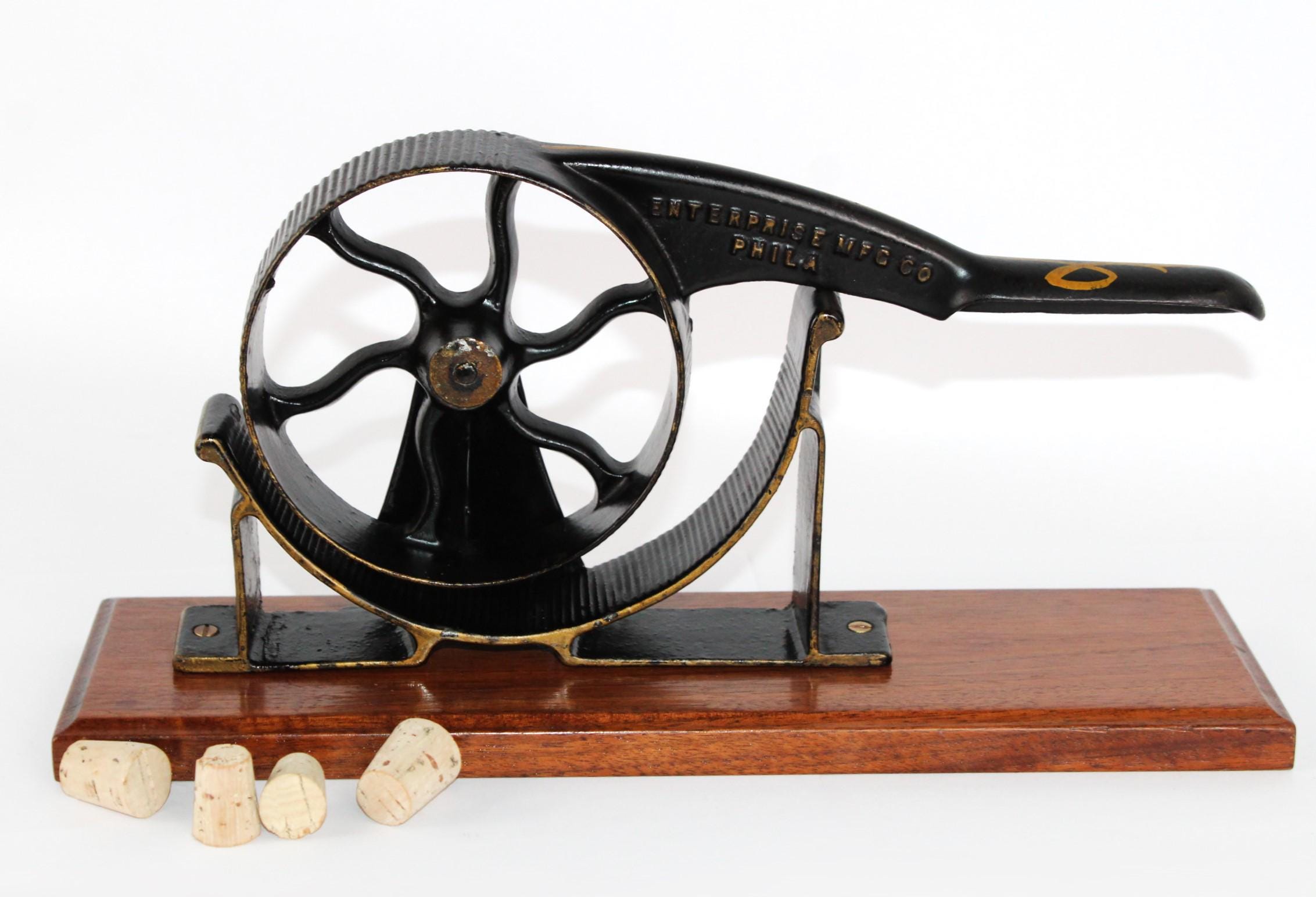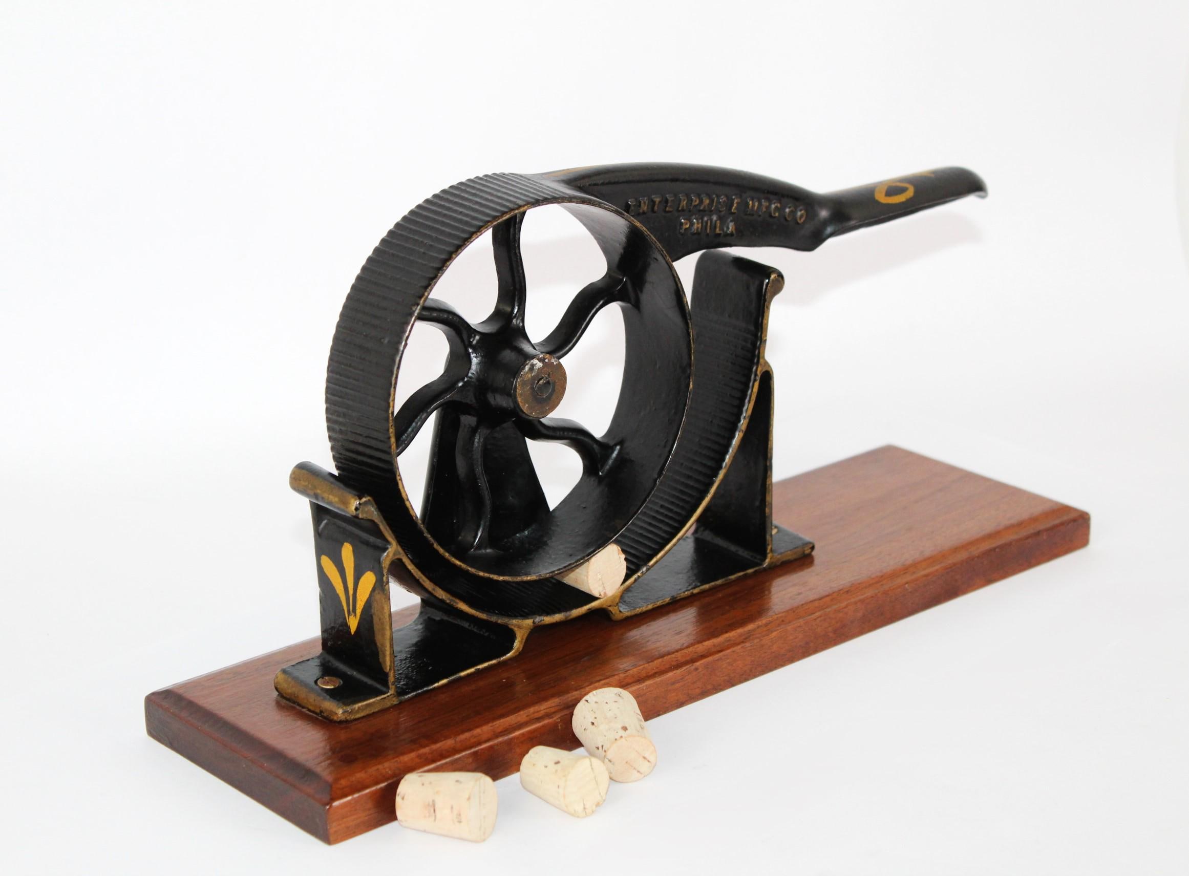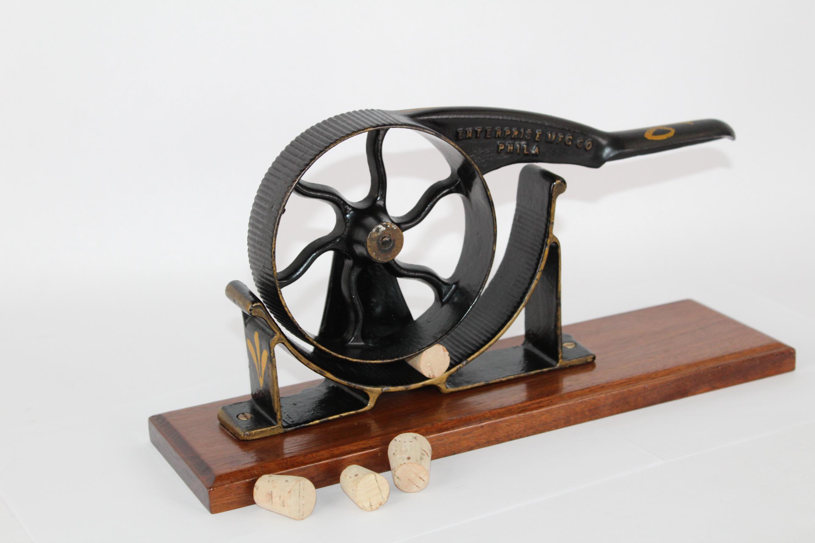 Wonderful 1860s apothecary piece. This is a hand-operated cork roller for compressing corks to fit into medicine bottles, made by the Enterprise Manufacturing Company of Philadelphia.