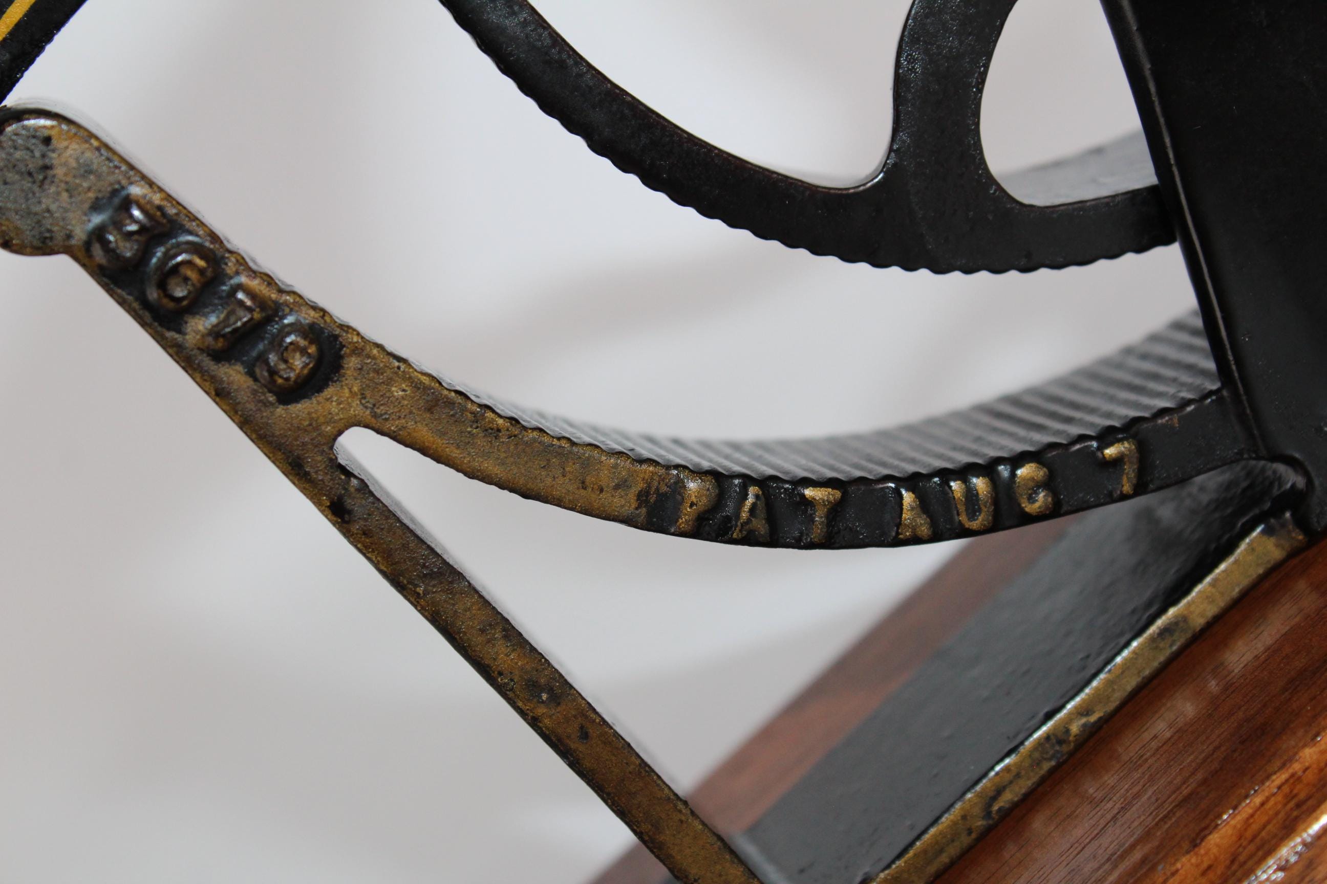 You lift the handle and place a cork into the roller by pushing the handle down. The cork would be compressed to the size of the bottle you needed to fit. This would have been found in pharmacies and Drug stores across America in the mid-1800s. The Press is made of cast iron and attached to a wooden base.