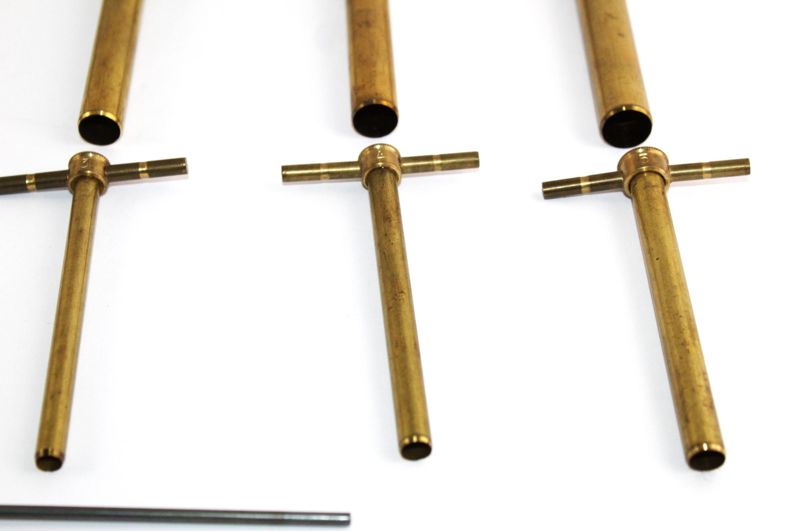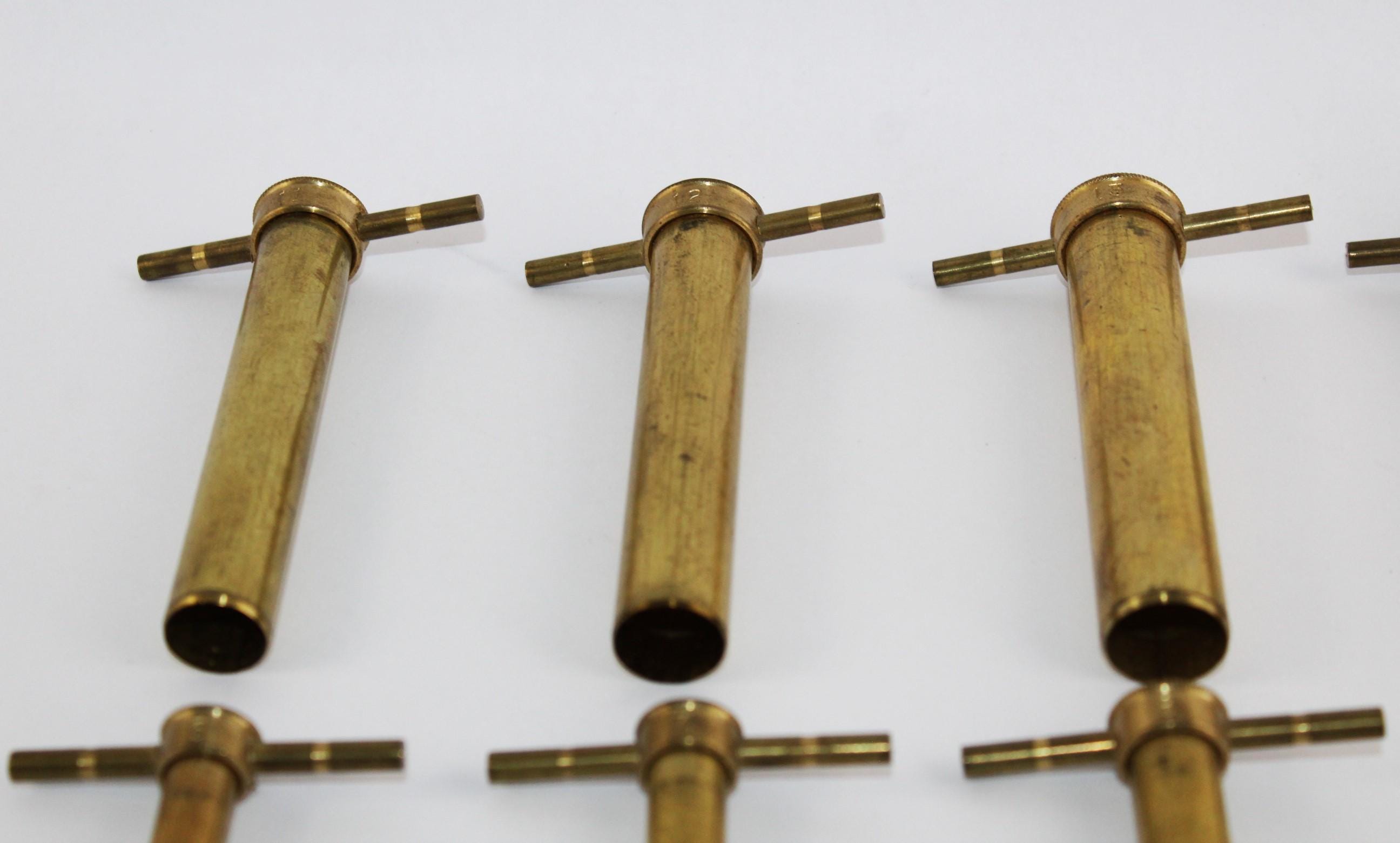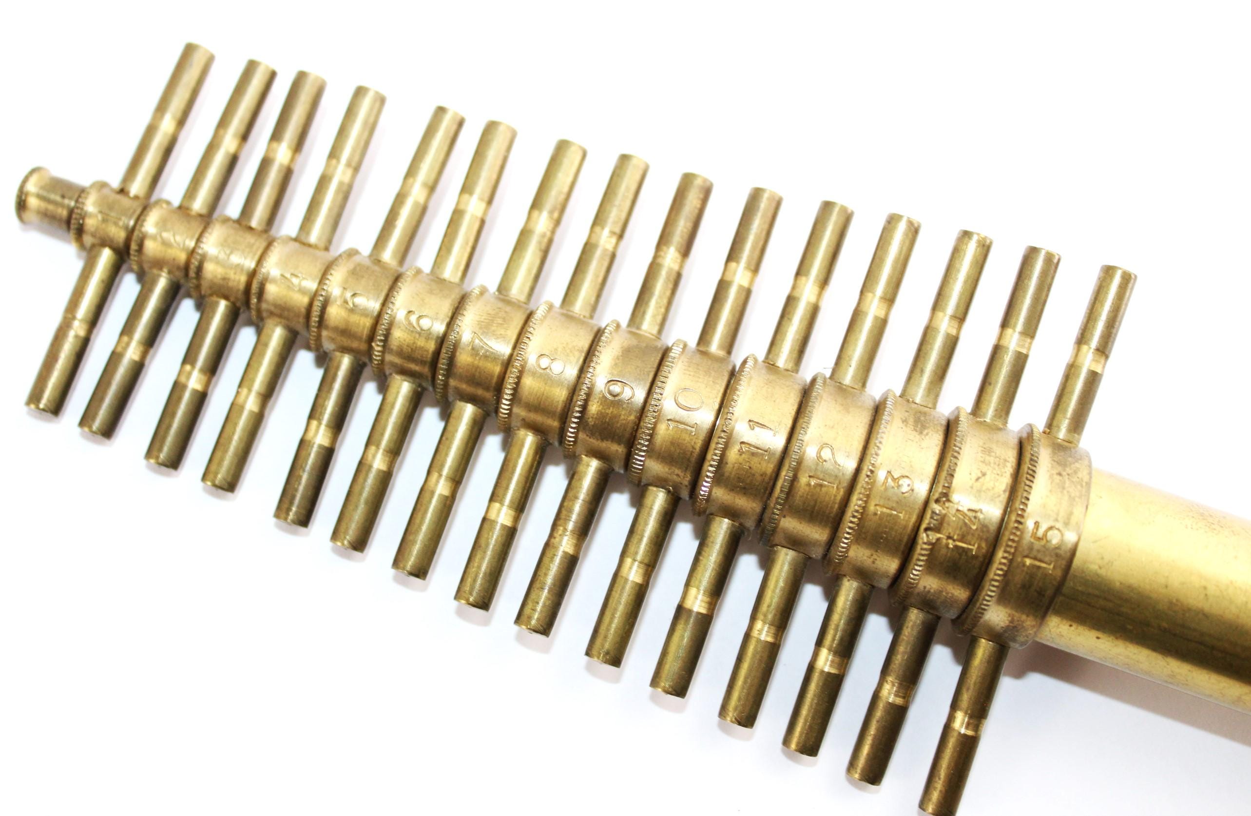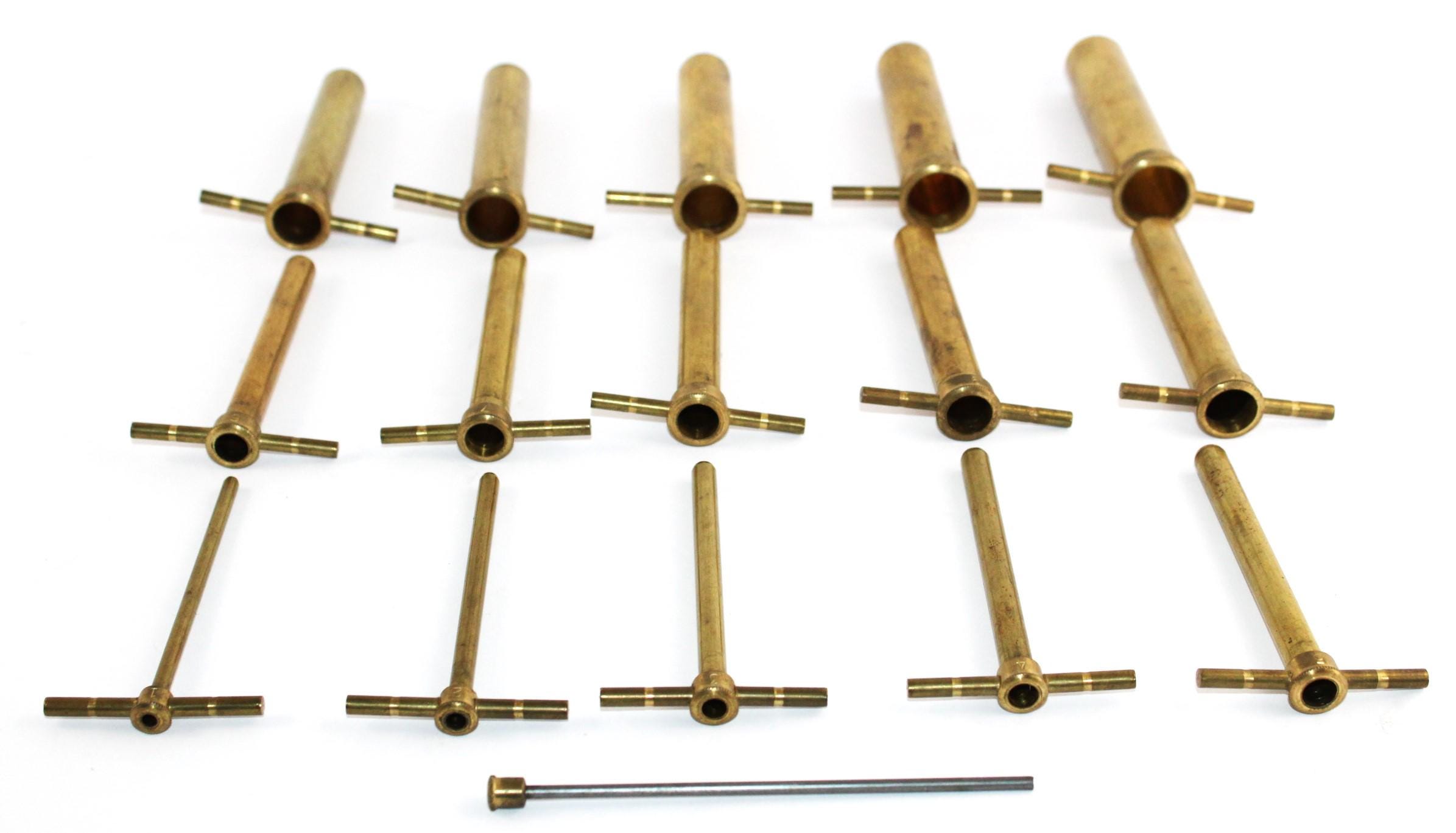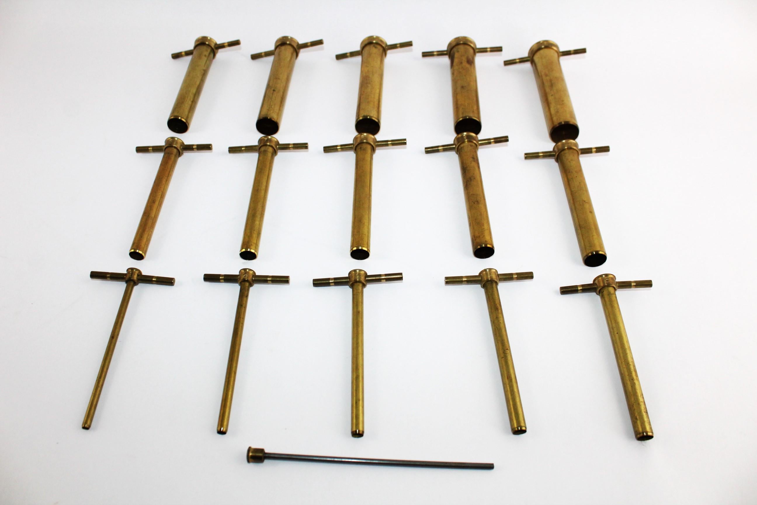 Wonderful full set of Brass Cork Borers, numbered 1 through 15 with clean-out staff.