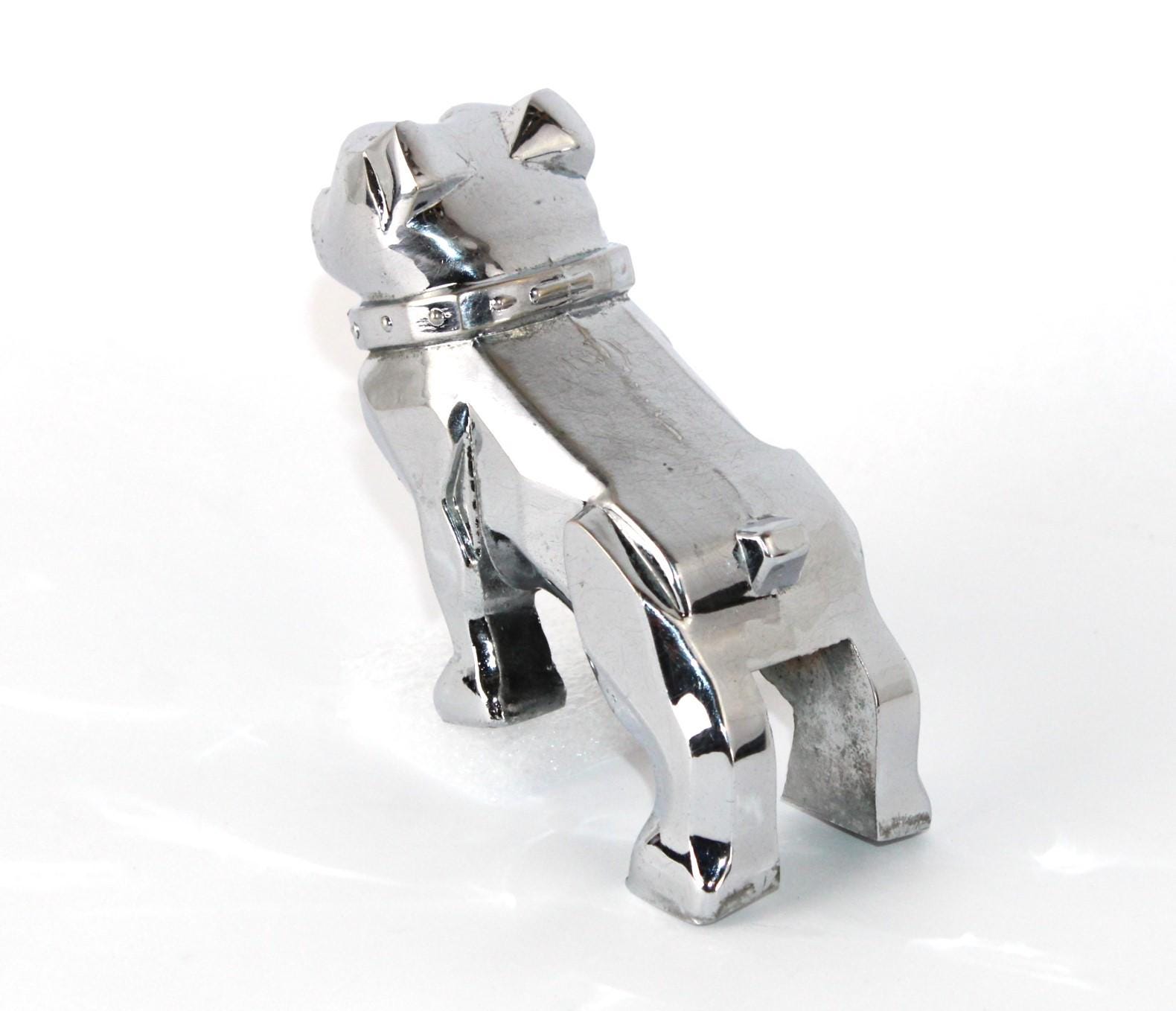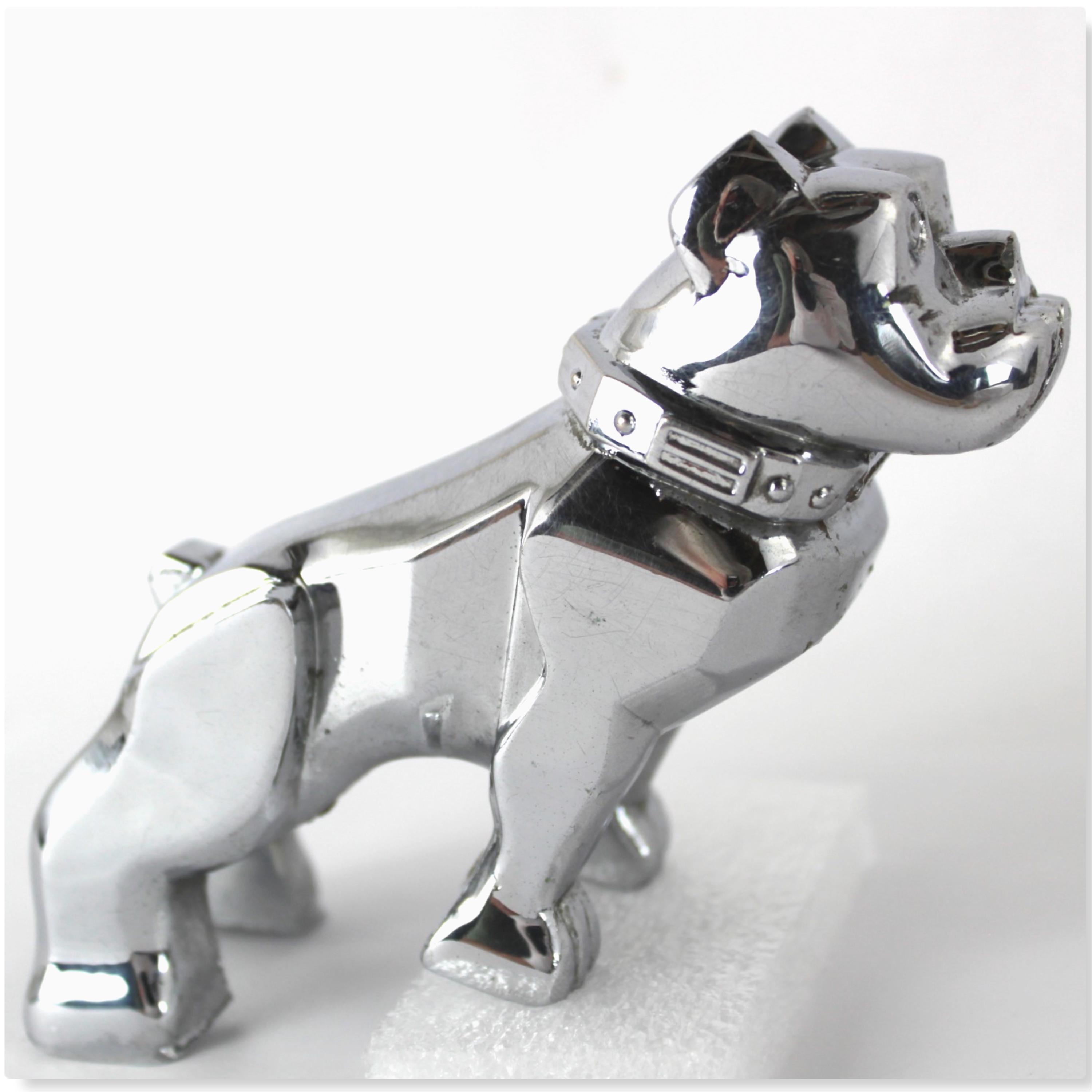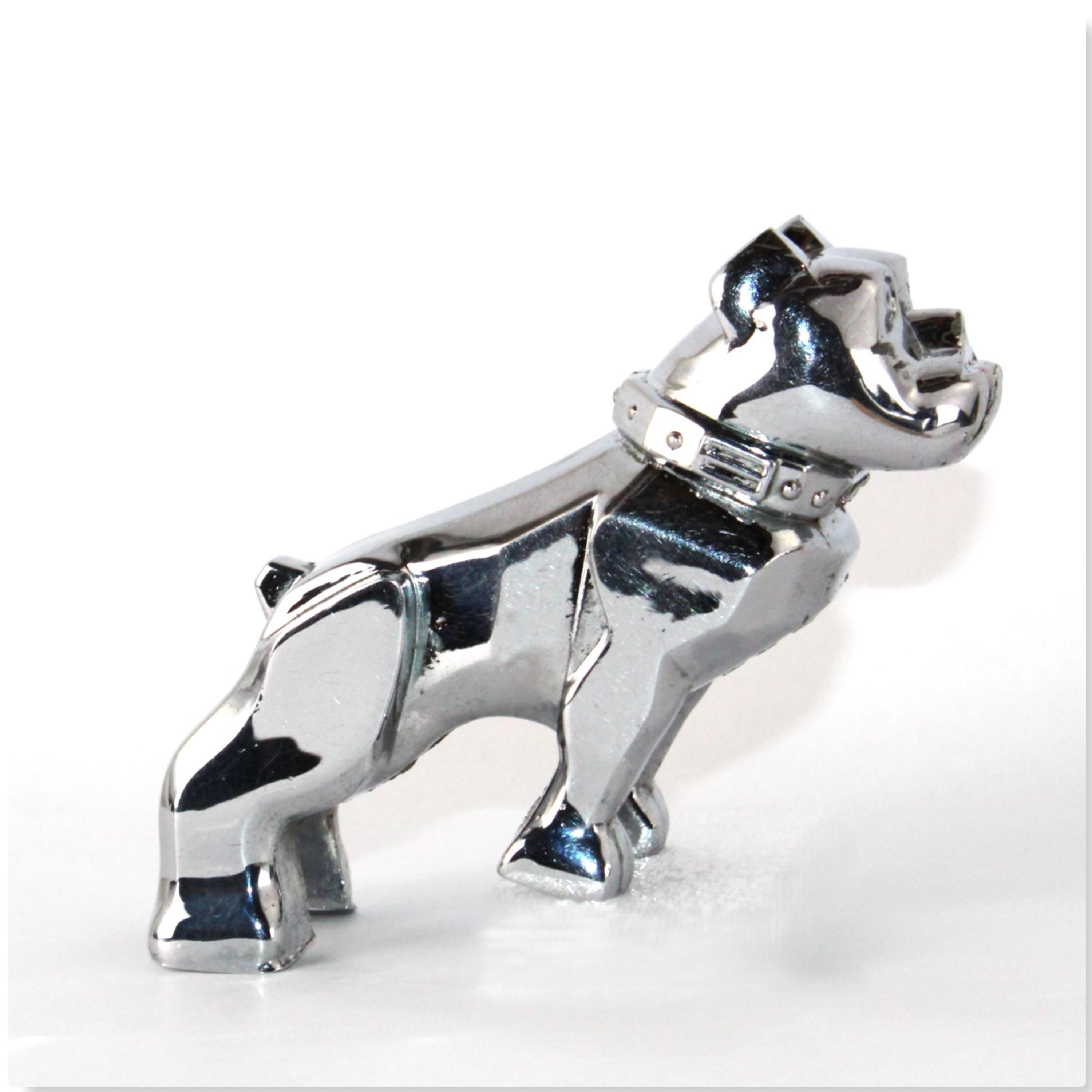 The bulldog has the name MACK on his collar, and on his chest reads REG No. 87931. These are solid chrome-plated metal.