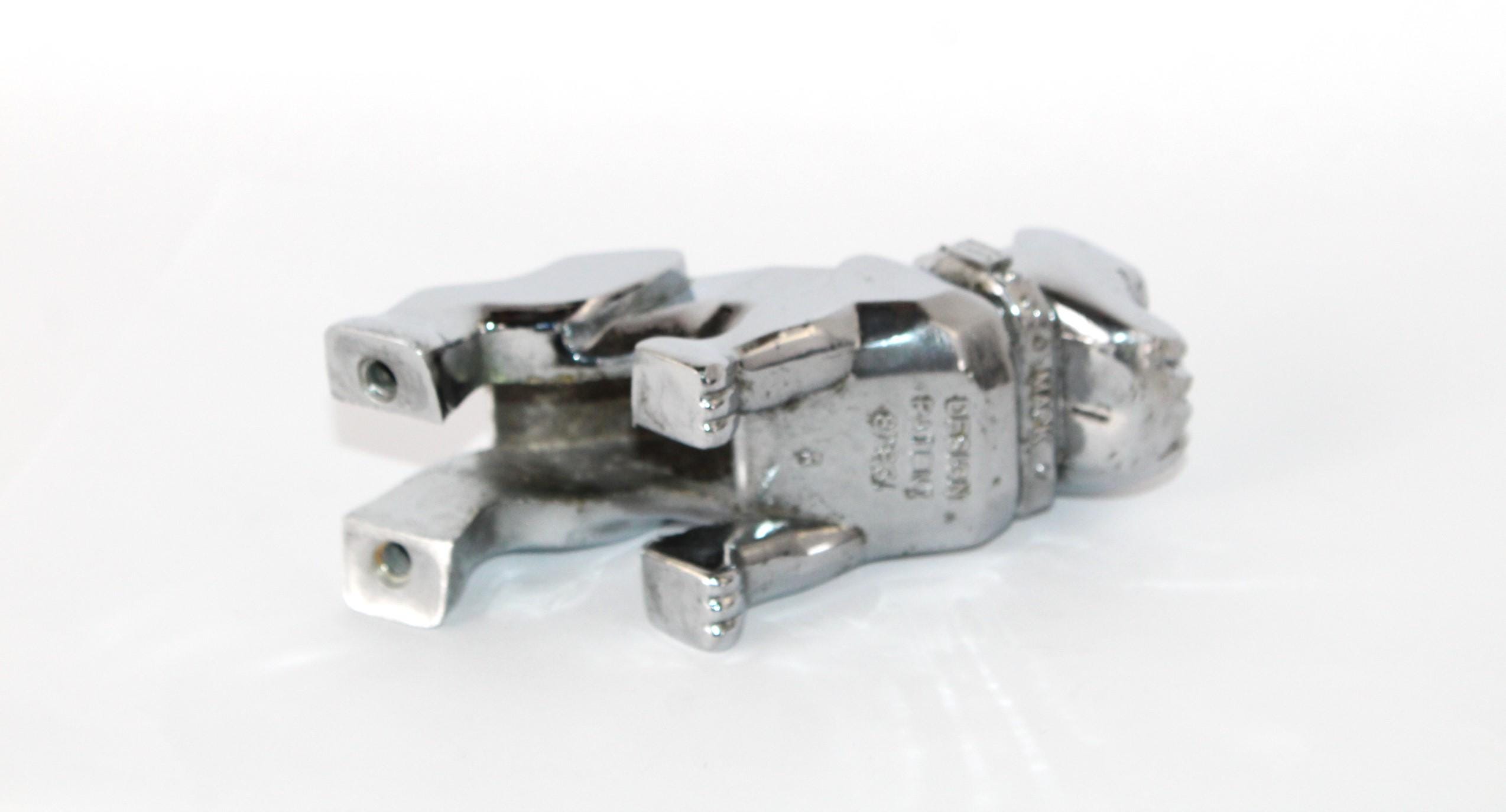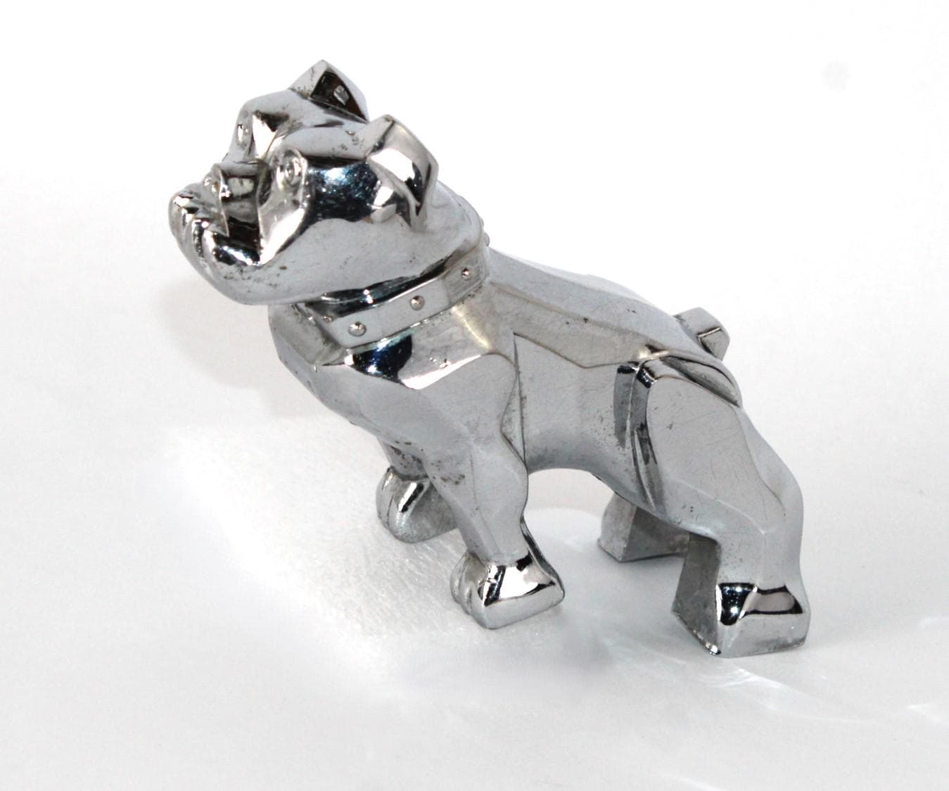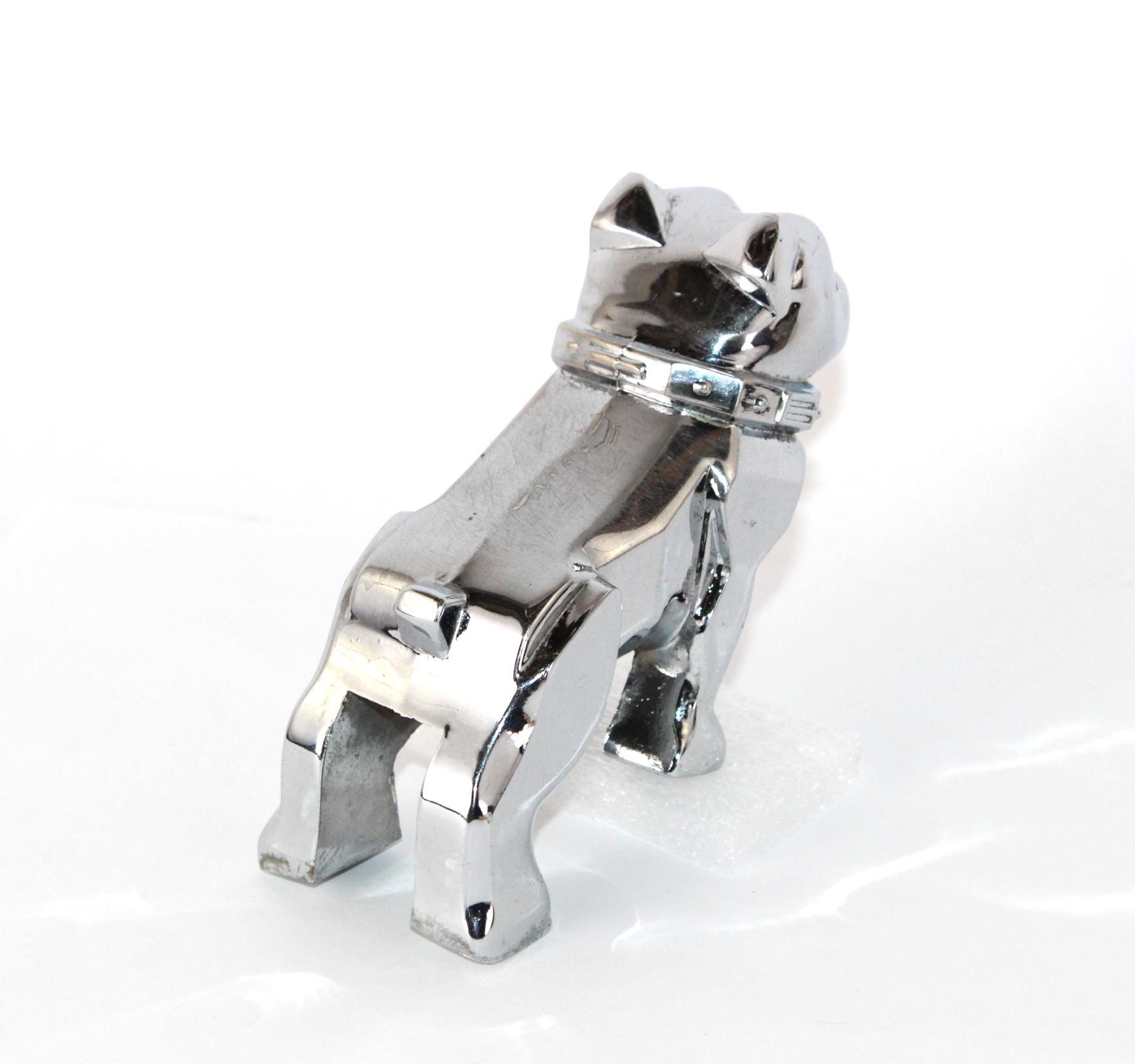 The bulldog has the name MACK on his collar, and on his chest reads REG No. 87931. These are solid chrome-plated metal.