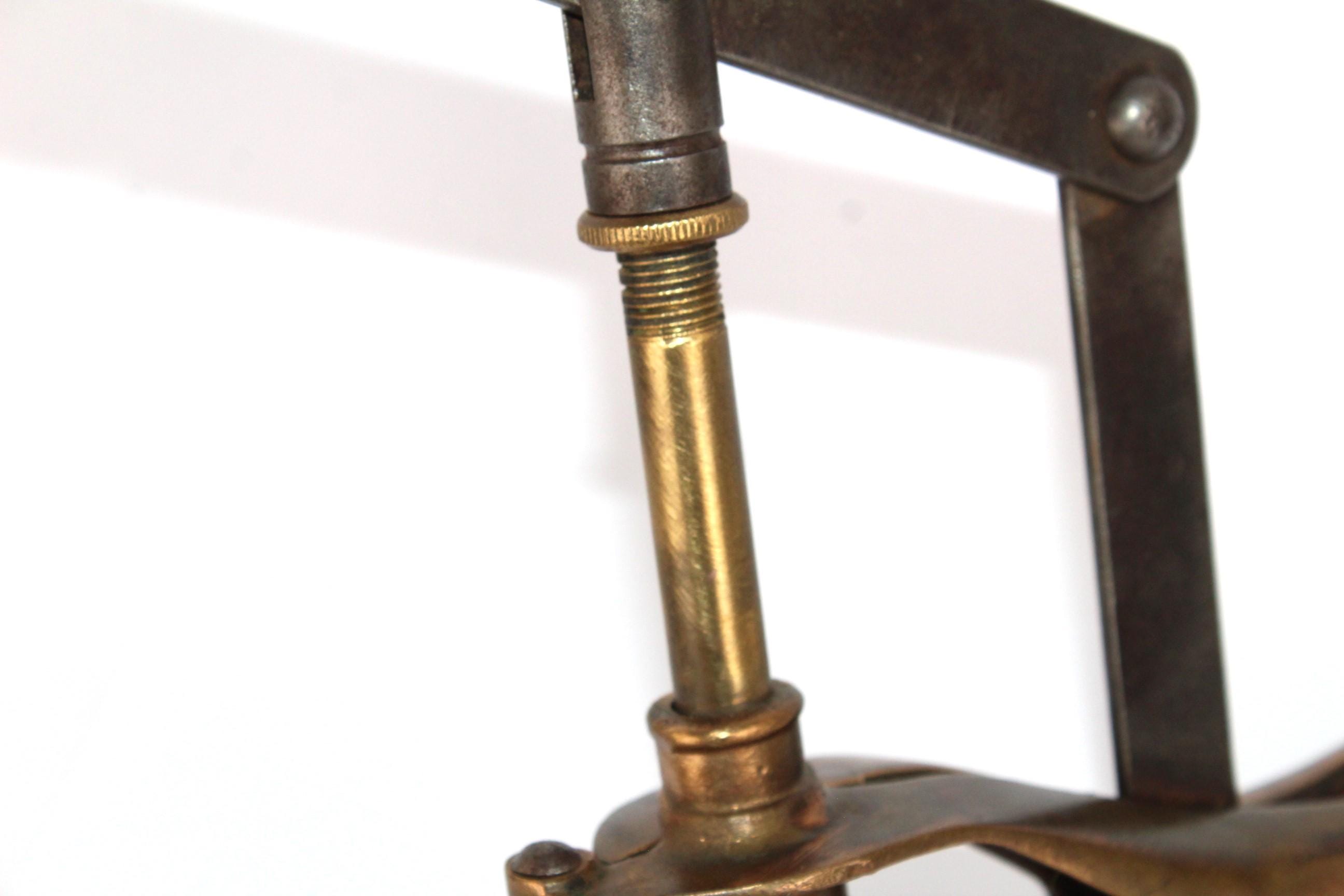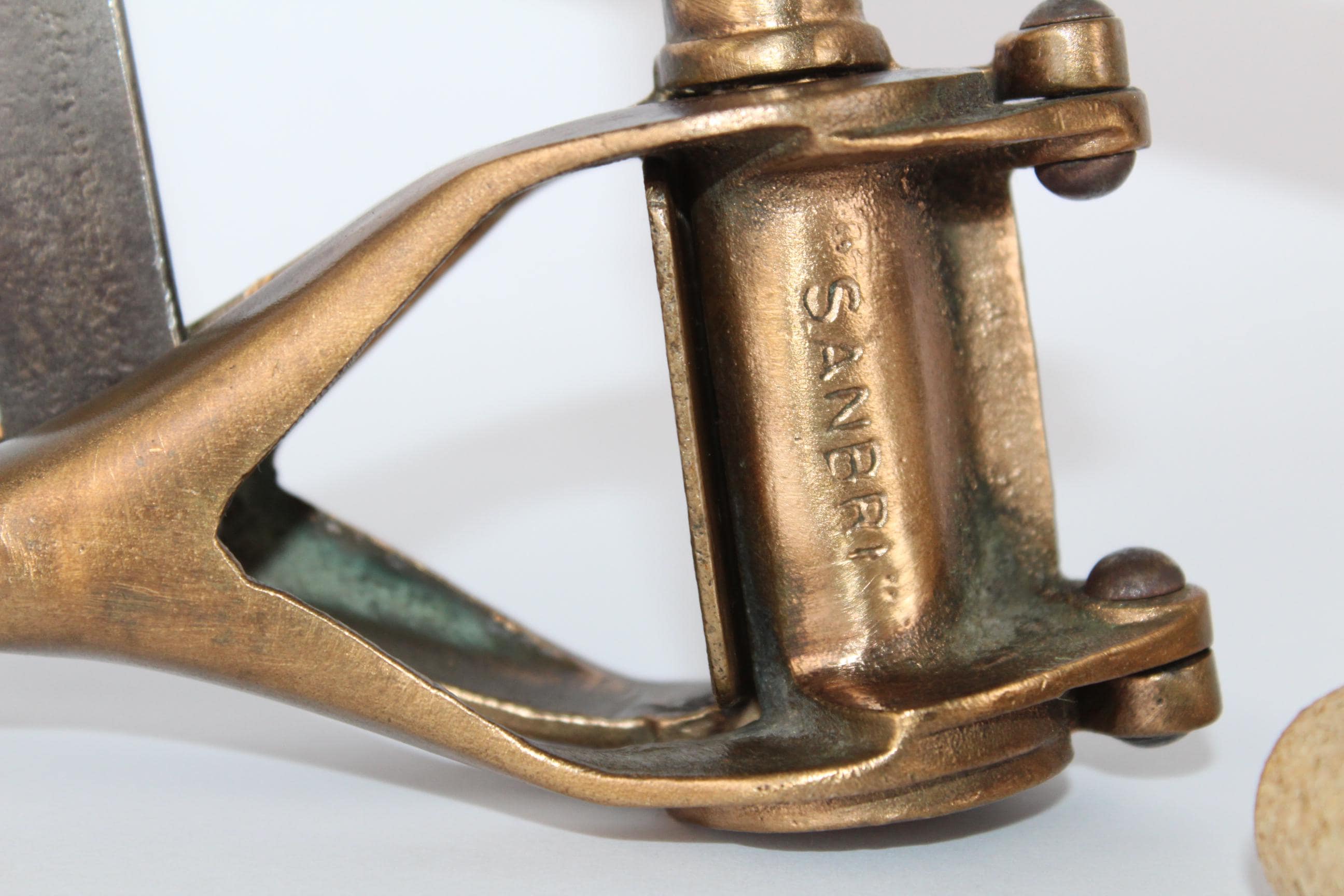 The Sanbri Company was a well-known French wine equipment firm, located in the northern tip of France. The corker is made of brass with a steel lever arm and a wooden handle. There is an adjustment nut at the top of the insert piston. This adjusts the depth at which the cork is set into the bottle. This is a beautiful display item for your wine bar or a gift for that wine collector.