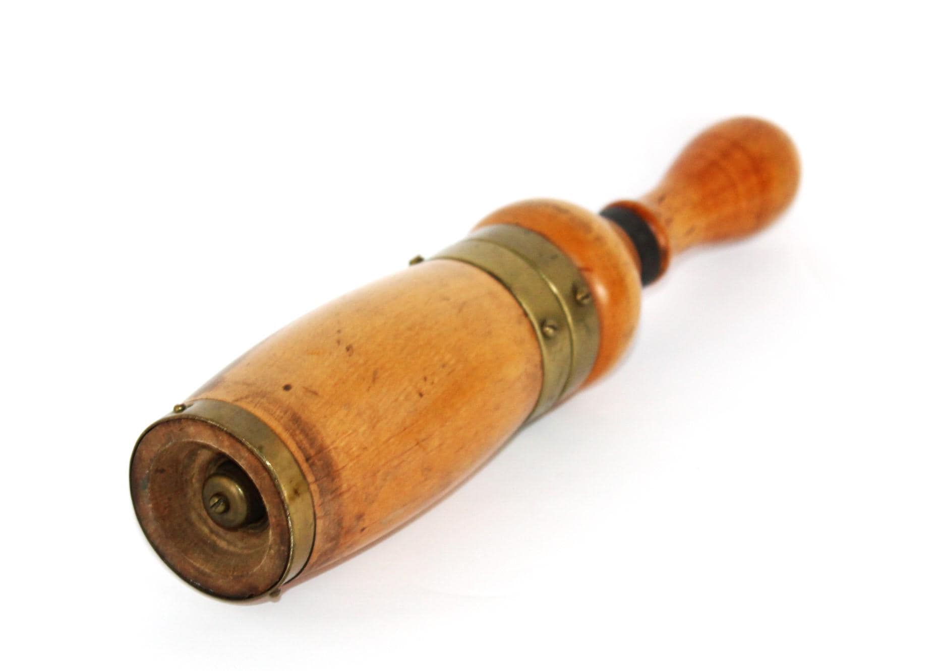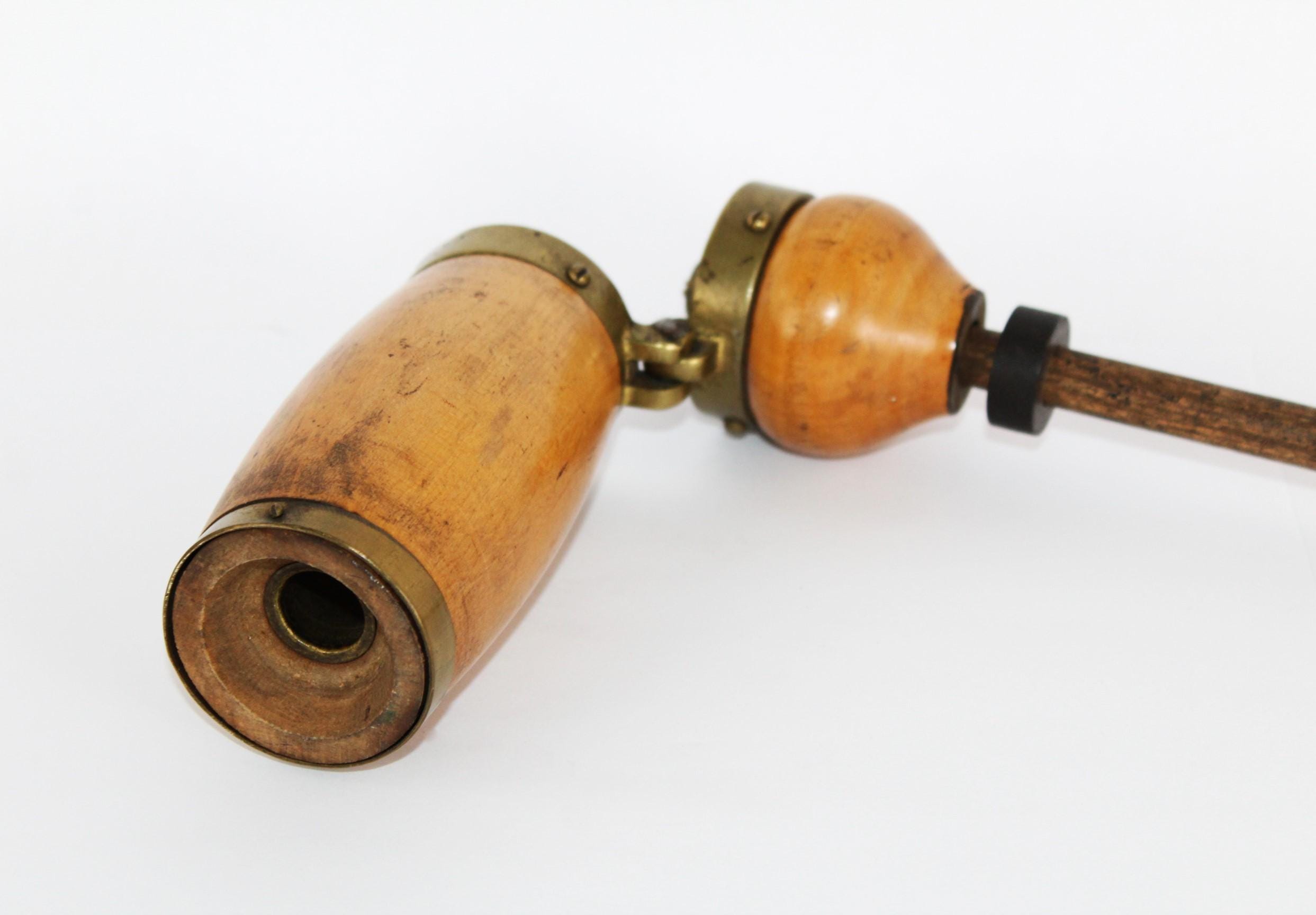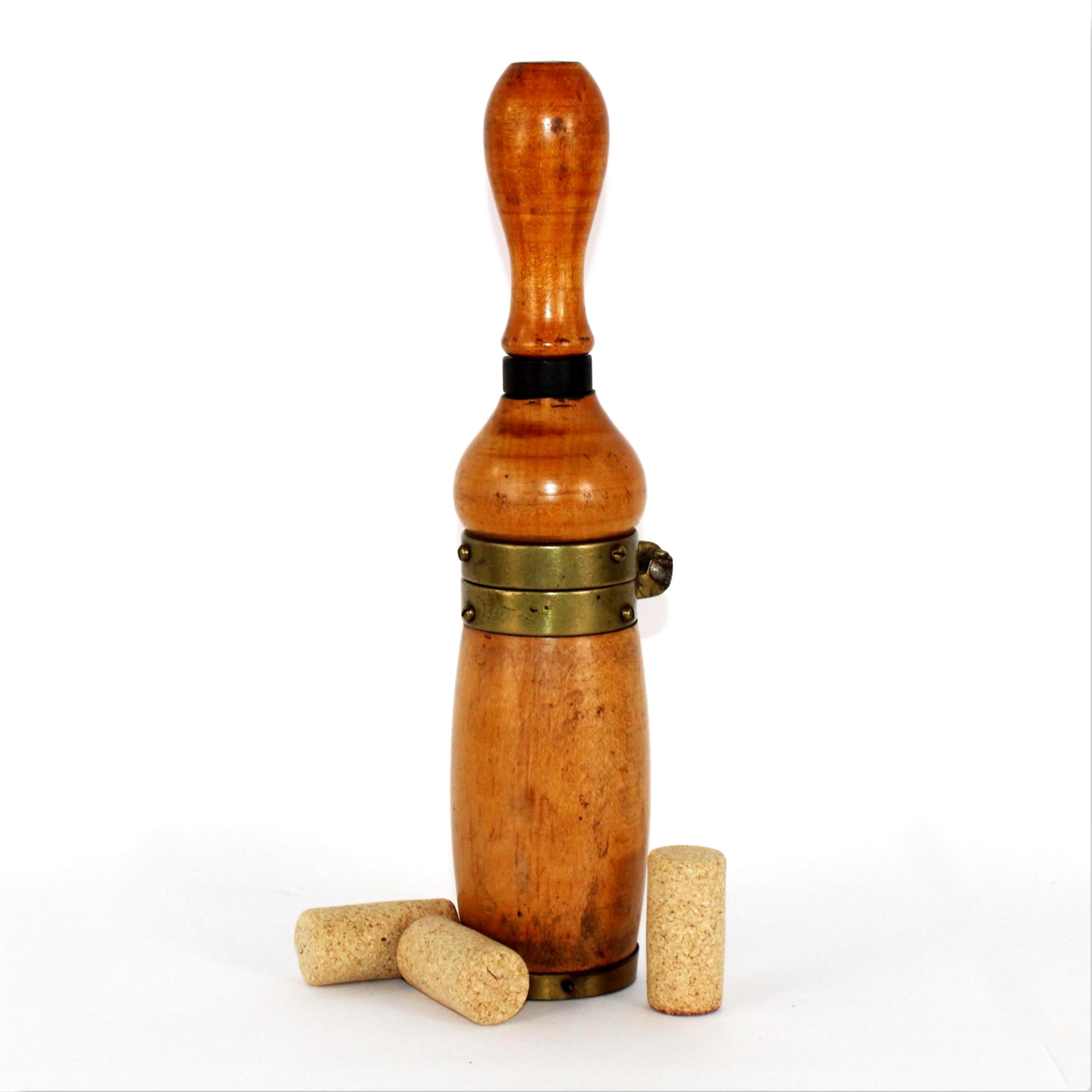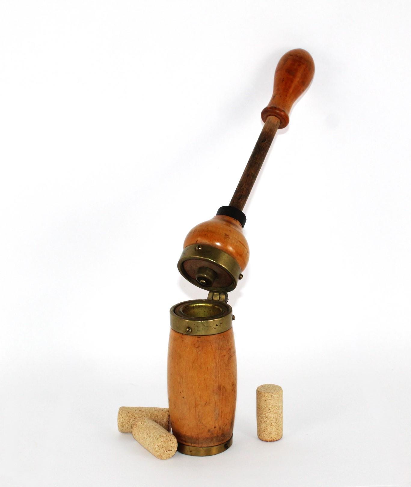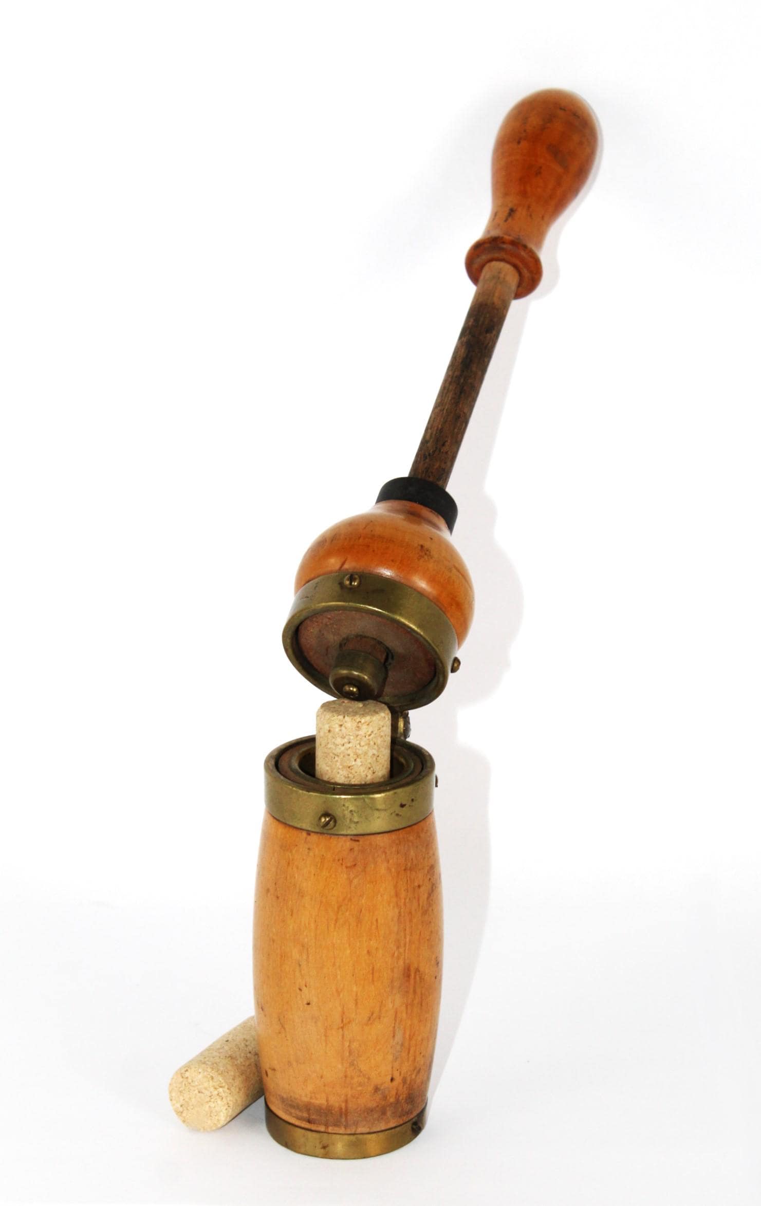 Wonderful find, this mid-to-late 1800s Bottle Corker, made of hardwood and brass. Pull the handle upward to hinge the corker open. The corker is lined with a brass sleeve and brass collars, driving rod has a brass-covered tip.