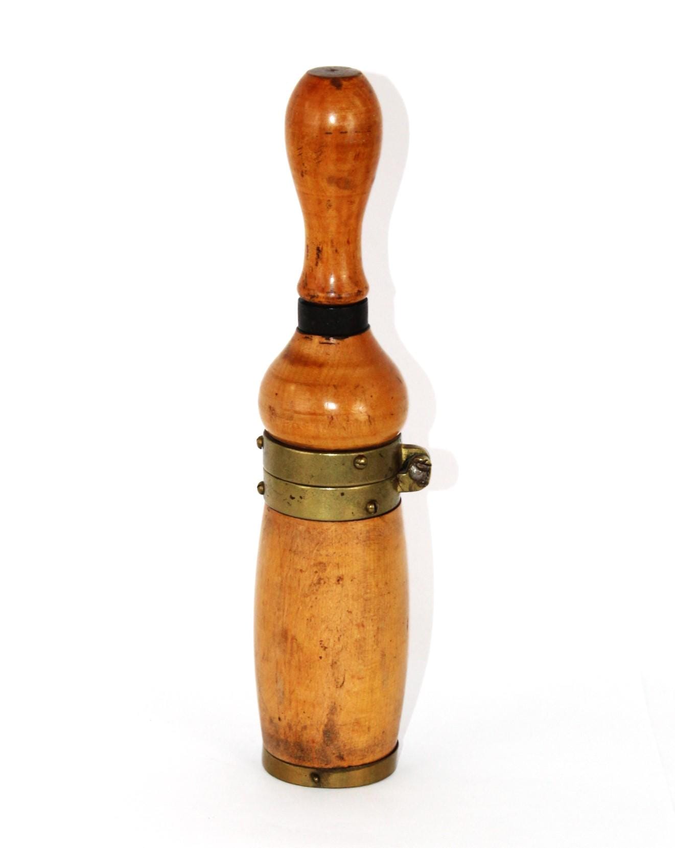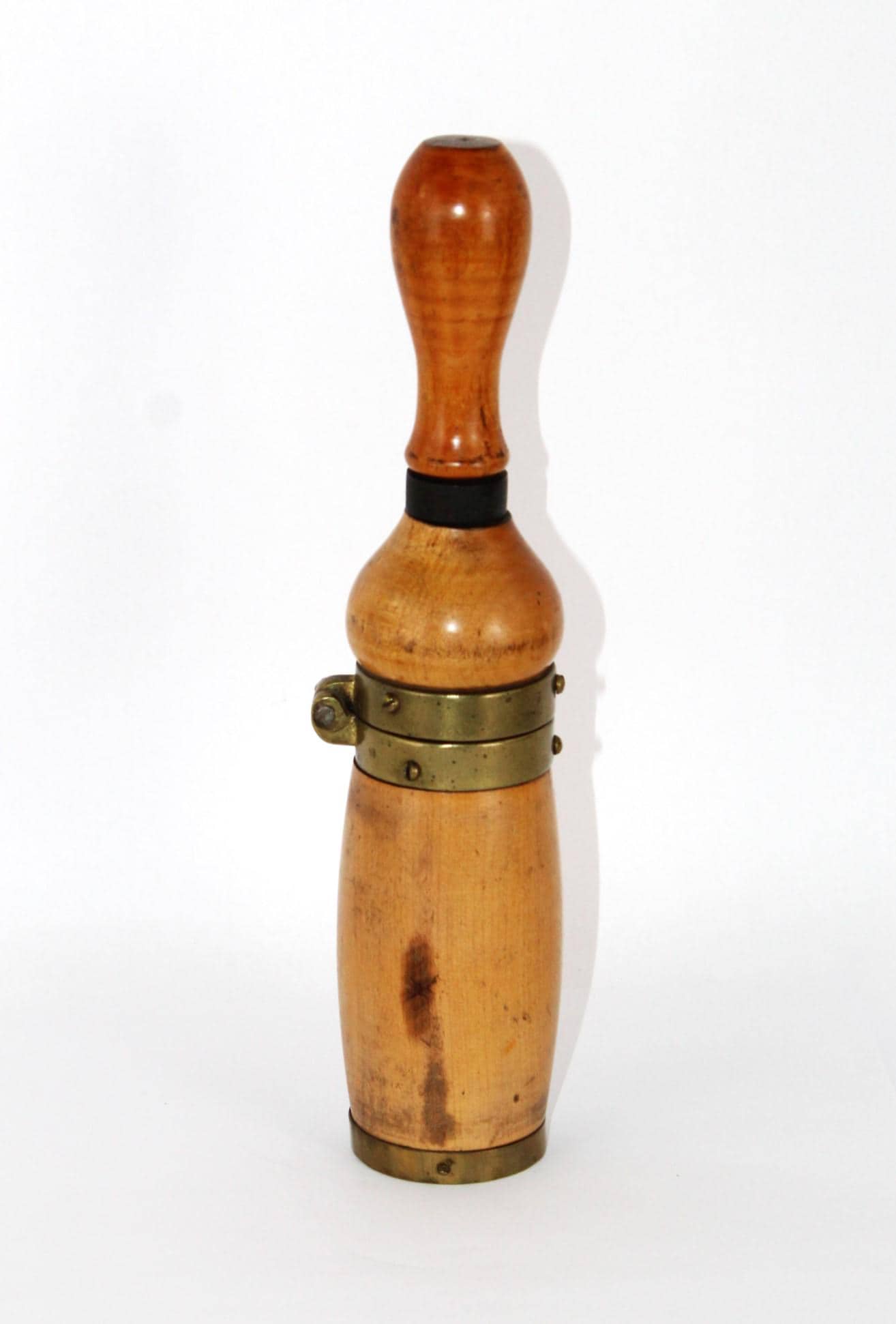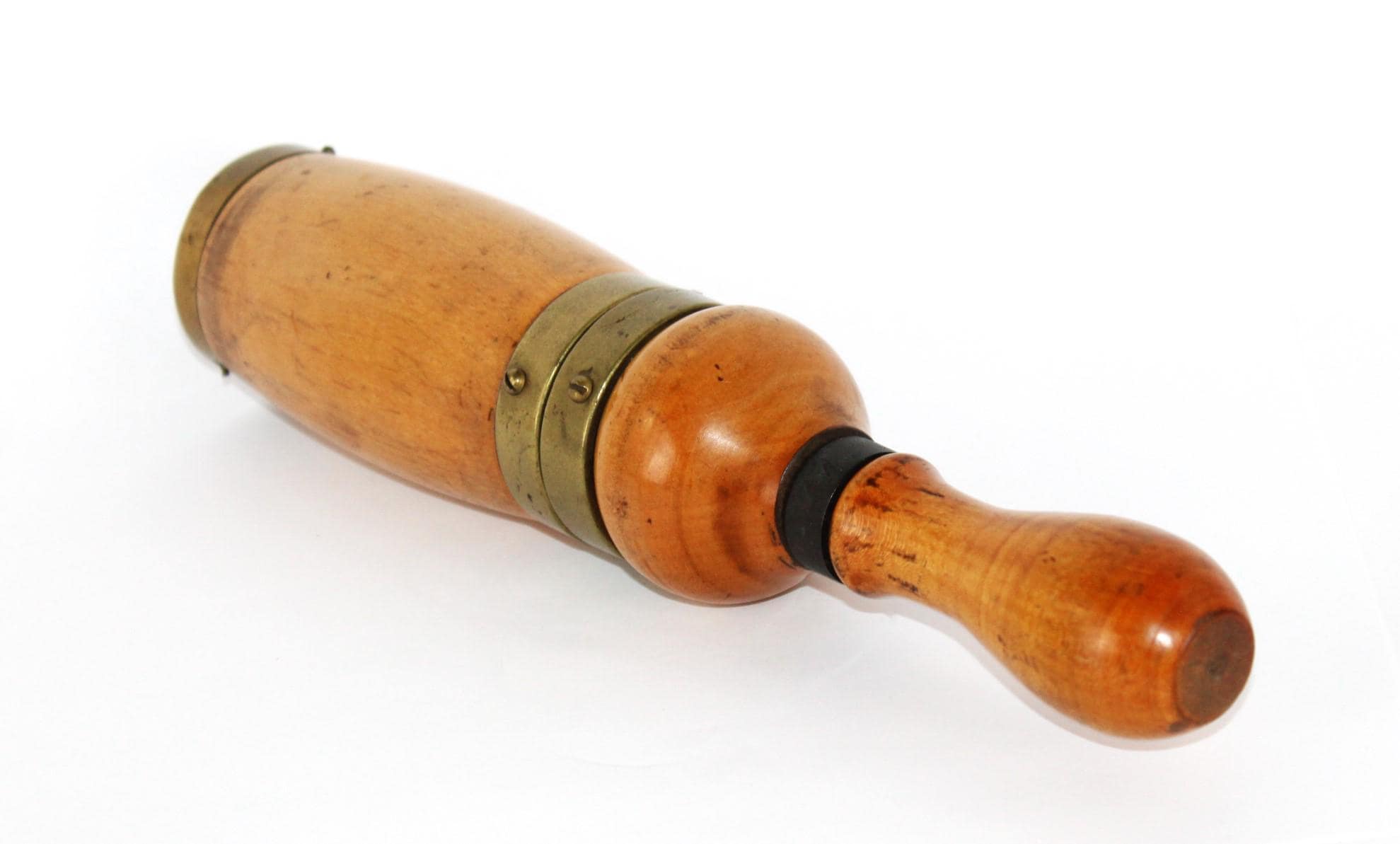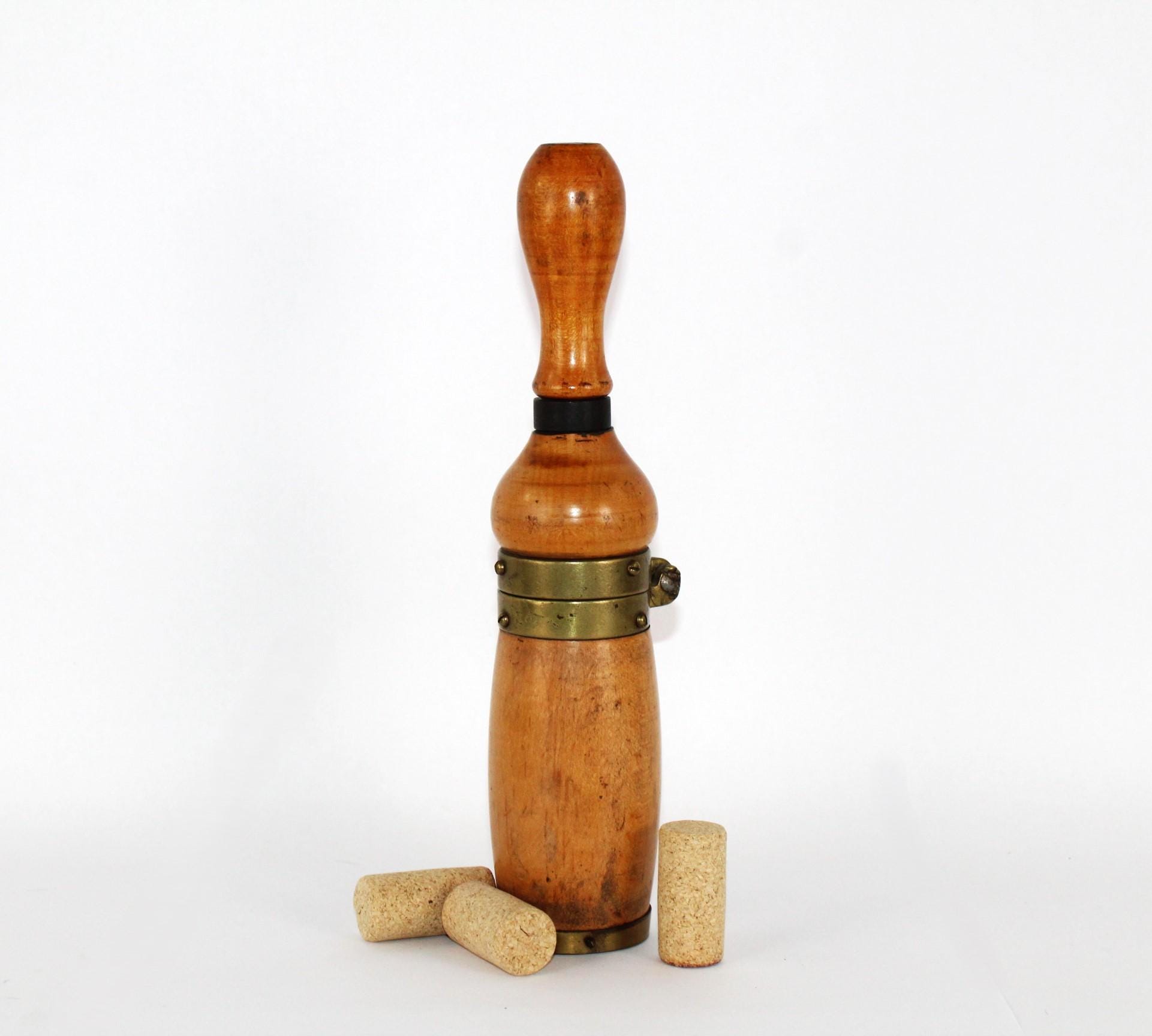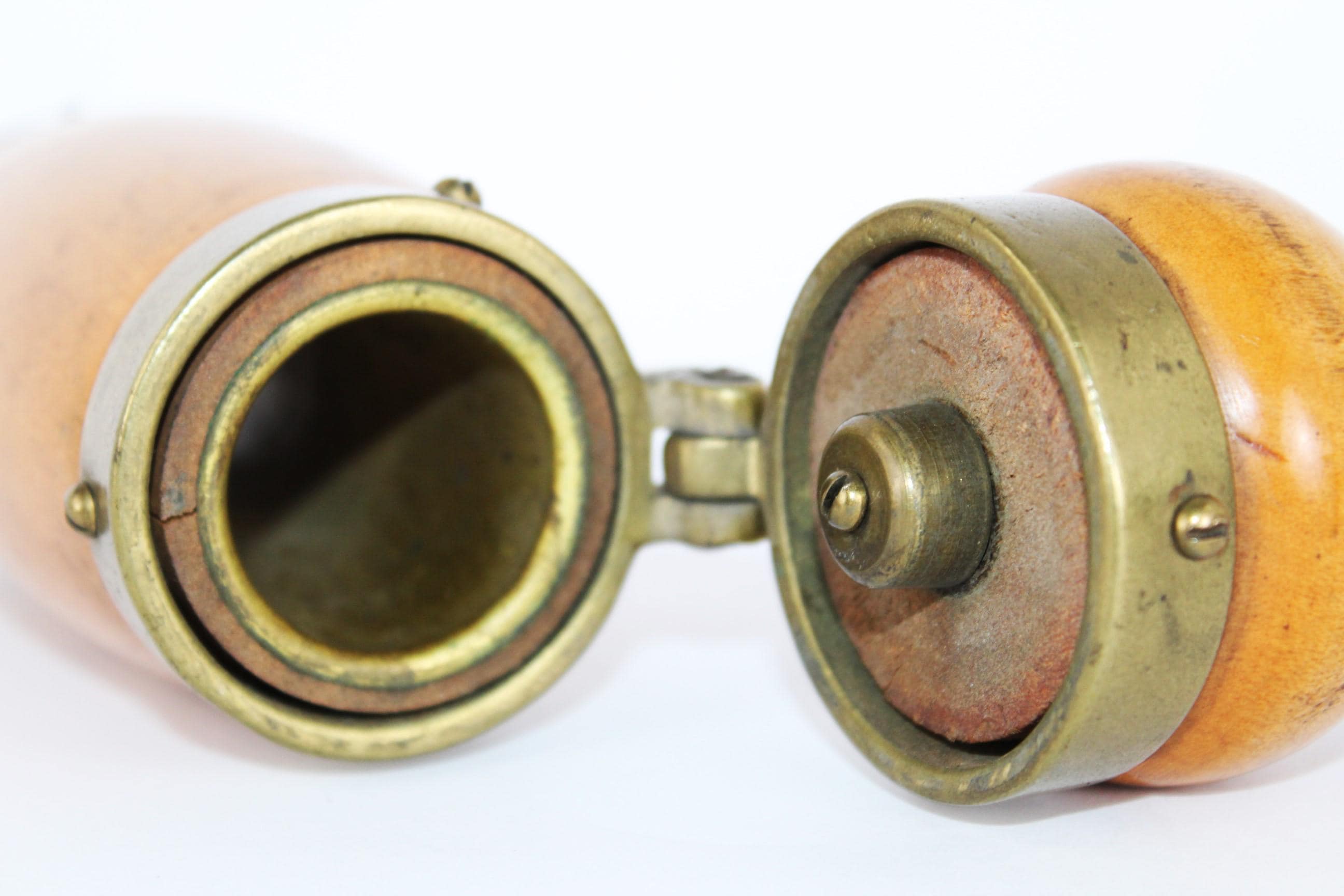 Wonderful find, this mid-to-late 1800s Bottle Corker, made of hardwood and brass. Pull the handle upward to hinge the corker open. The corker is lined with a brass sleeve and brass collars, driving rod has a brass-covered tip.