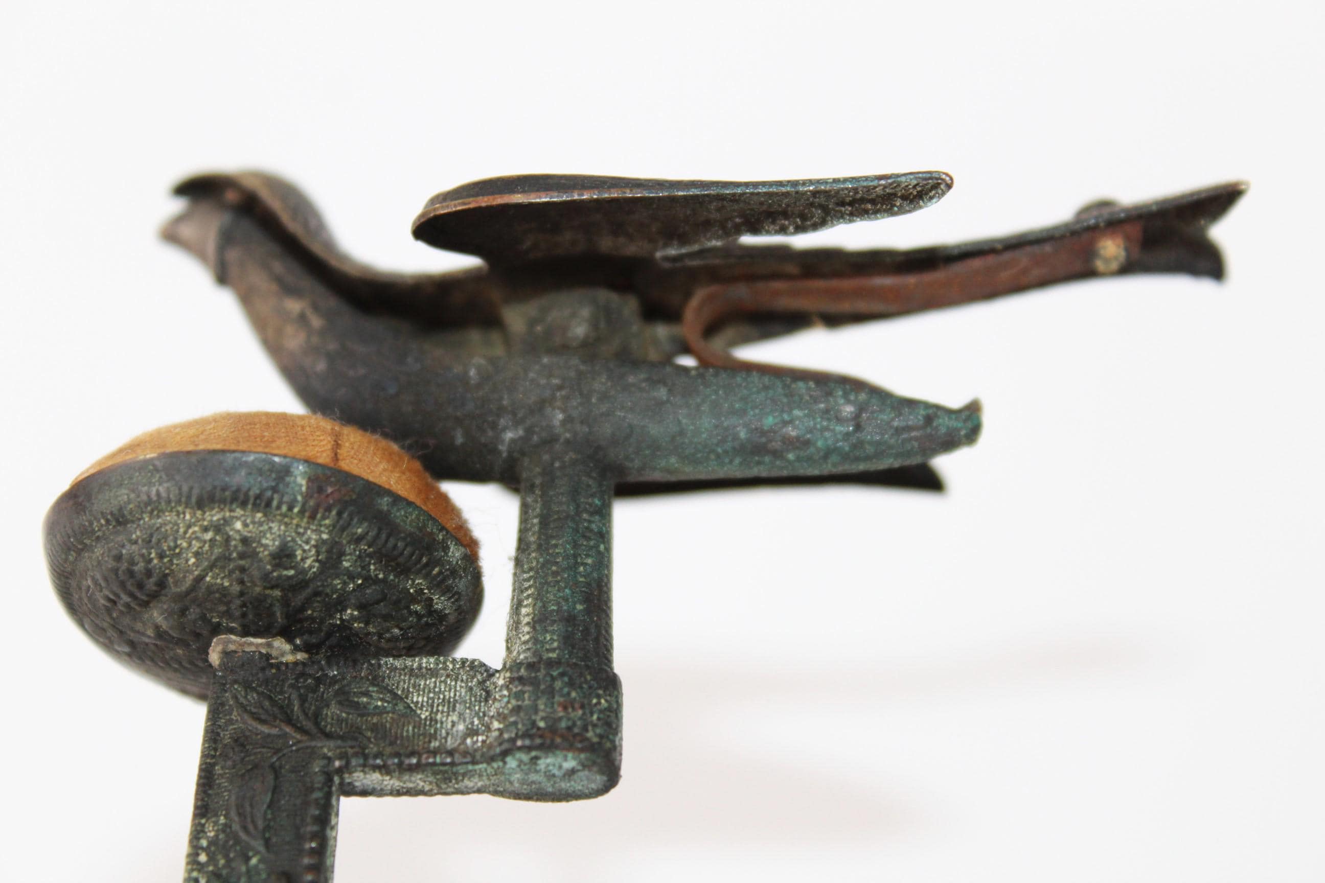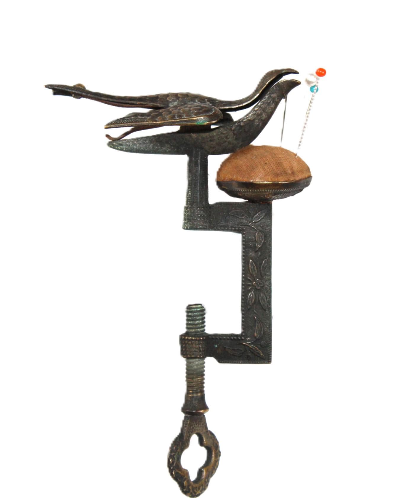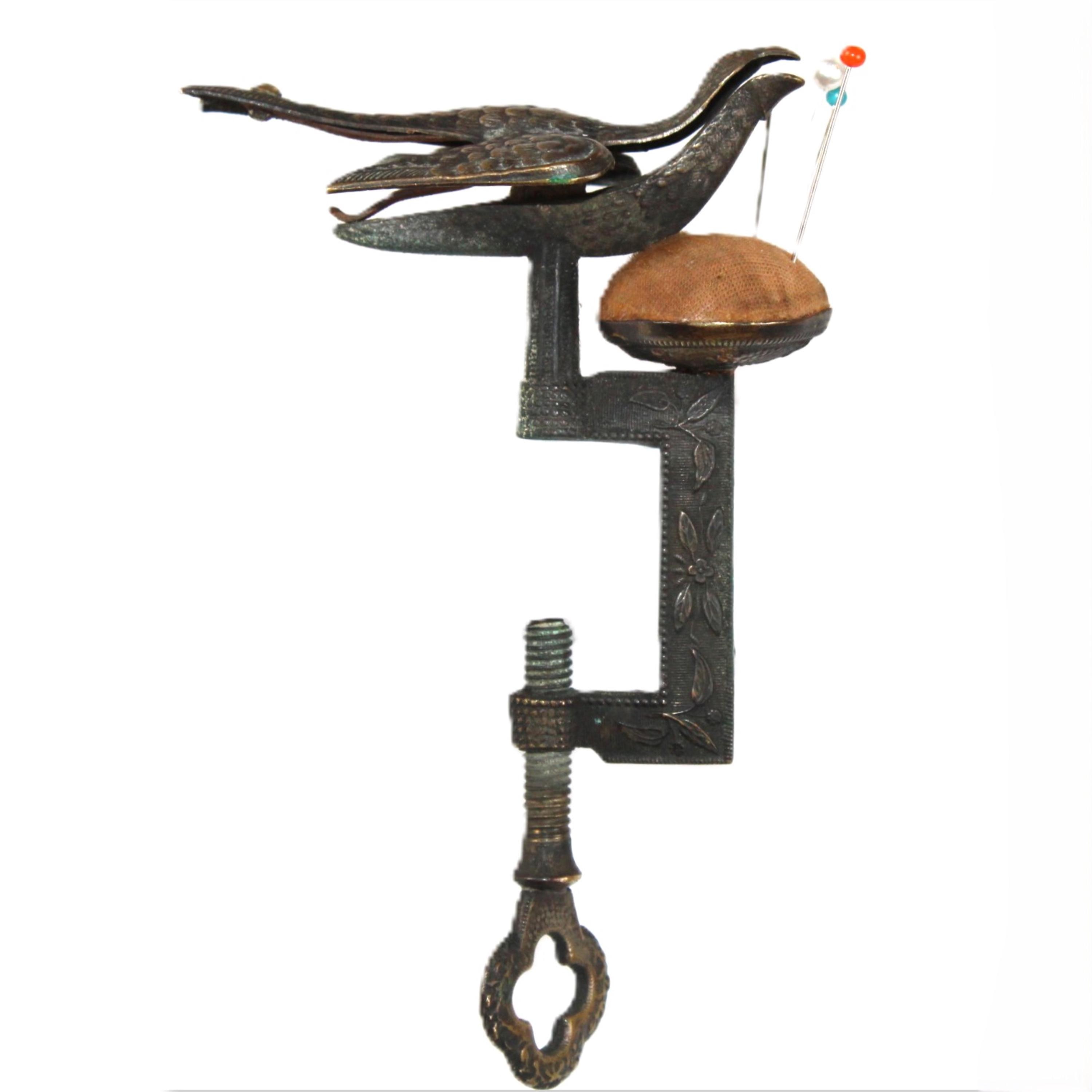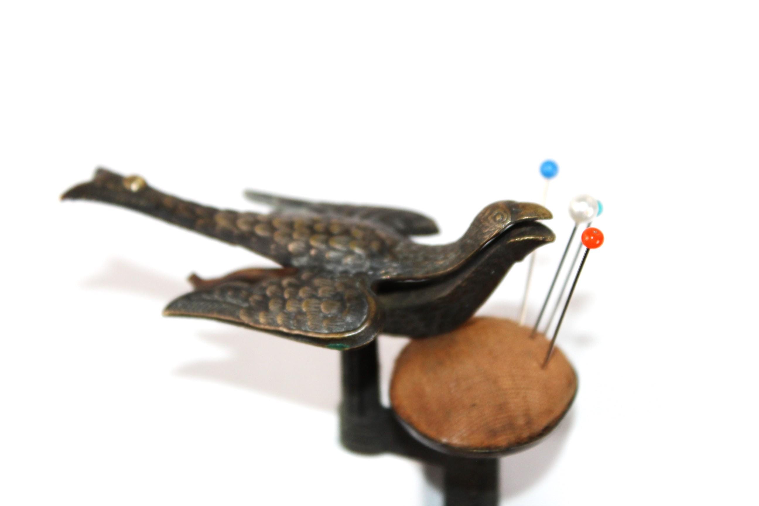 wonderful find, this antique sewing bird pin cushion that clamps onto the edge of a table or work surface. Made of brass, the bird itself measures approximately 3" long, 1½” wide, and 1¼” tall. Overall height is approximately 5” tall.